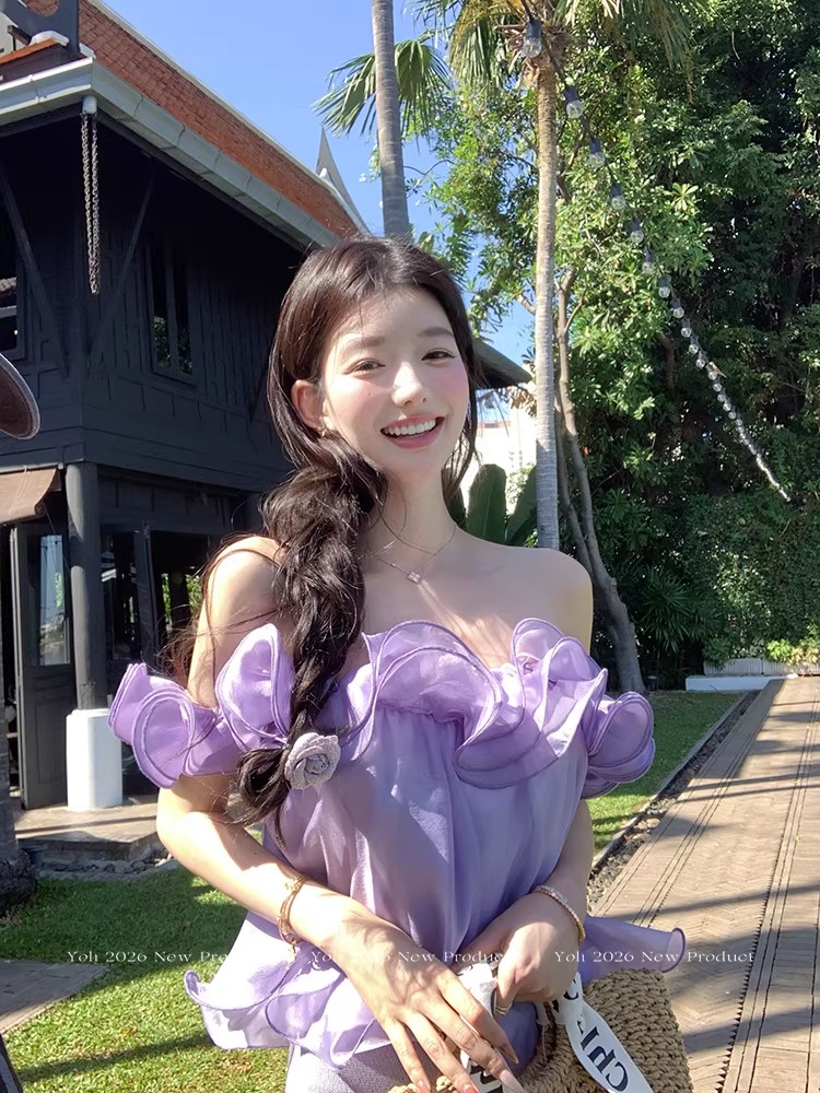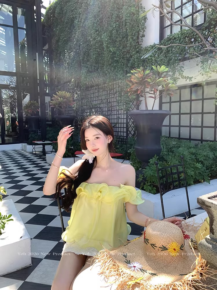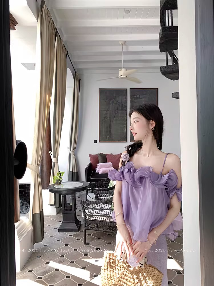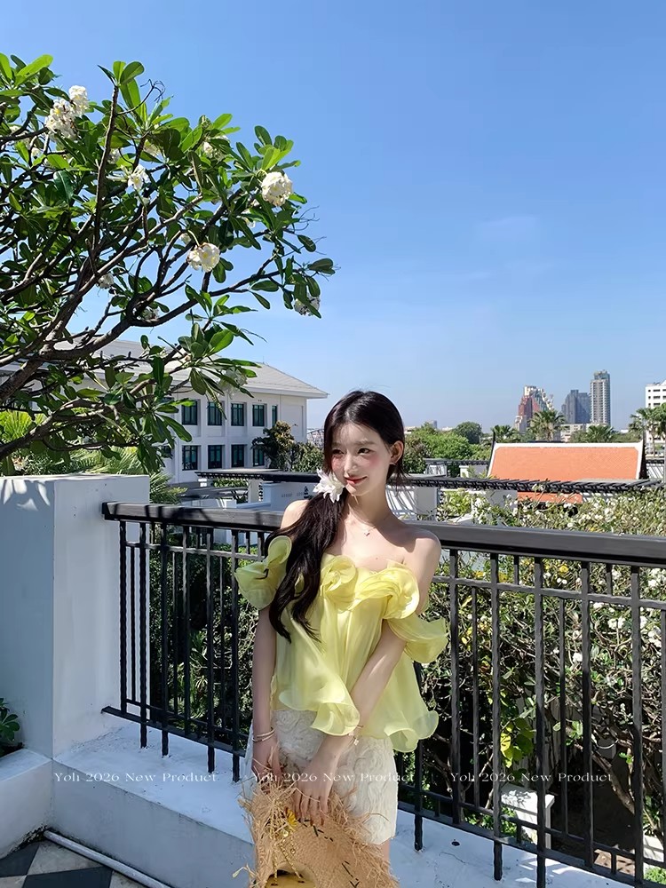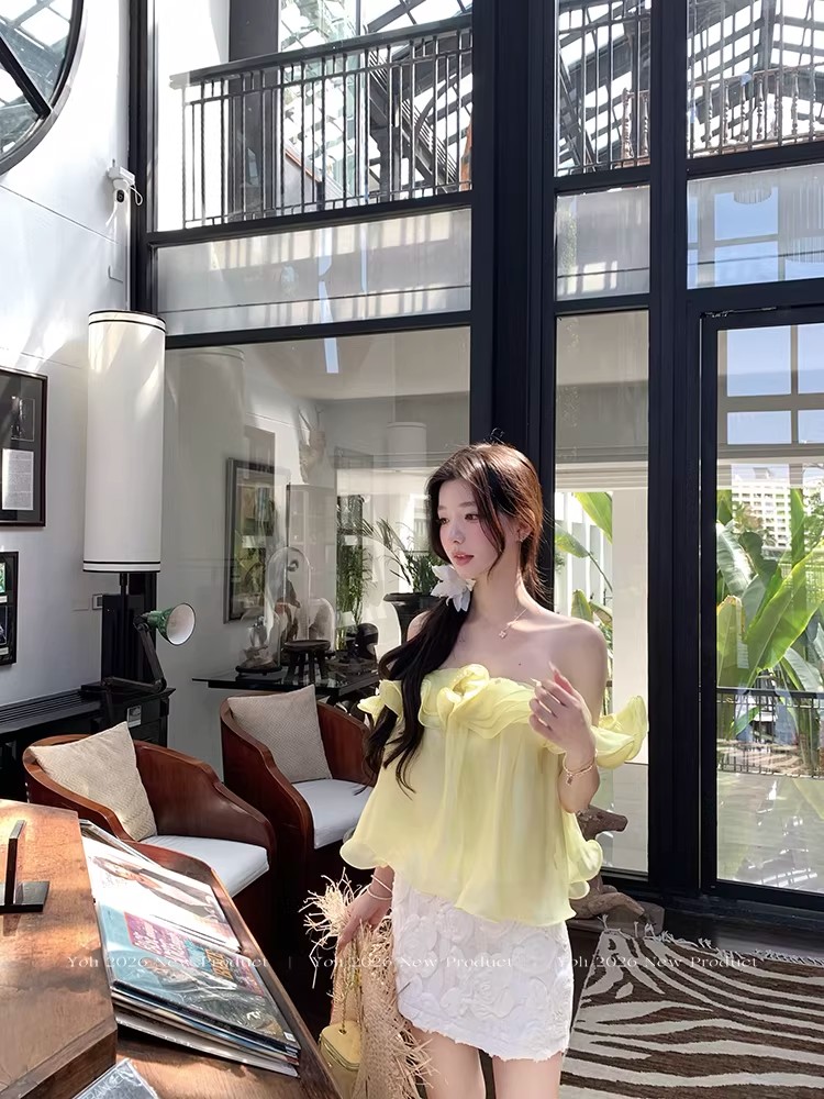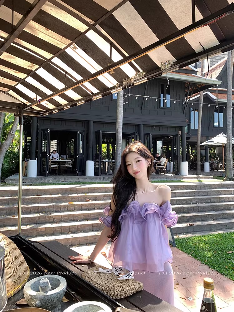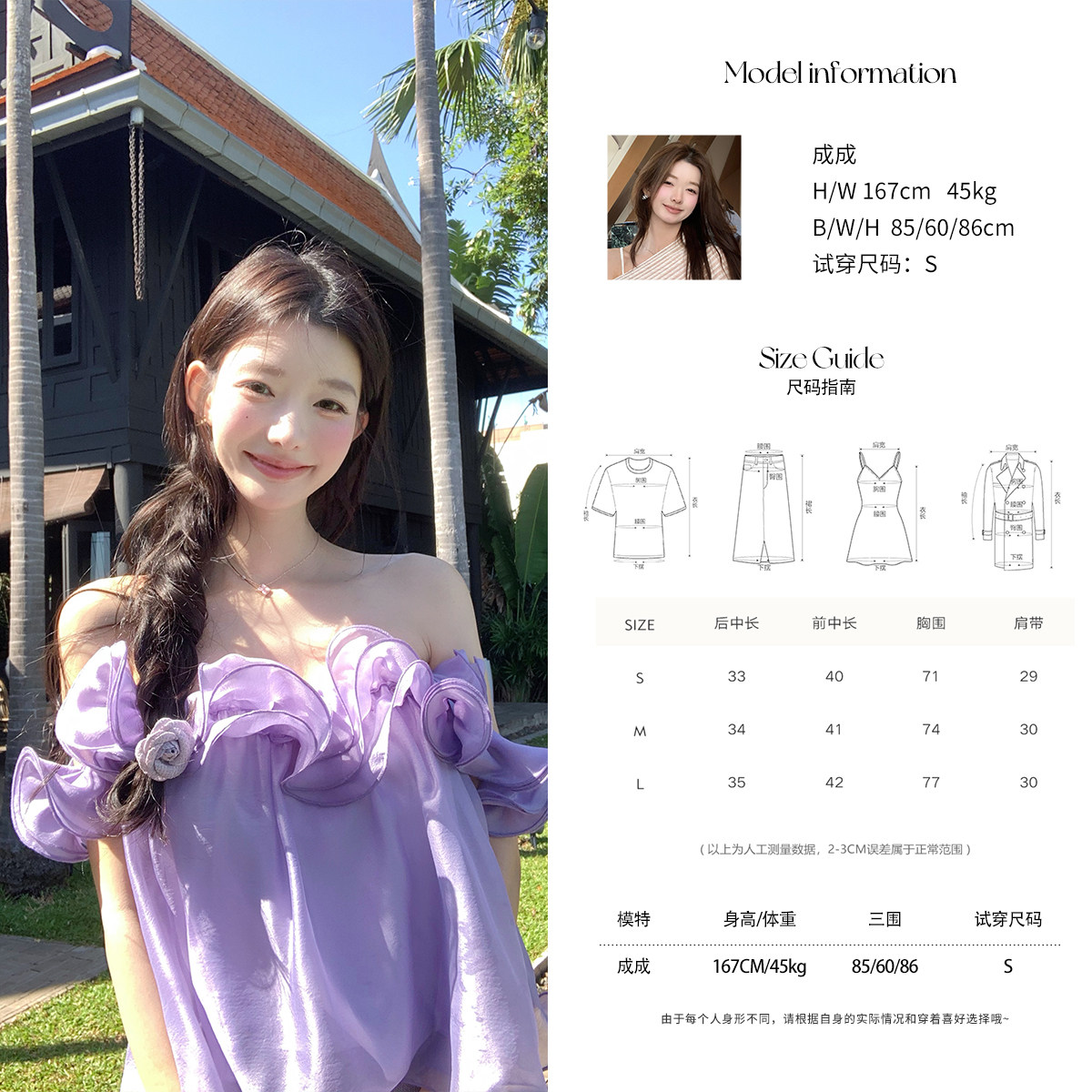 다우 시시 주간 맑은 하늘 분말 꽃잎 원 웨이 비스듬한 襟 레이스 조각 새로운 중식 맨위 여름 출퇴근 패션 세트