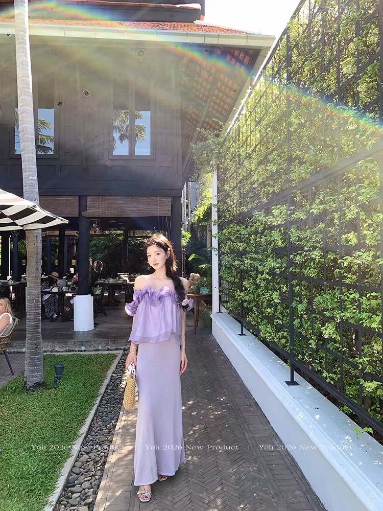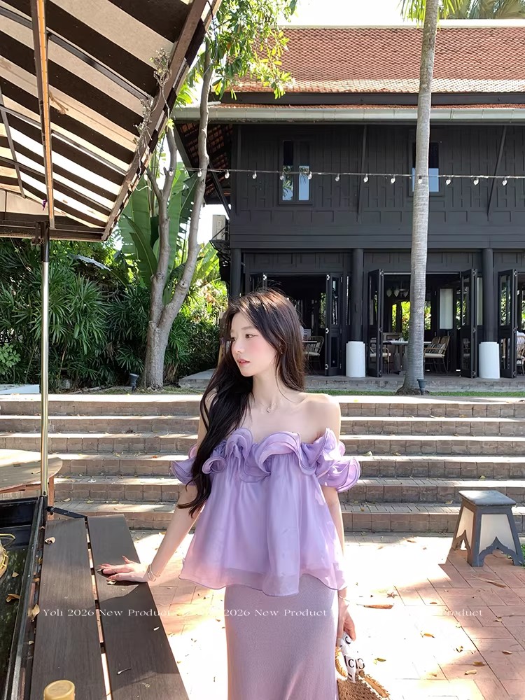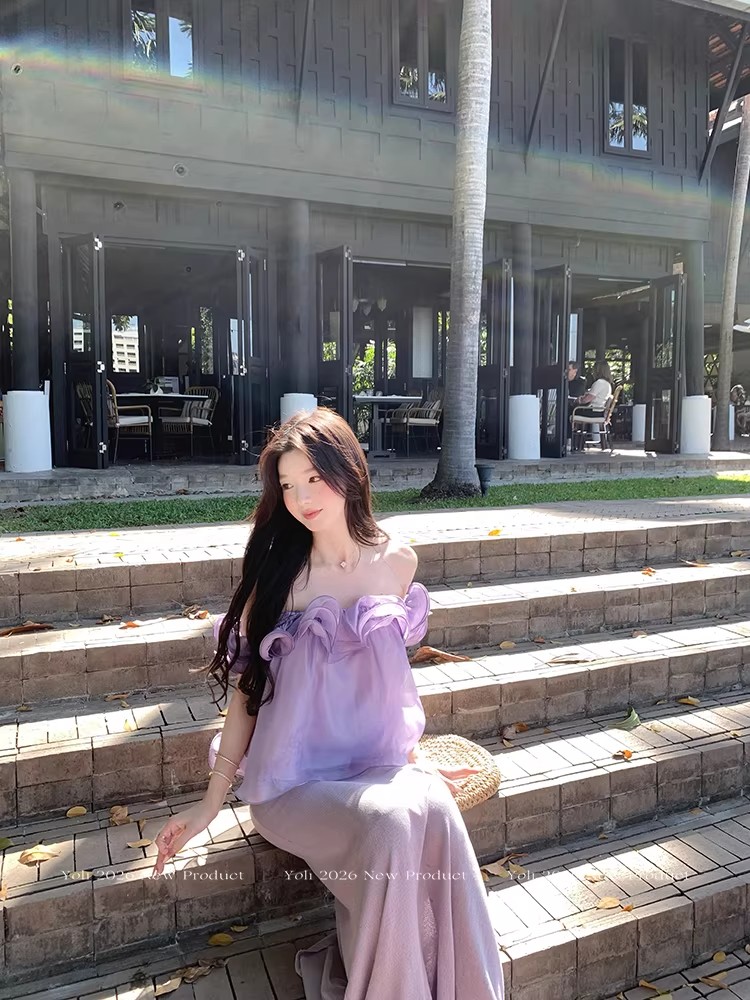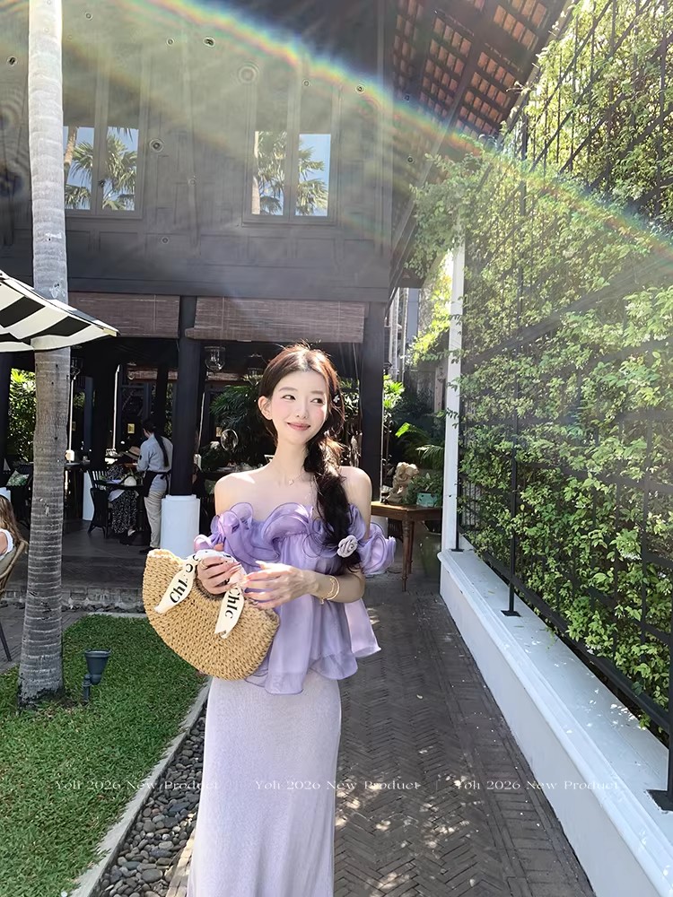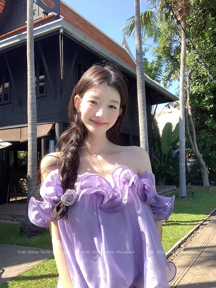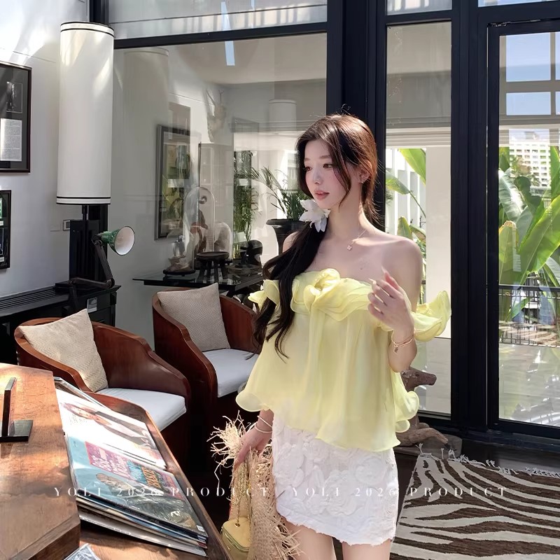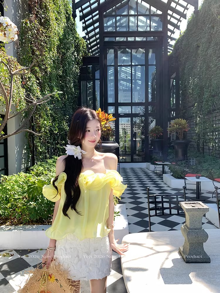 다우 시시 주간 맑은 하늘 분말 꽃잎 원 웨이 비스듬한 襟 레이스 조각 새로운 중식 맨위 여름 출퇴근 패션 세트