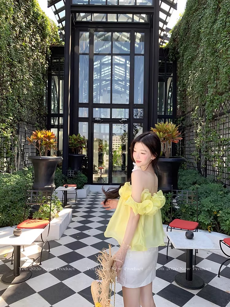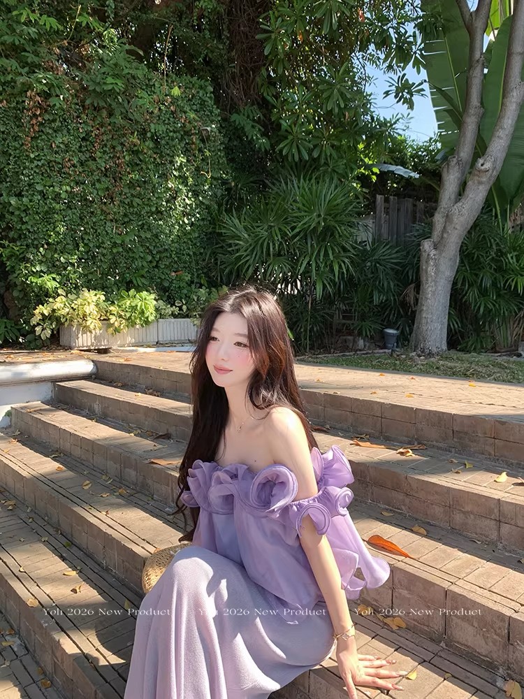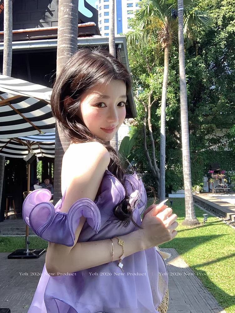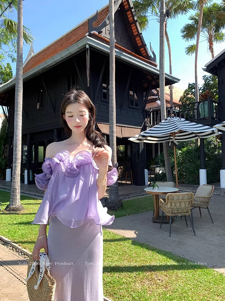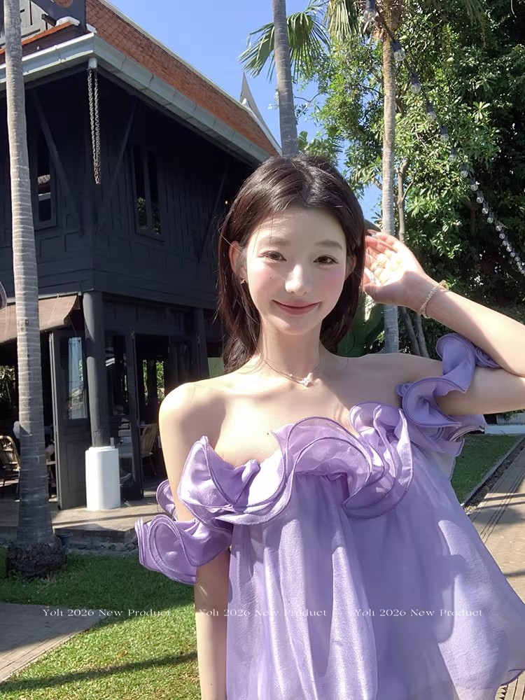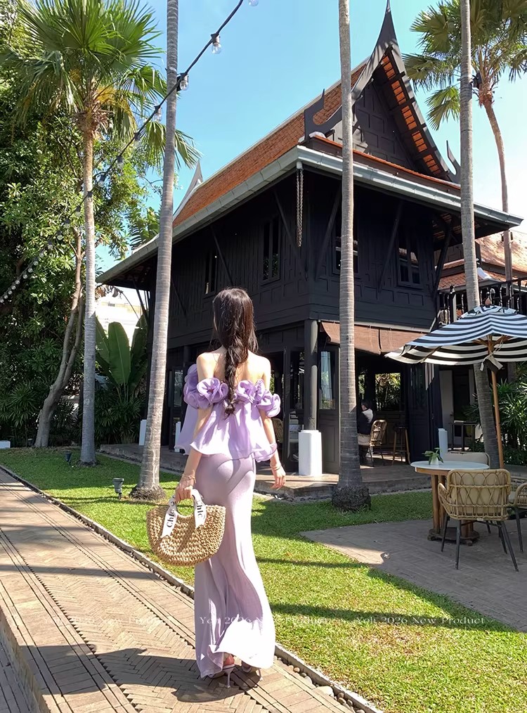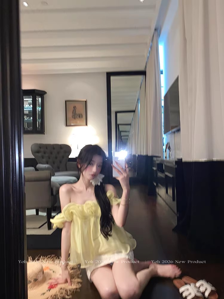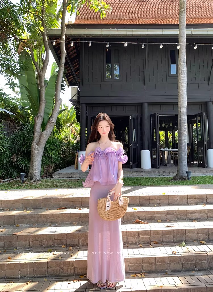 다우 시시 주간 맑은 하늘 분말 꽃잎 원 웨이 비스듬한 襟 레이스 조각 새로운 중식 맨위 여름 출퇴근 패션 세트
