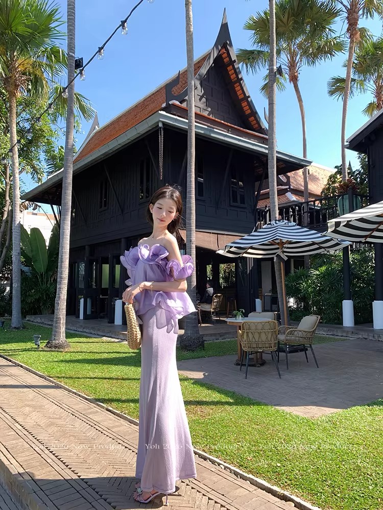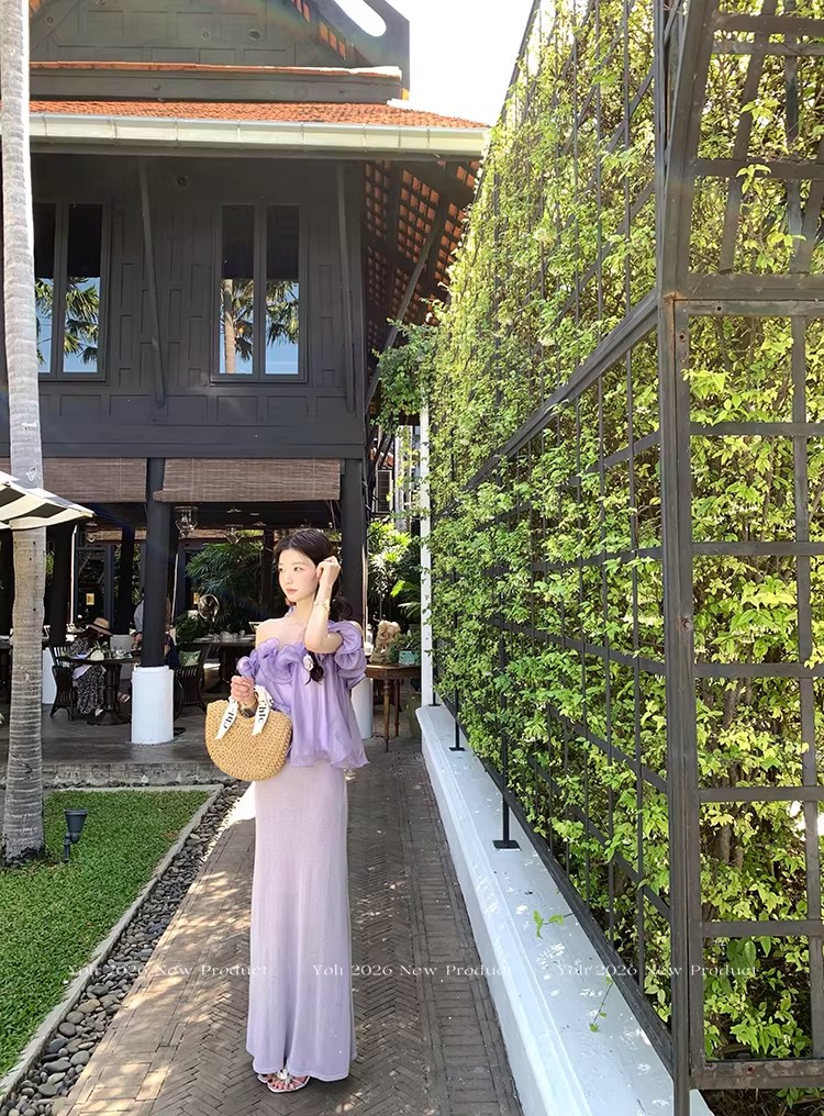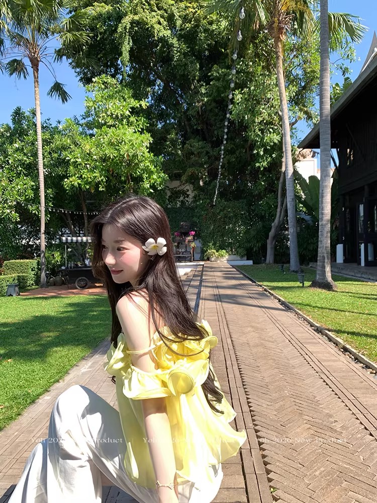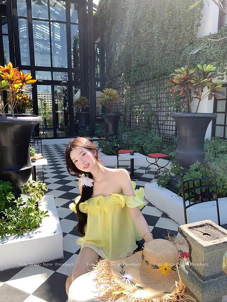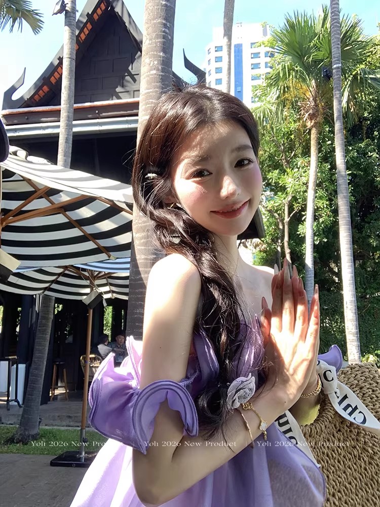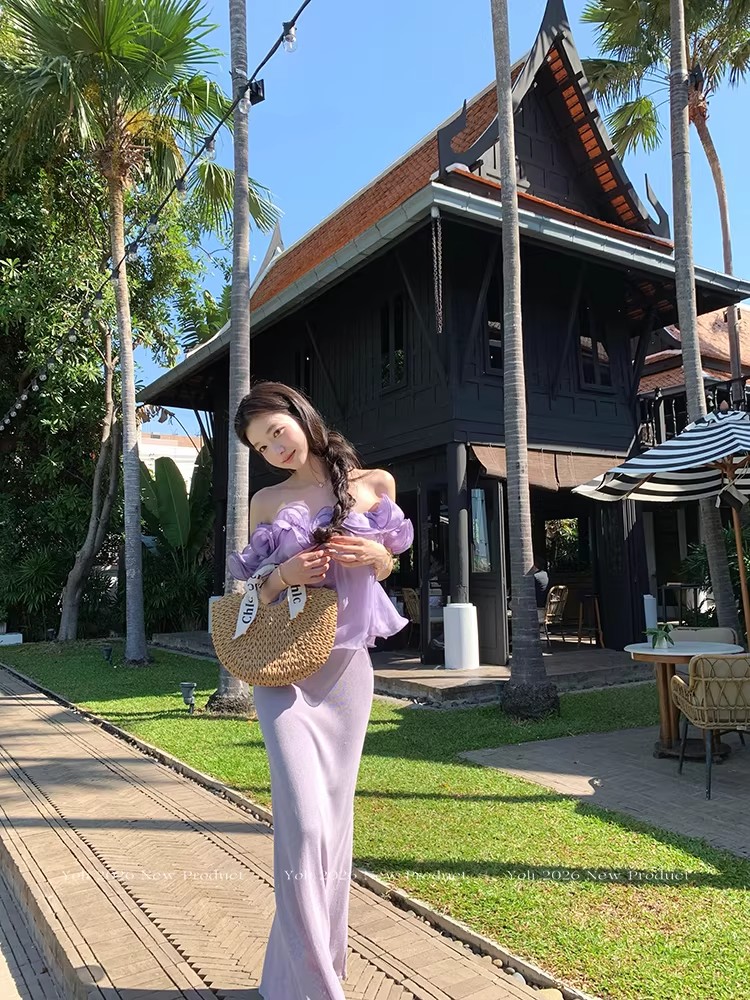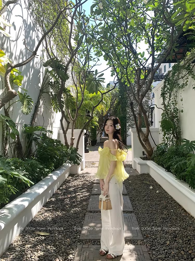 다우 시시 주간 맑은 하늘 분말 꽃잎 원 웨이 비스듬한 襟 레이스 조각 새로운 중식 맨위 여름 출퇴근 패션 세트
