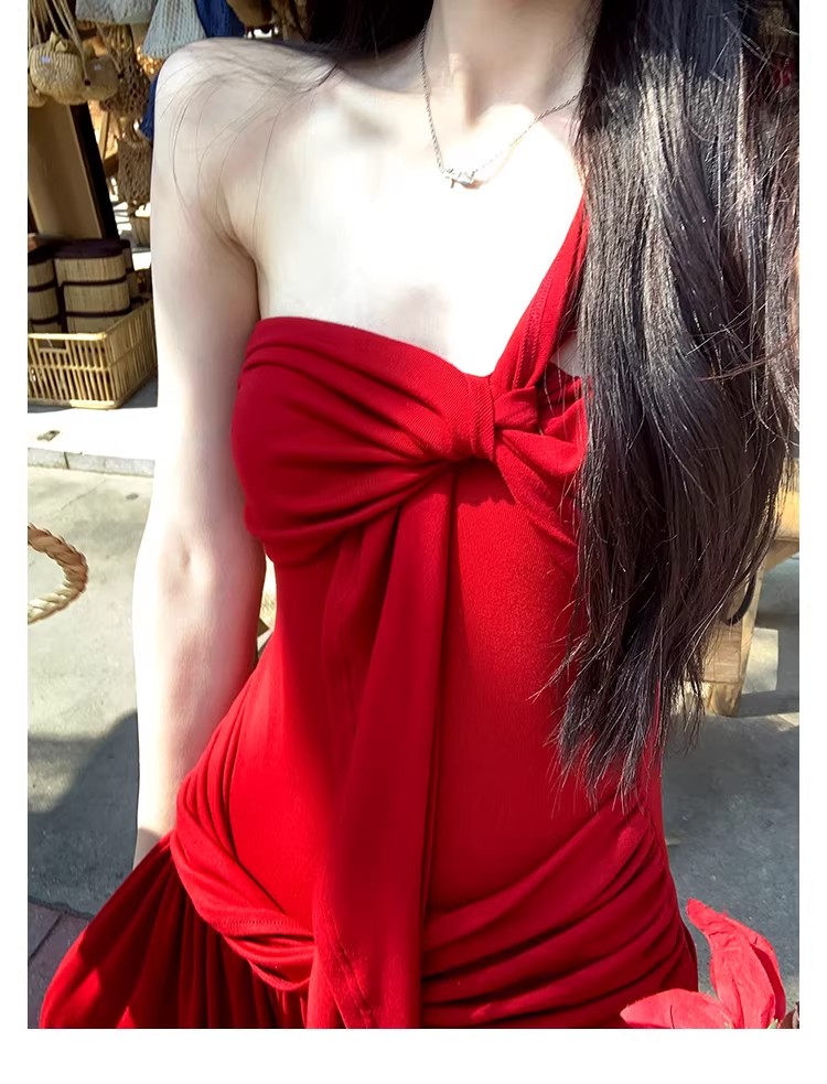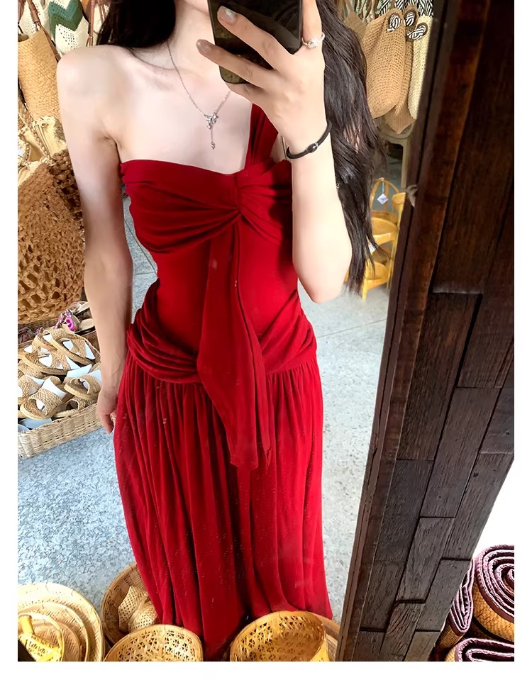 회화 솔루션 wahju 별 비밀 오프숄더 나비 매듭 꽃 꾸밈음 디자인 허리 수축 슬림해 보이는 드레스 봄