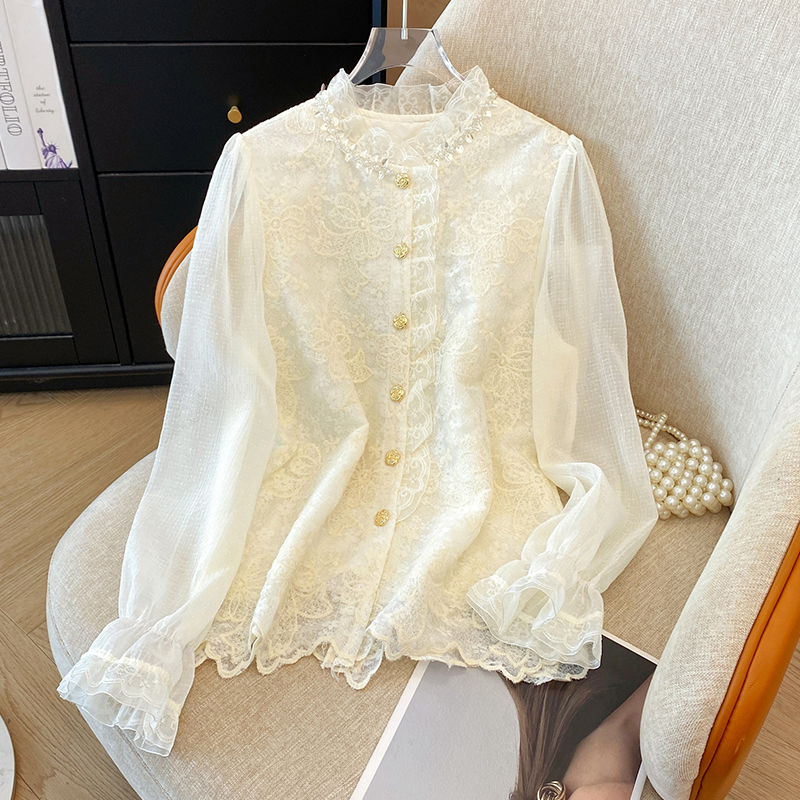품격 레이스 레이스 비즈 박기 자수 긴팔 여성 셔츠 2025 이른 가을 새로운 외국 가스 달콤함 기본 셔츠 맨위