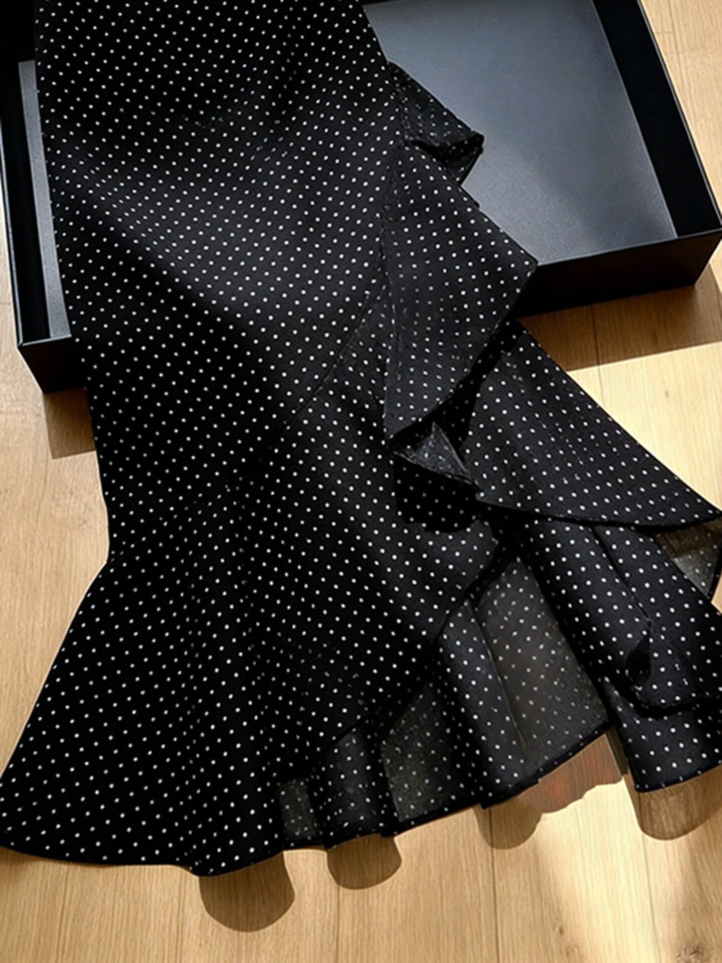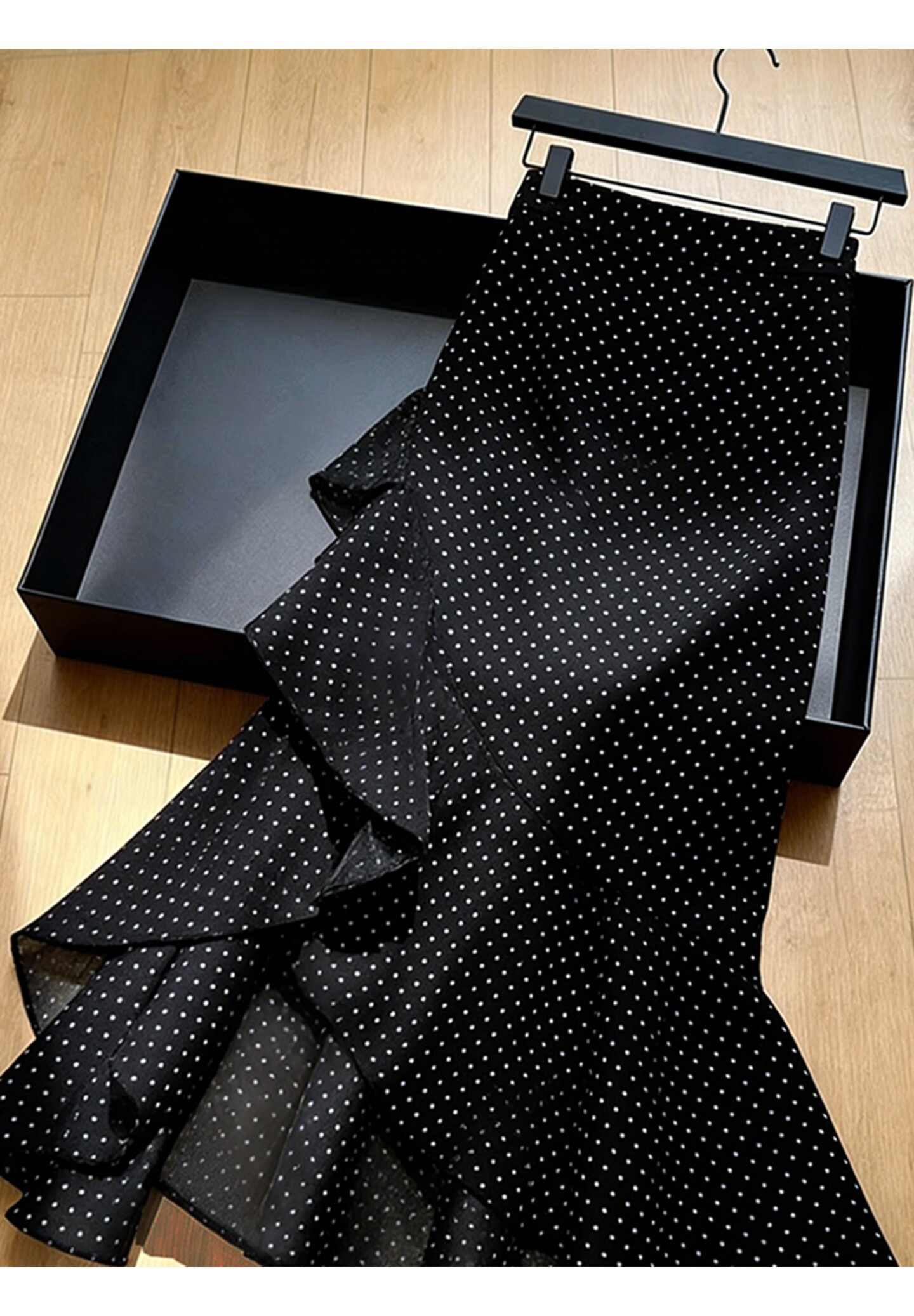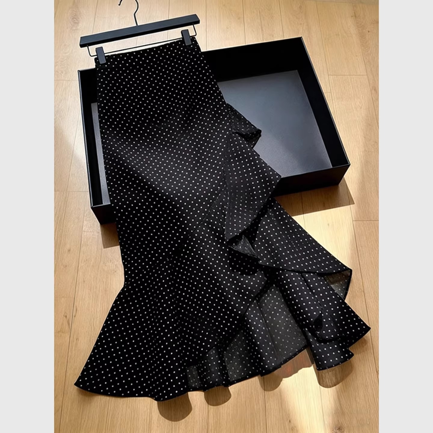 2026 봄 새로운 고급 프랑스식 사소한 고유 한 디자인 센스 프릴 불규칙 검정색 도트 무늬 반신 스커트