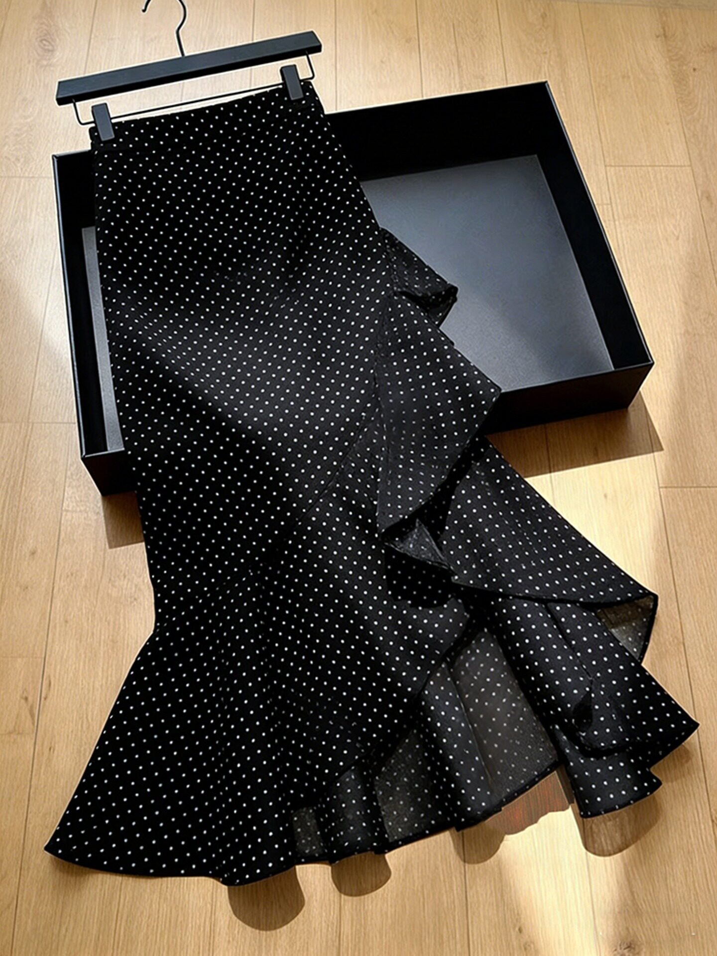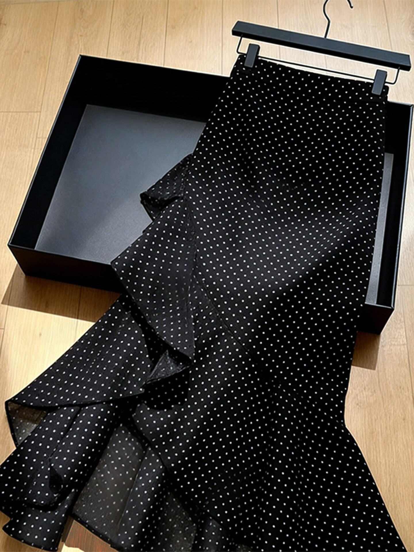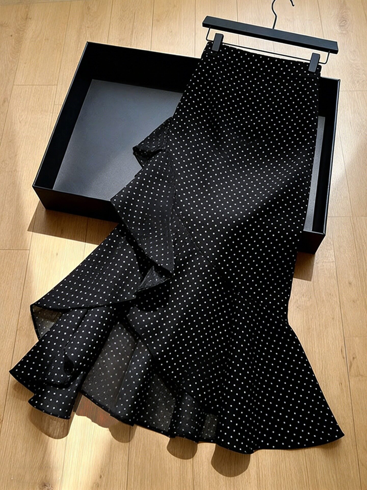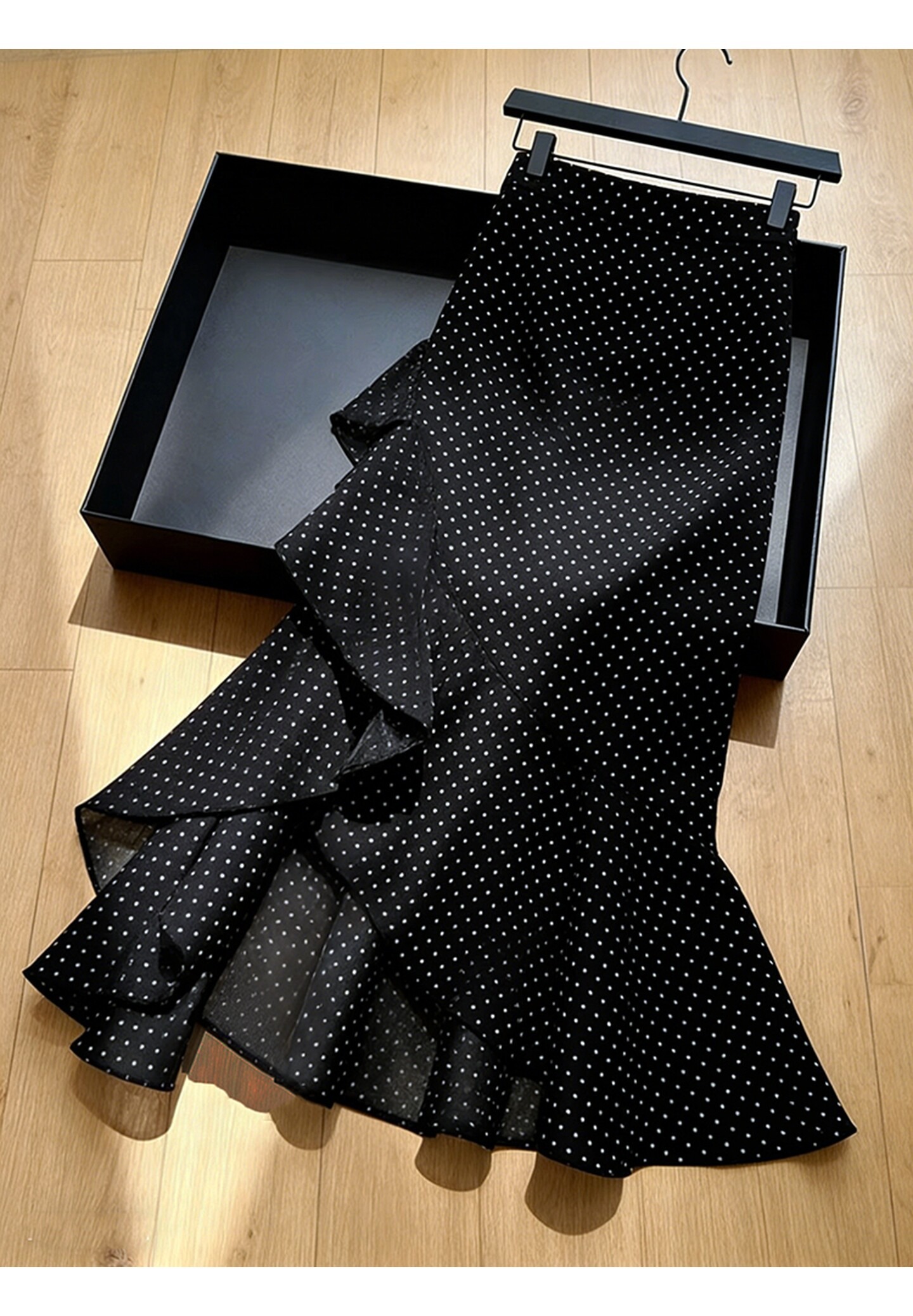 2026 봄 새로운 고급 프랑스식 사소한 고유 한 디자인 센스 프릴 불규칙 검정색 도트 무늬 반신 스커트