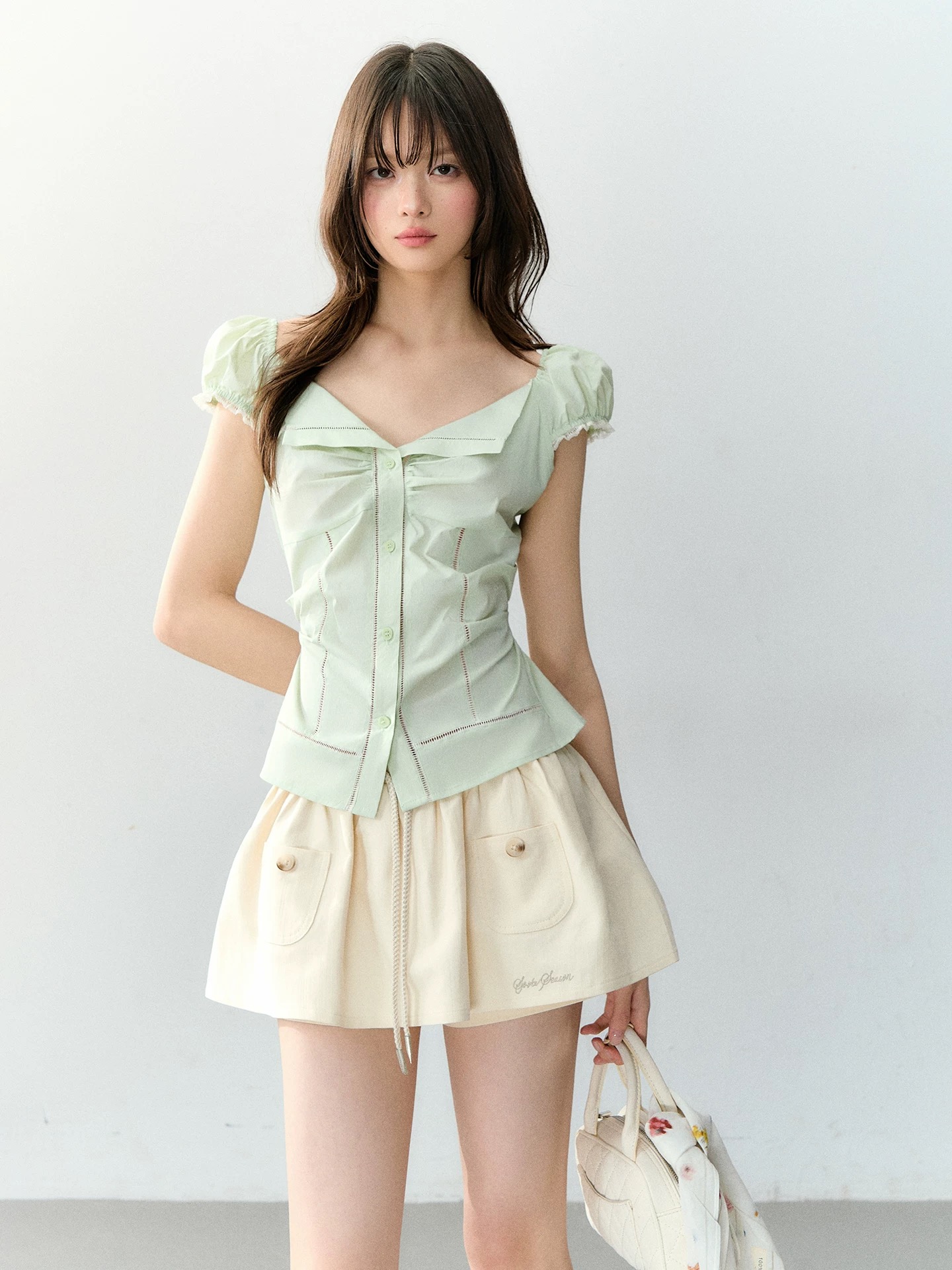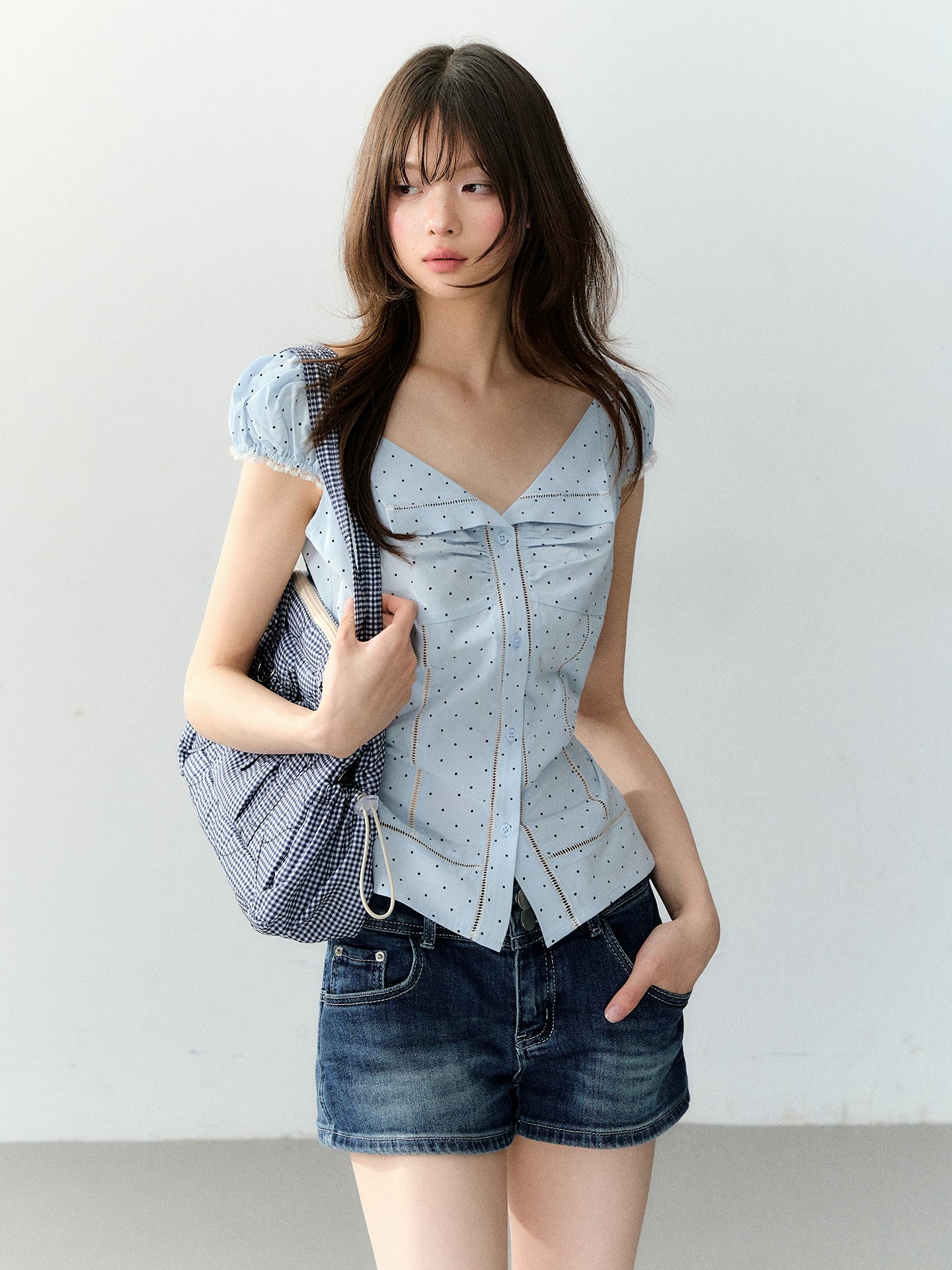 soote season 오리지널 한 부서 도트 무늬 폴로 칼라 주간 실크 허리 수축 스트랩 레이스 거품 소매 셔츠 반팔