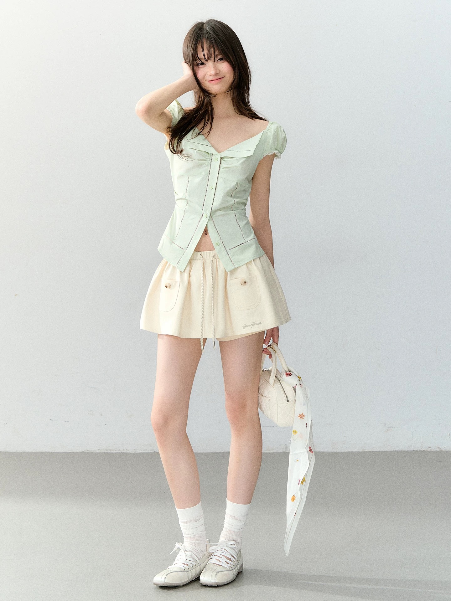 qdqd 달콤한 차가운 학원 스타일 세트 레트로 베이비 칼라 허리 수축 반팔 셔츠 소녀 센스 케이크 미니 스커트 여름