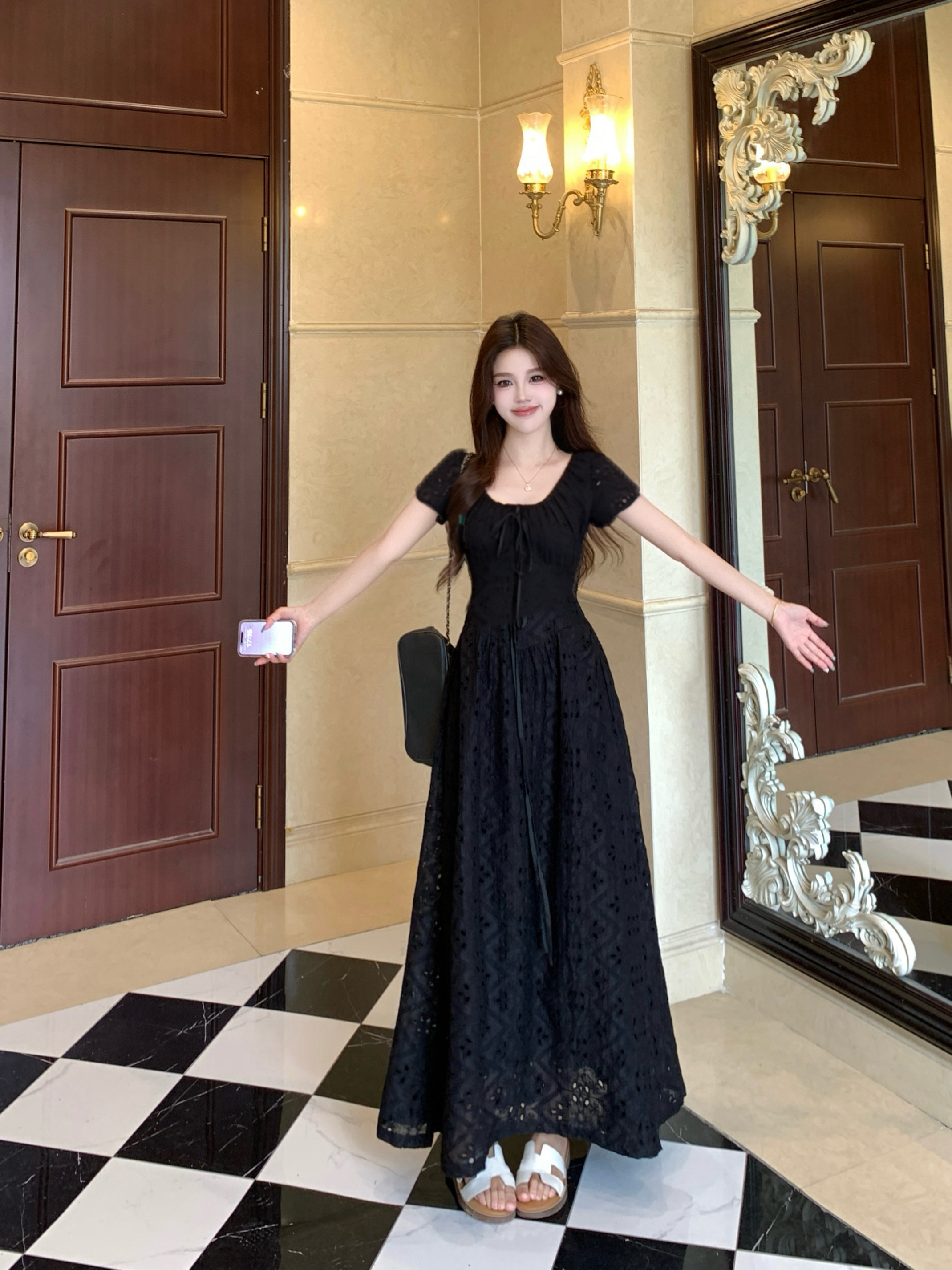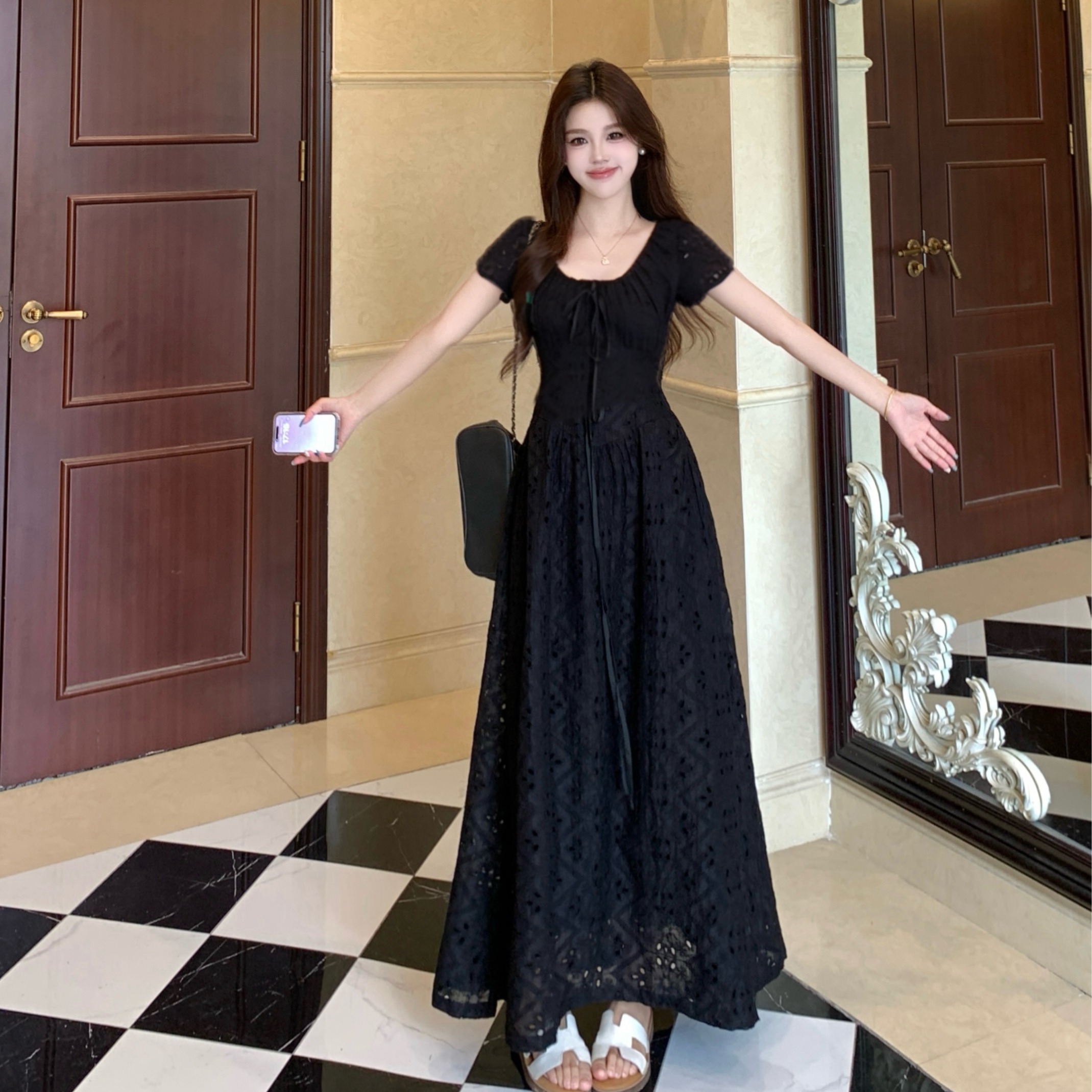 빅 사이즈 여성 의류 프랑스식 차 휴식 바람 빨간색 광장 칼라 단색 롱 스커트 가스 질감 허리 수축 쇼트 스타일 슬림해 보이는 여성 드레스