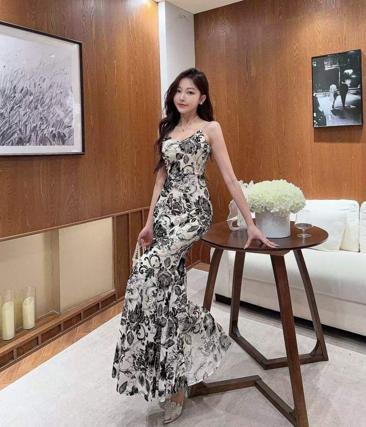 실사 섹시함 로얄 자매 바람 V넥 백리스 인어 꼬리 롱 스커트 여성 디자인 센스 몸매 가꾸기 슬림해 보이는 슬립 타이트 스커트 드레스