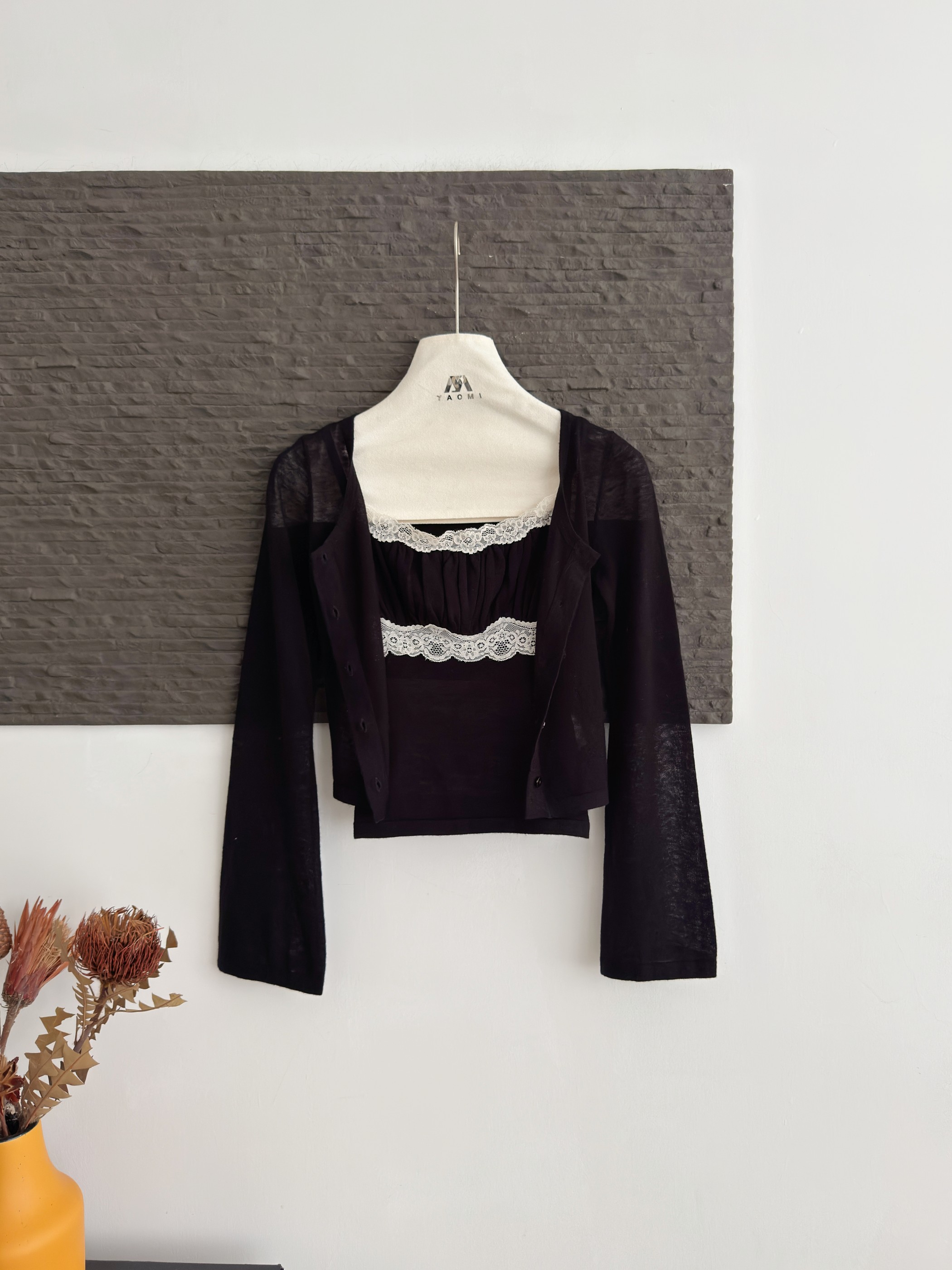 okmashop 여름 작은 흰색 꽃 니트 세트 여성 봄 여름 오프숄더 맨위 플리츠 스커트 투피스 세트