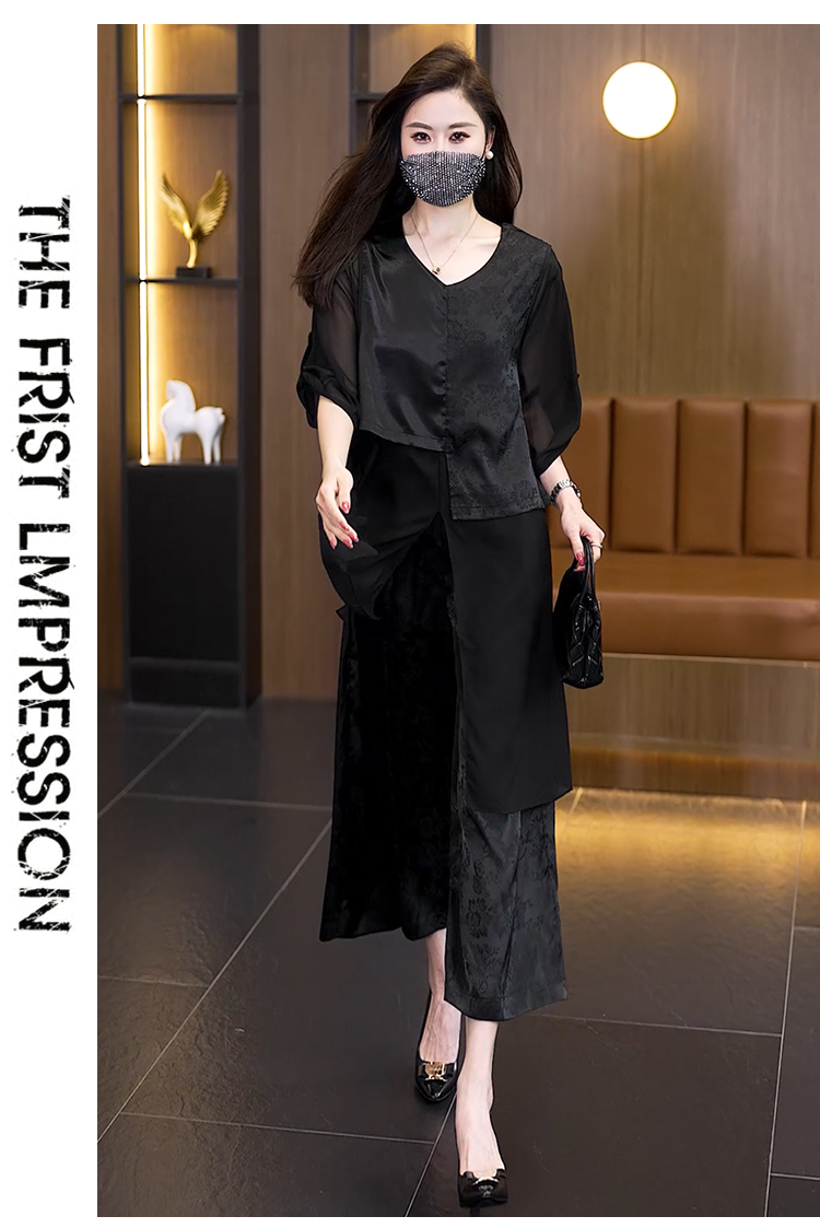 실사 빅 사이즈 여성 의류 2026 여름 새로운 검정색 셔츠 와이드 레그 팬츠 투피스 세트 표지 고기 슬림해 보이는 품격 세트