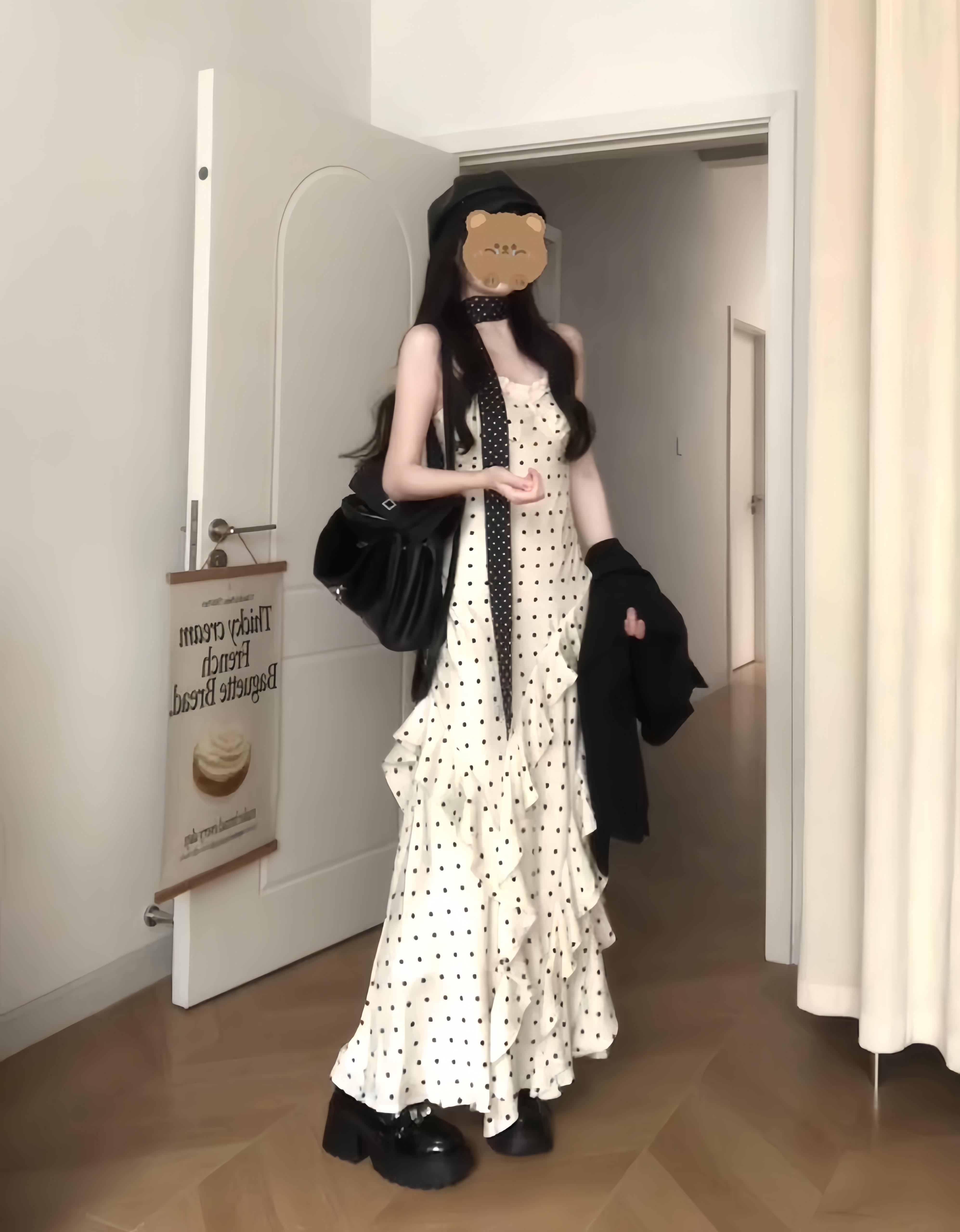 작은 꽃 nana 프랑스식 순수한 욕망 달콤함 도트 무늬 슬립 드레스 여름 휴가 바람 허리 수축 몸매 가꾸기 타이트 스커트 롱 스커트
