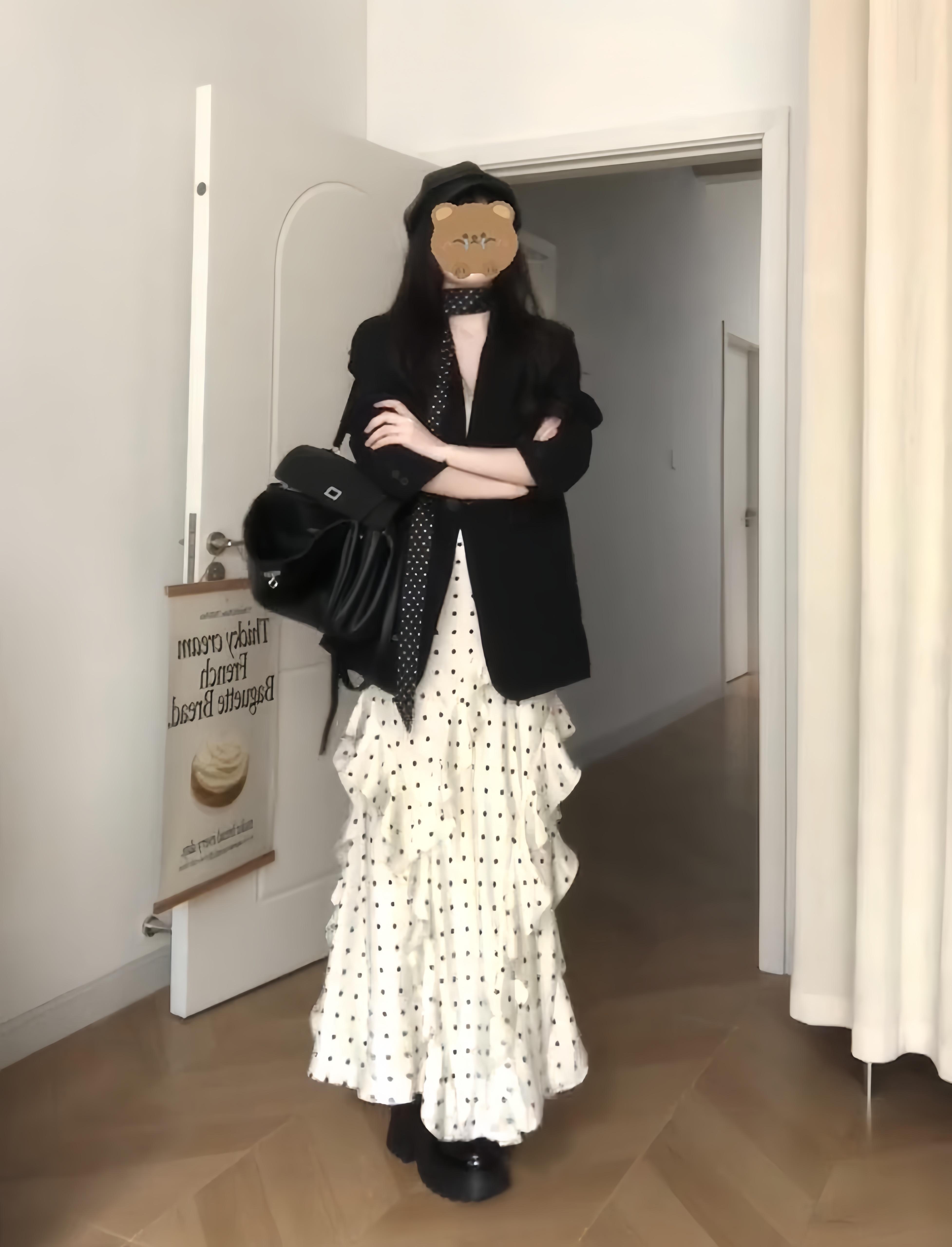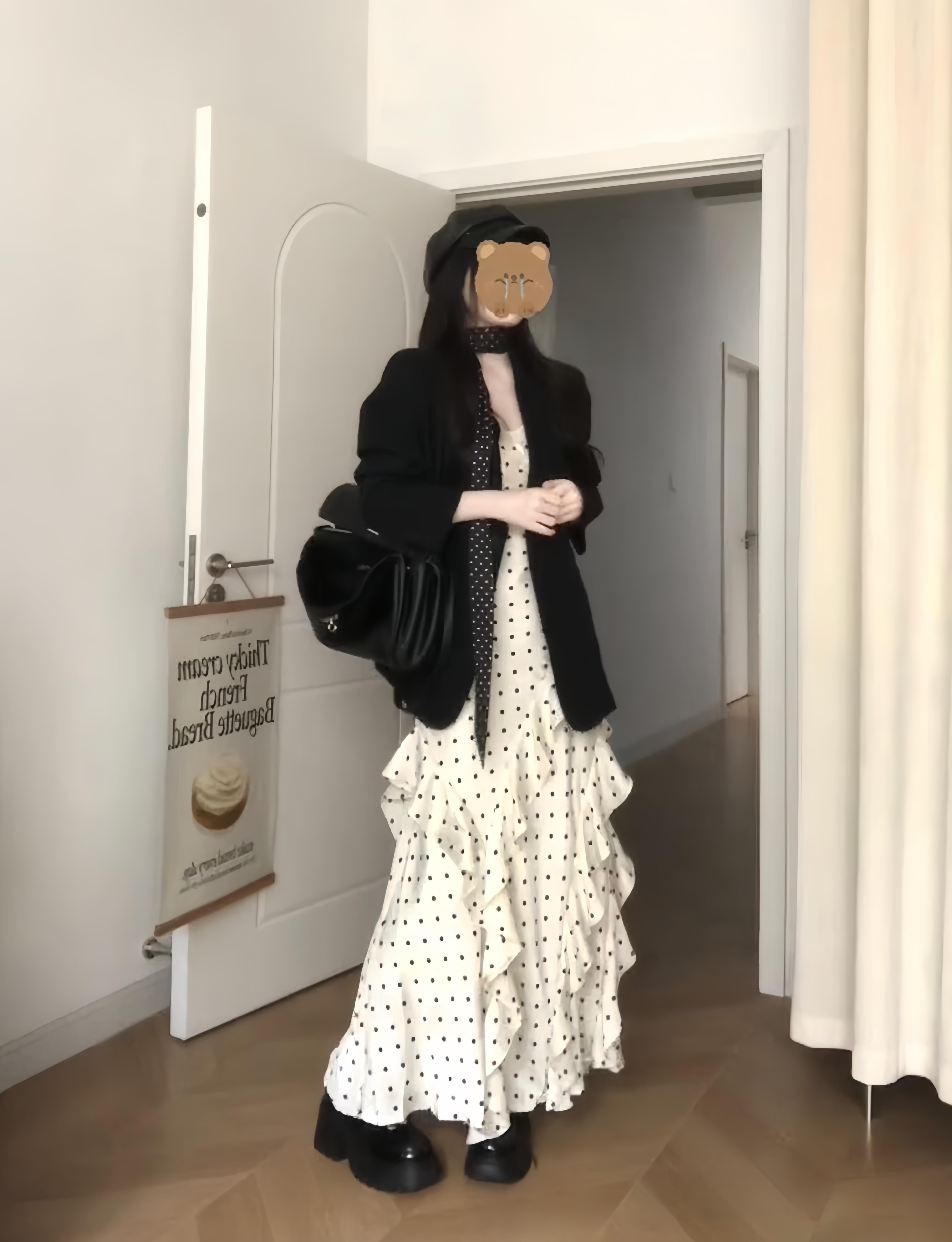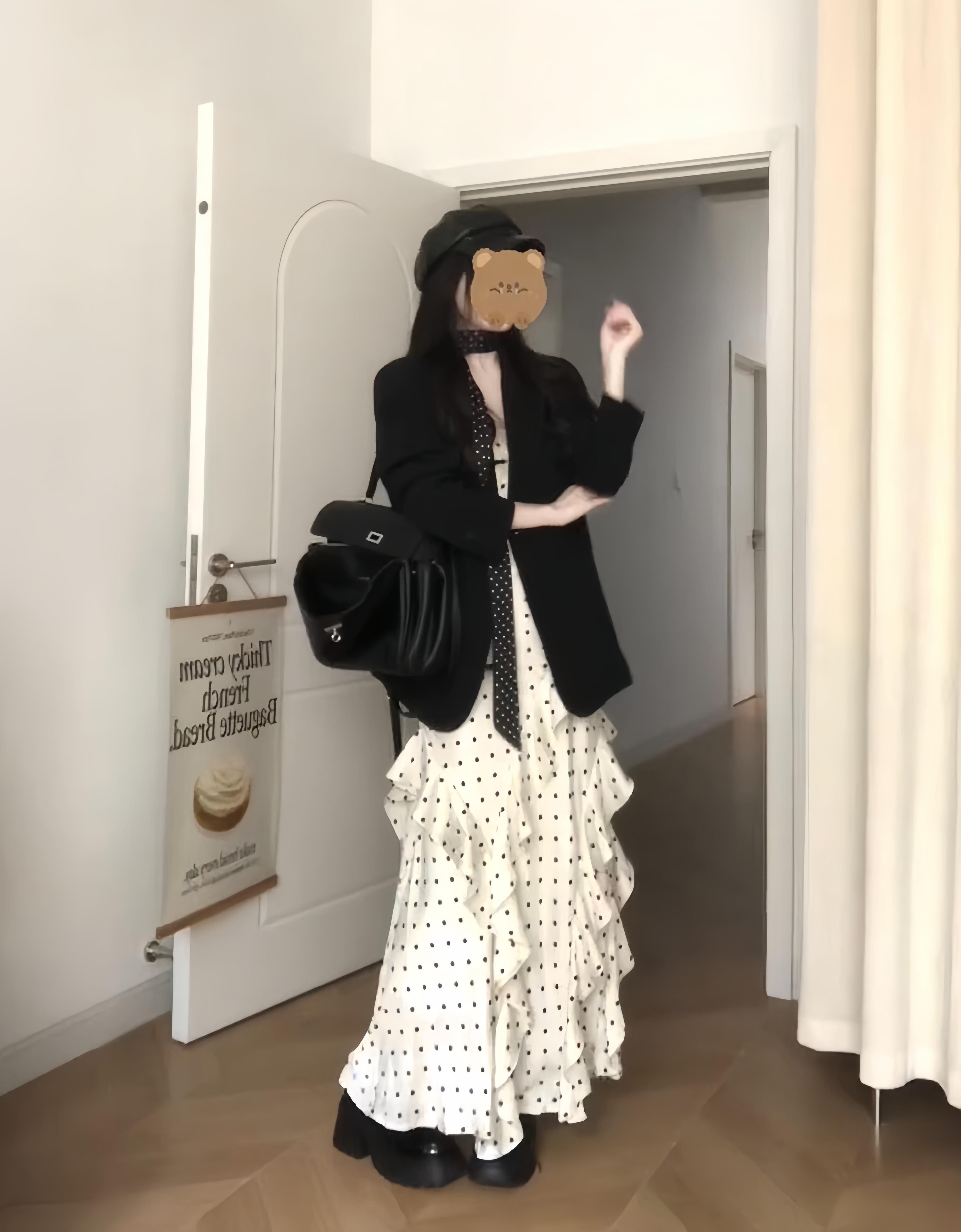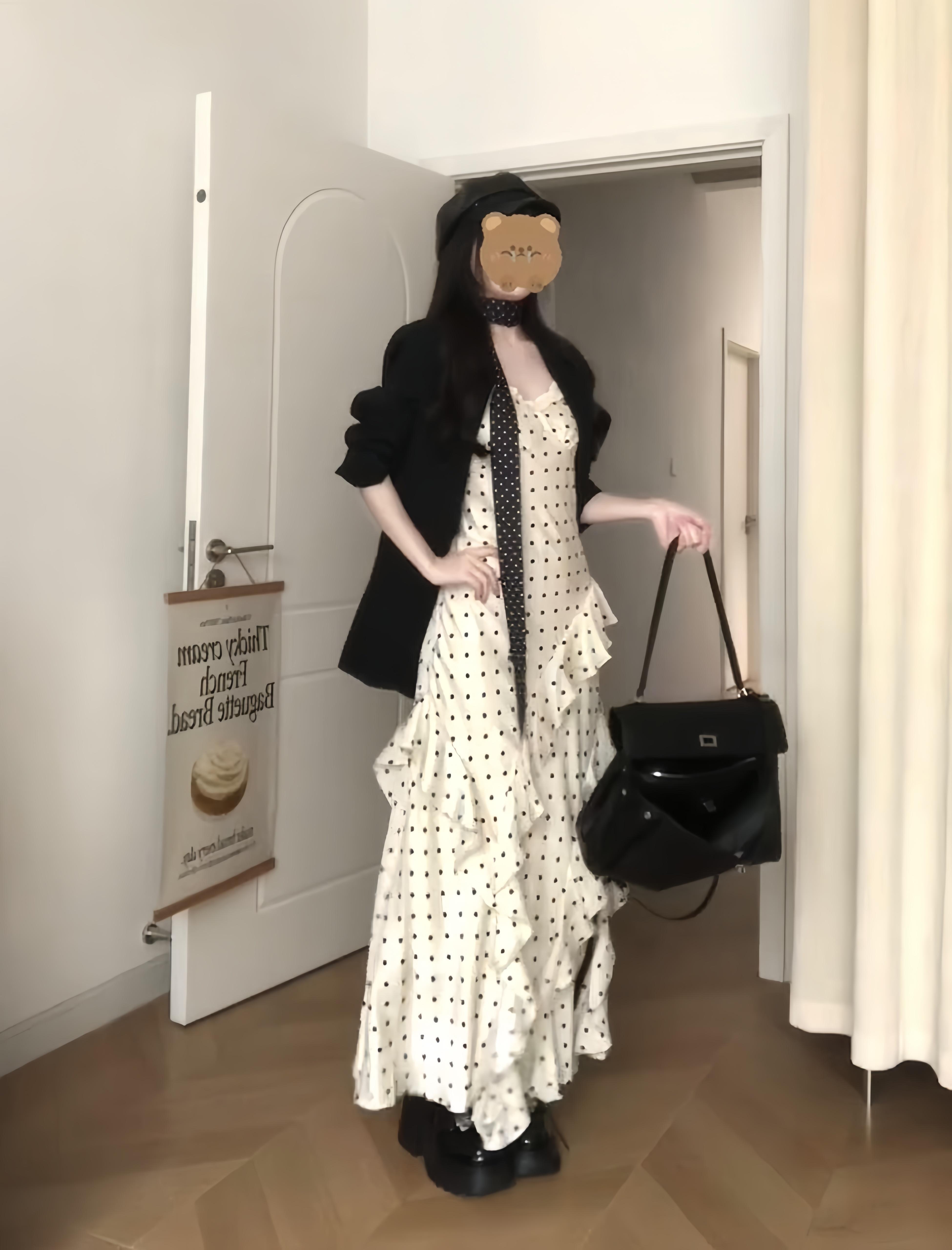 2026 이른 봄 새로운 캐주얼 고급 센스 검정색 정장 여성 코트 도트 무늬 프릴 드레스 투피스 세트