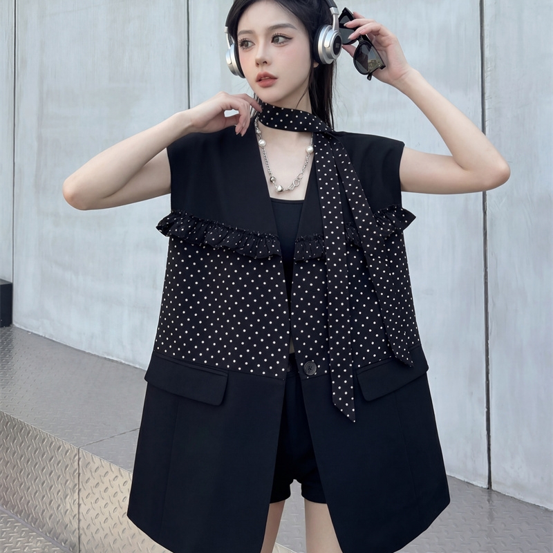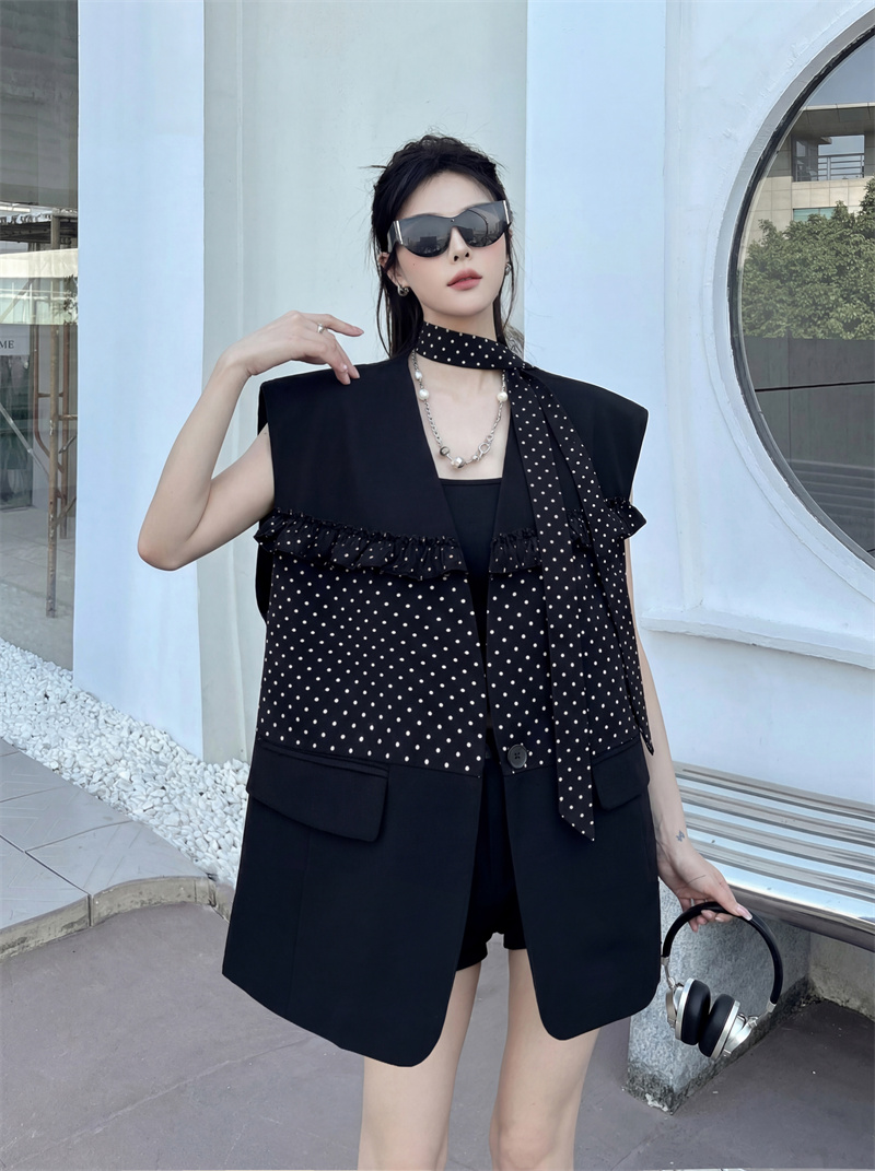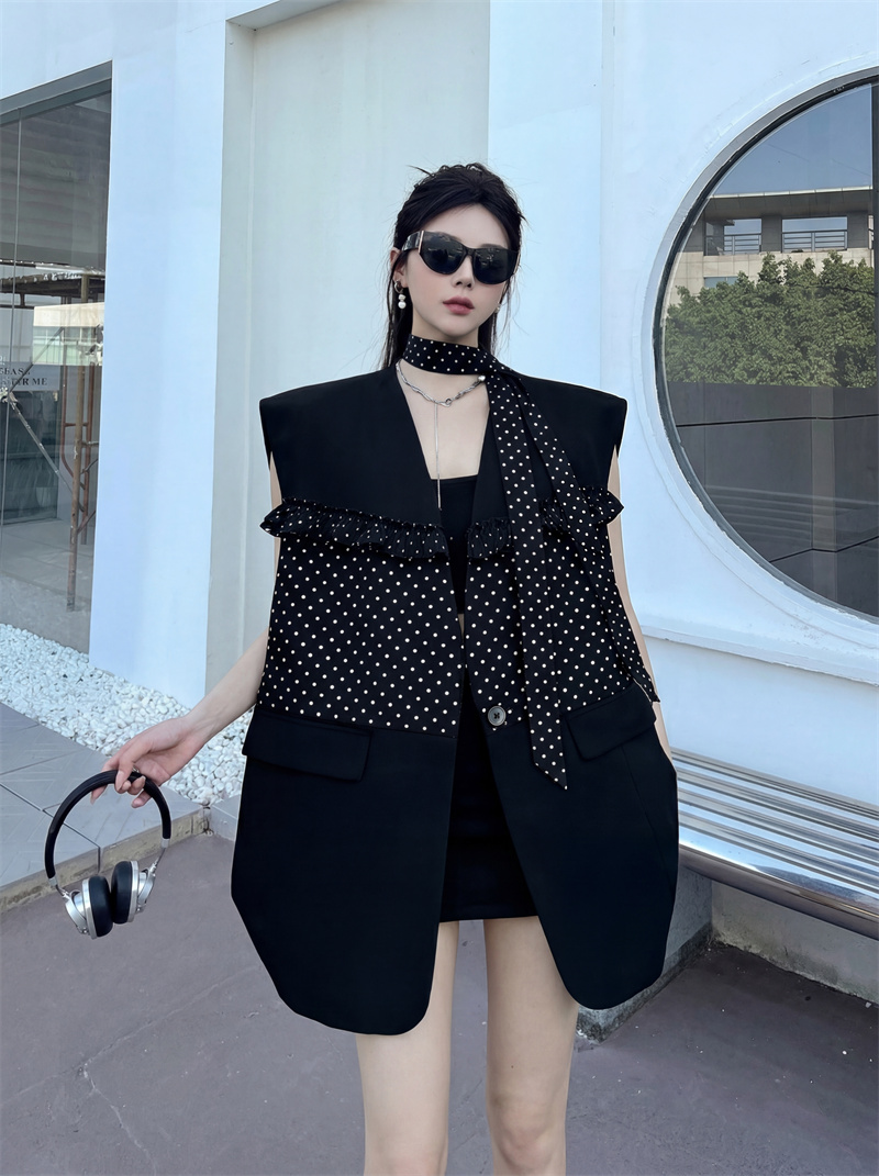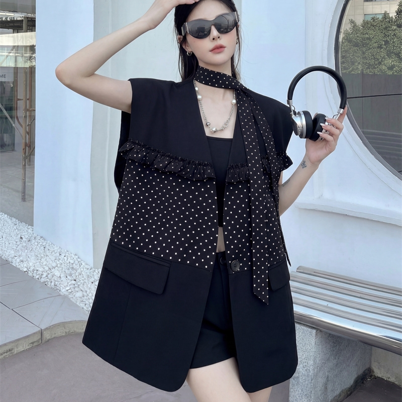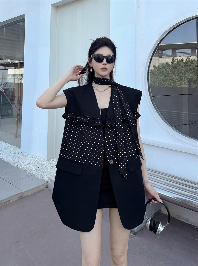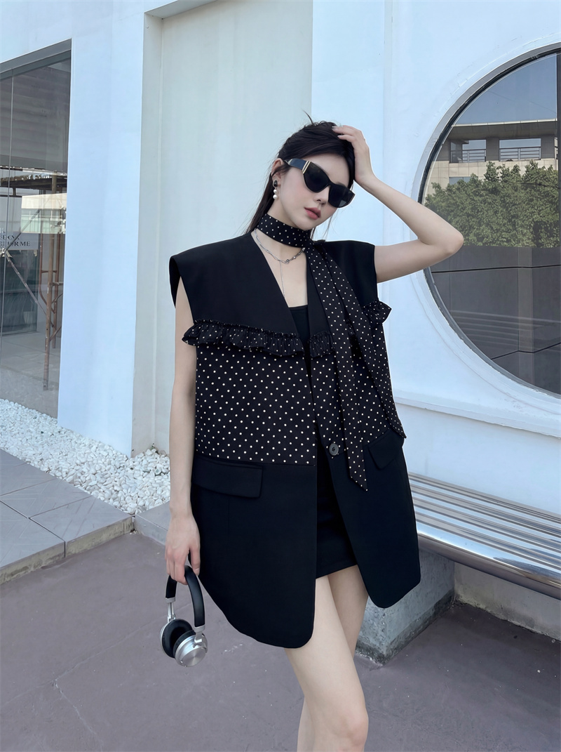실사 디자인 센스 가죽 스티칭 정장 조끼 여자 새로운 고급 센스 품격 폴로 칼라 외출용 조끼