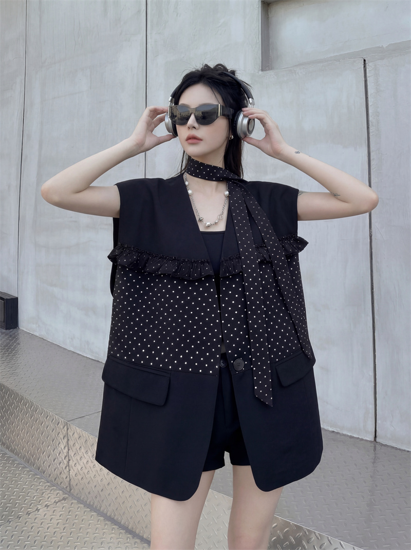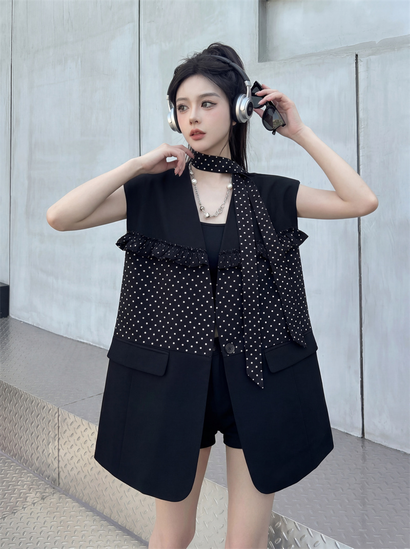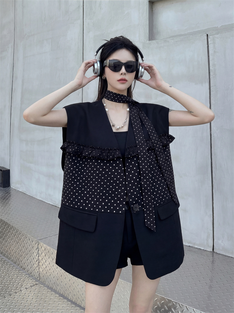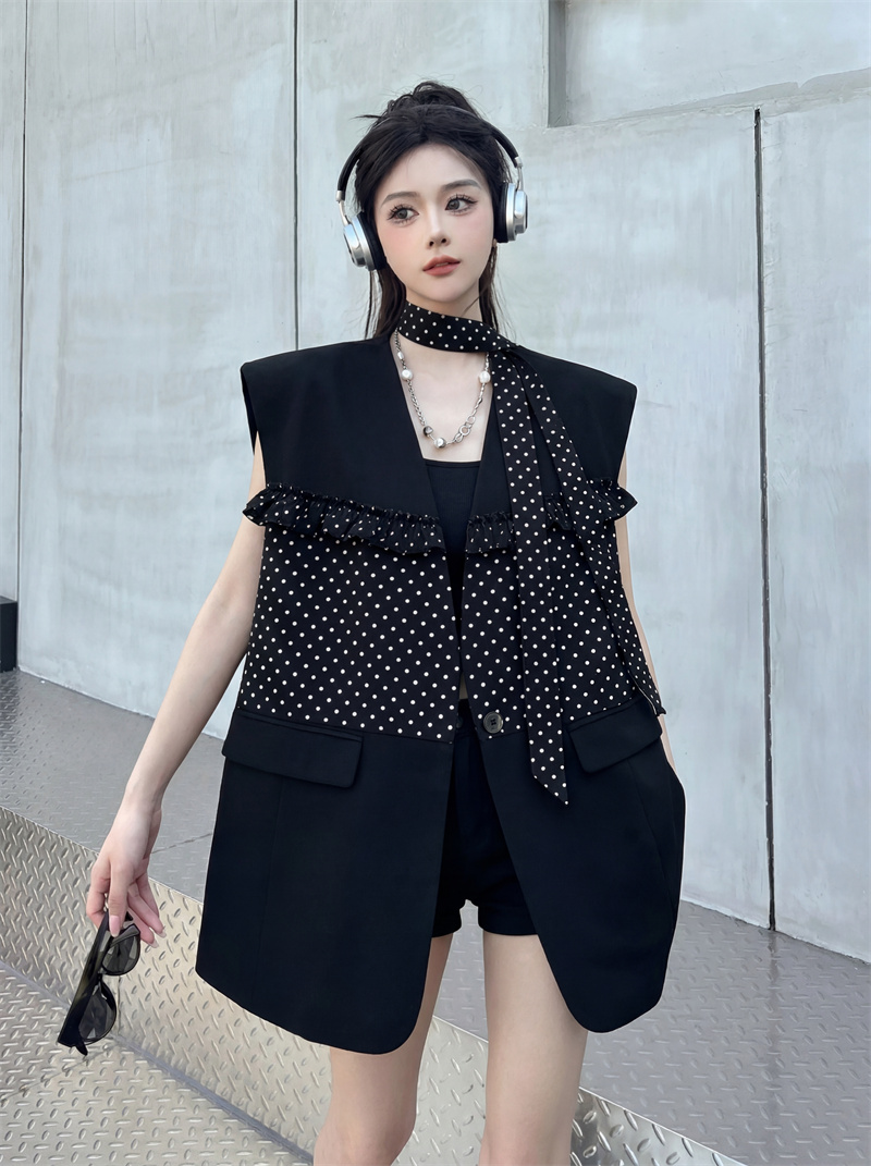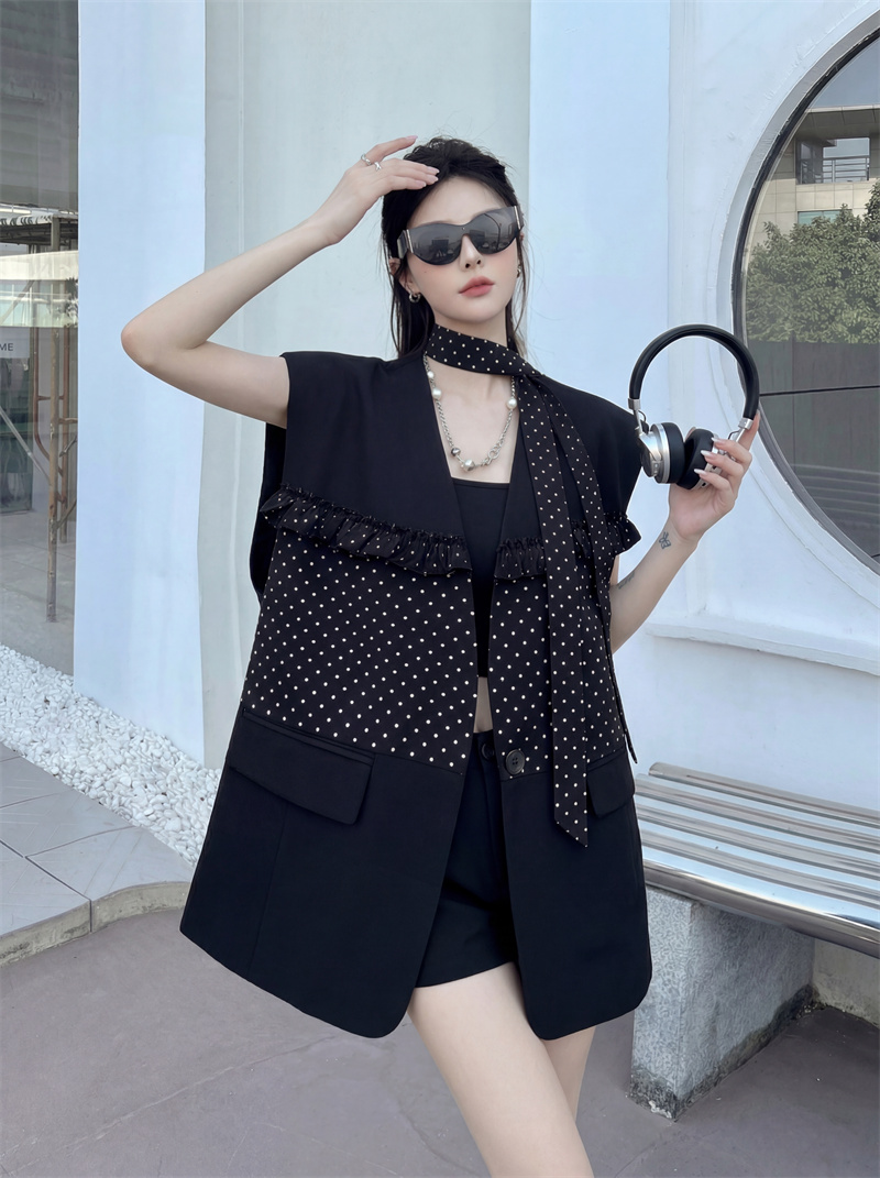 실사 디자인 센스 가죽 스티칭 정장 조끼 여자 새로운 고급 센스 품격 폴로 칼라 외출용 조끼