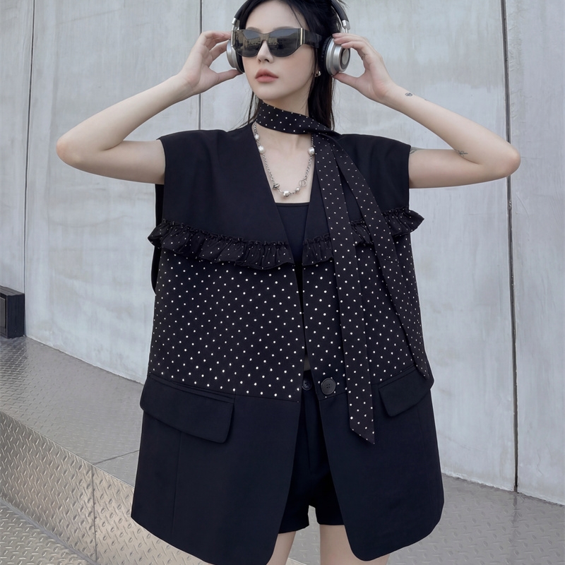 실사 디자인 센스 층 레이스 패치워크 정장 조끼 여자 트렌드 패션 캐주얼 중간 길이 재킷