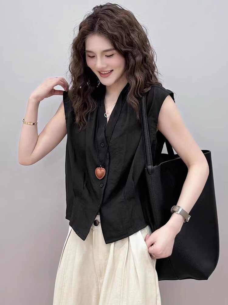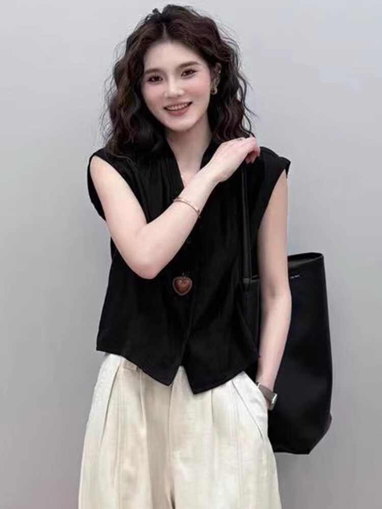 검정색 V넥 민소매 셔츠 조끼 티셔츠 여성 여름 2026 새로운 유럽 상품 폭발 쇼트 스타일 고유 한 작은 셔츠 맨위