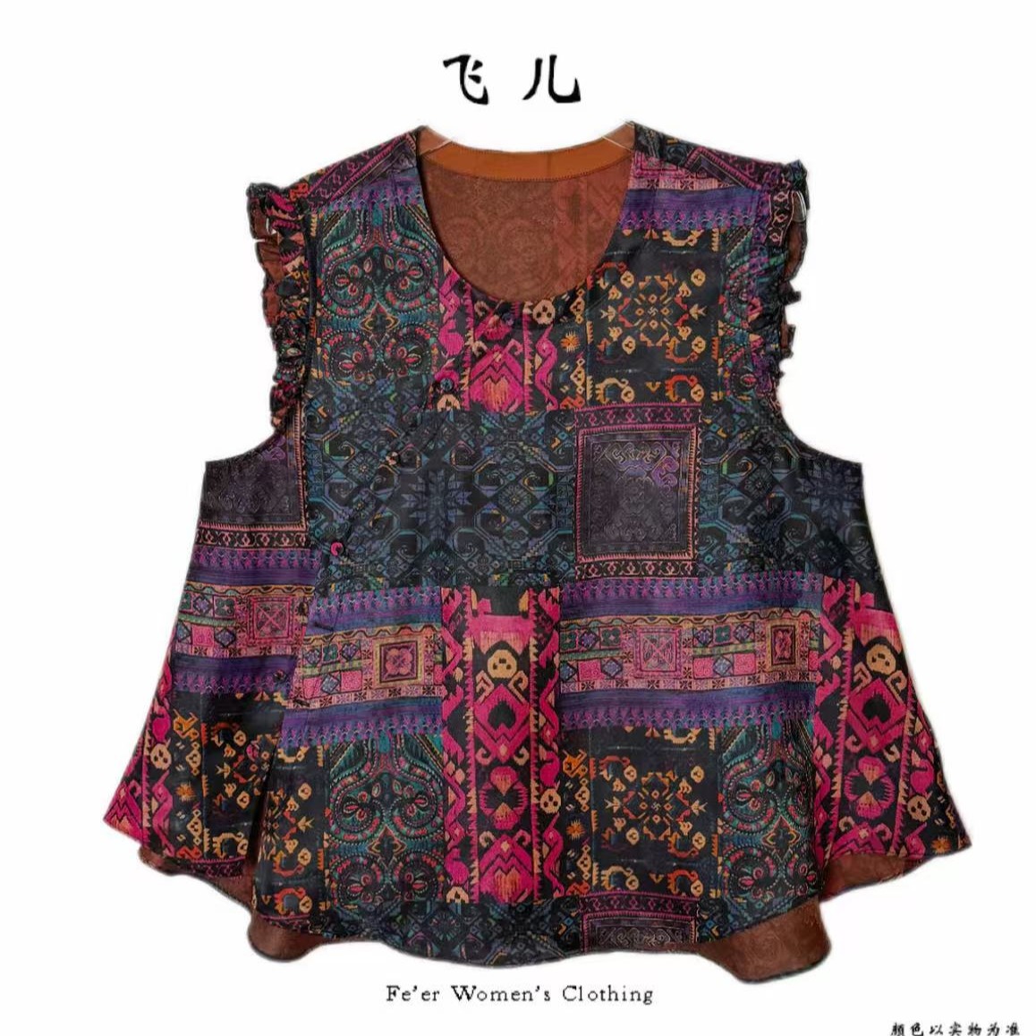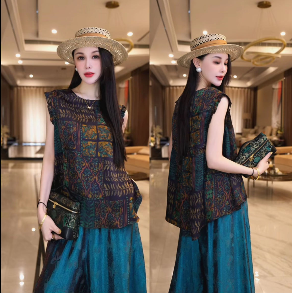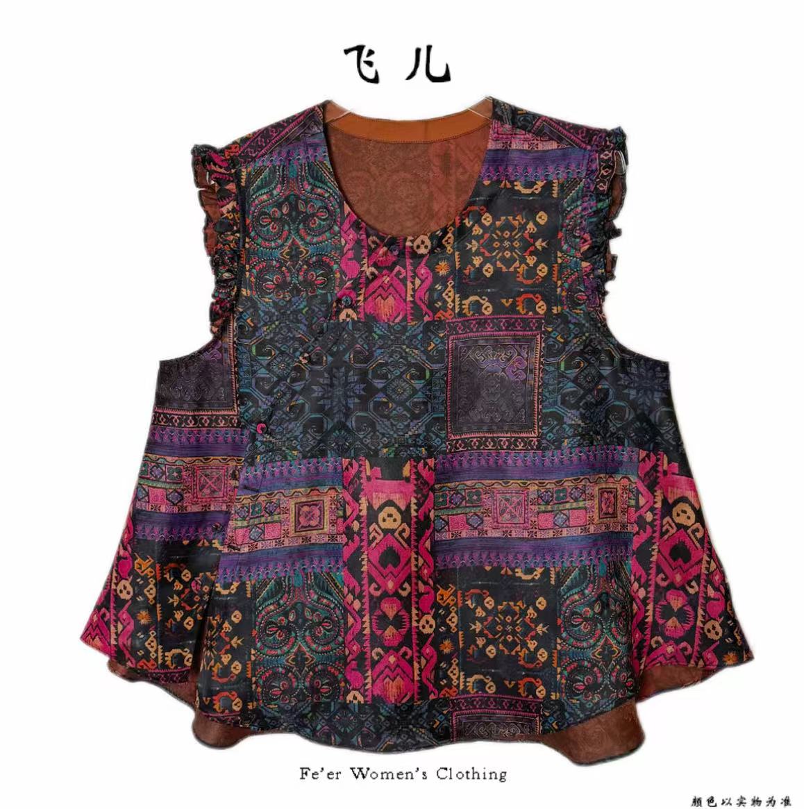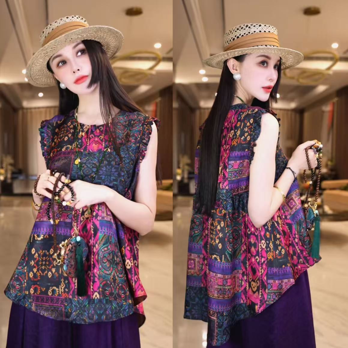 2026 새로운 중식 레트로 프린트 연령 감소 민소매 레이스 조끼 패션 캐주얼 작은 셔츠