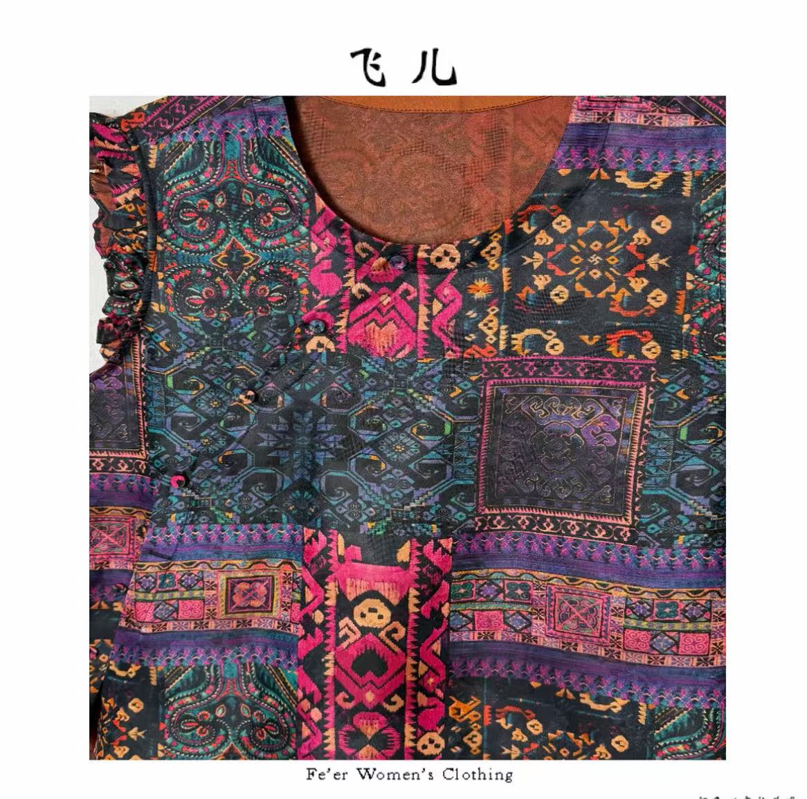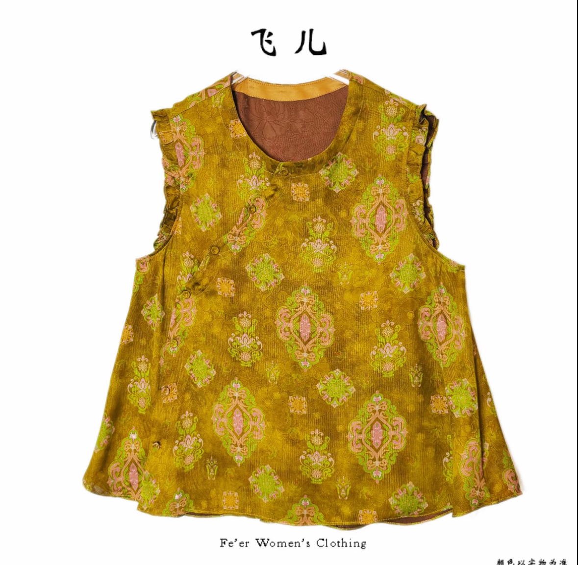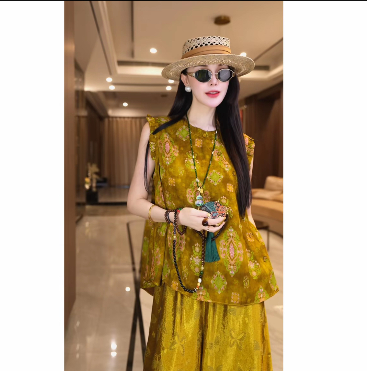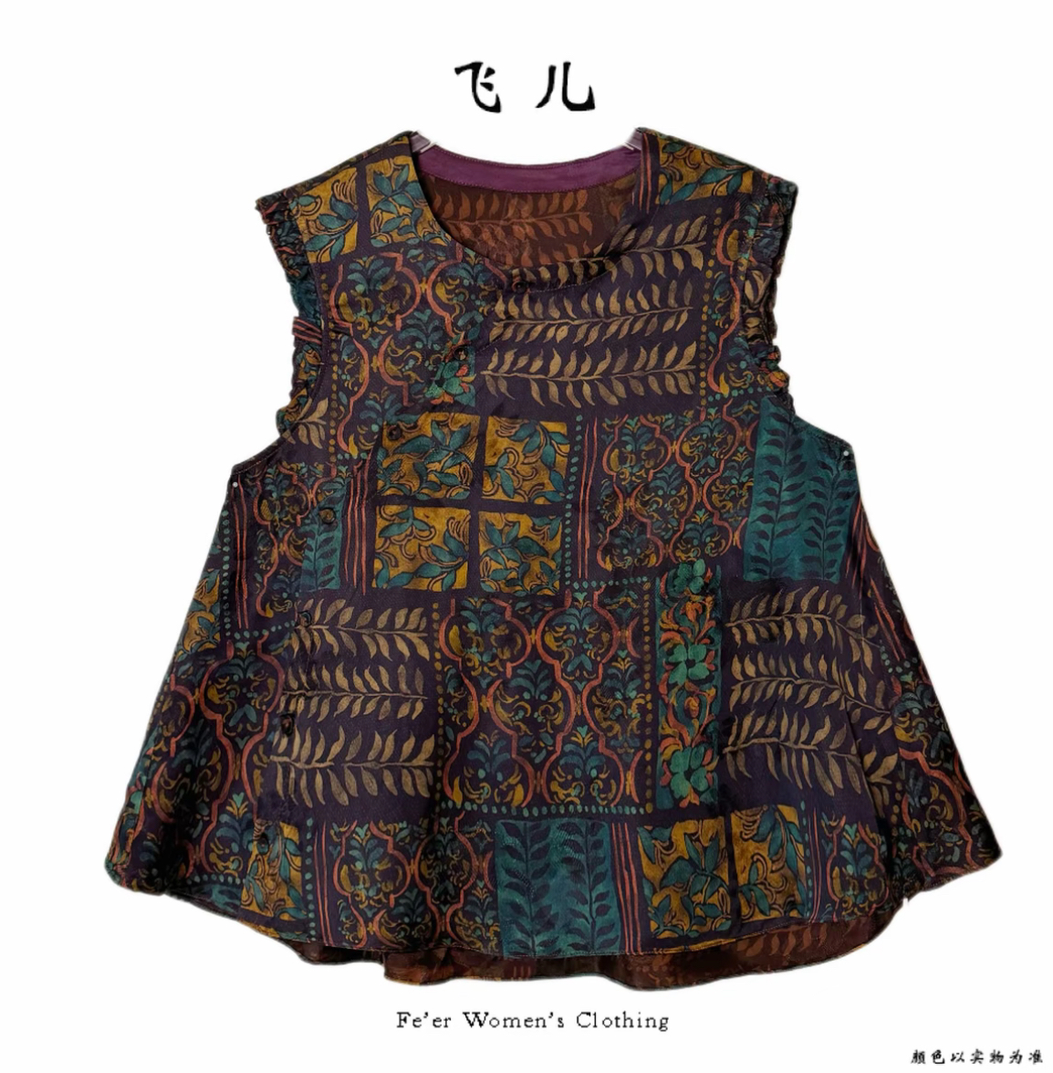2026 새로운 중식 레트로 프린트 연령 감소 민소매 레이스 조끼 패션 캐주얼 작은 셔츠