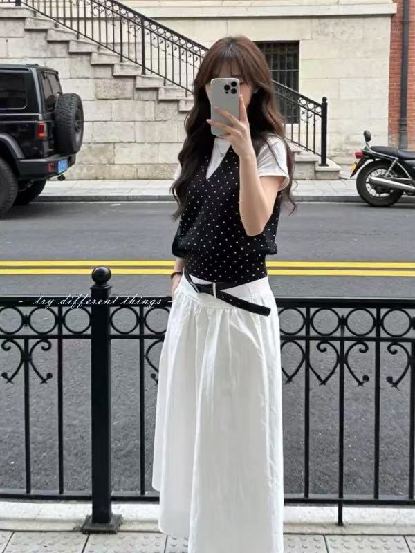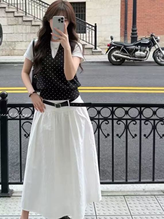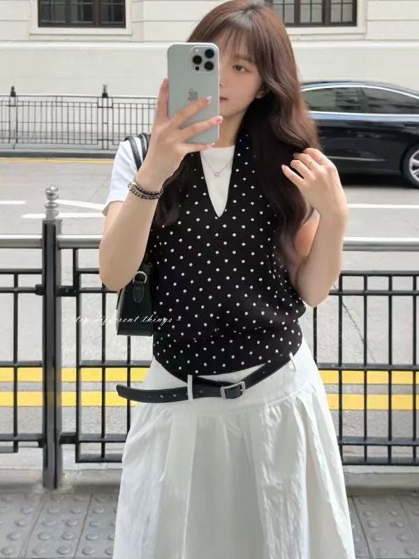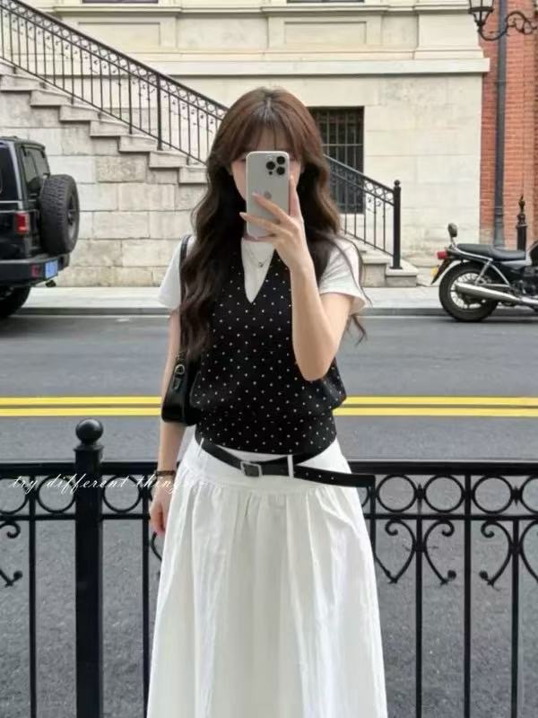 초여름 착용 가져 가라. 전체 집합 2026 새로운 화이트 티셔츠 스택 착용 도트 무늬 조끼 베스트 반신 스커트 세 조각 여성 세트