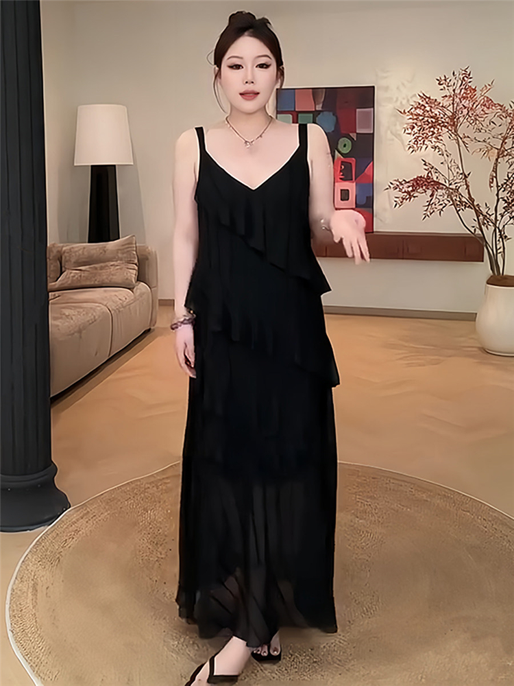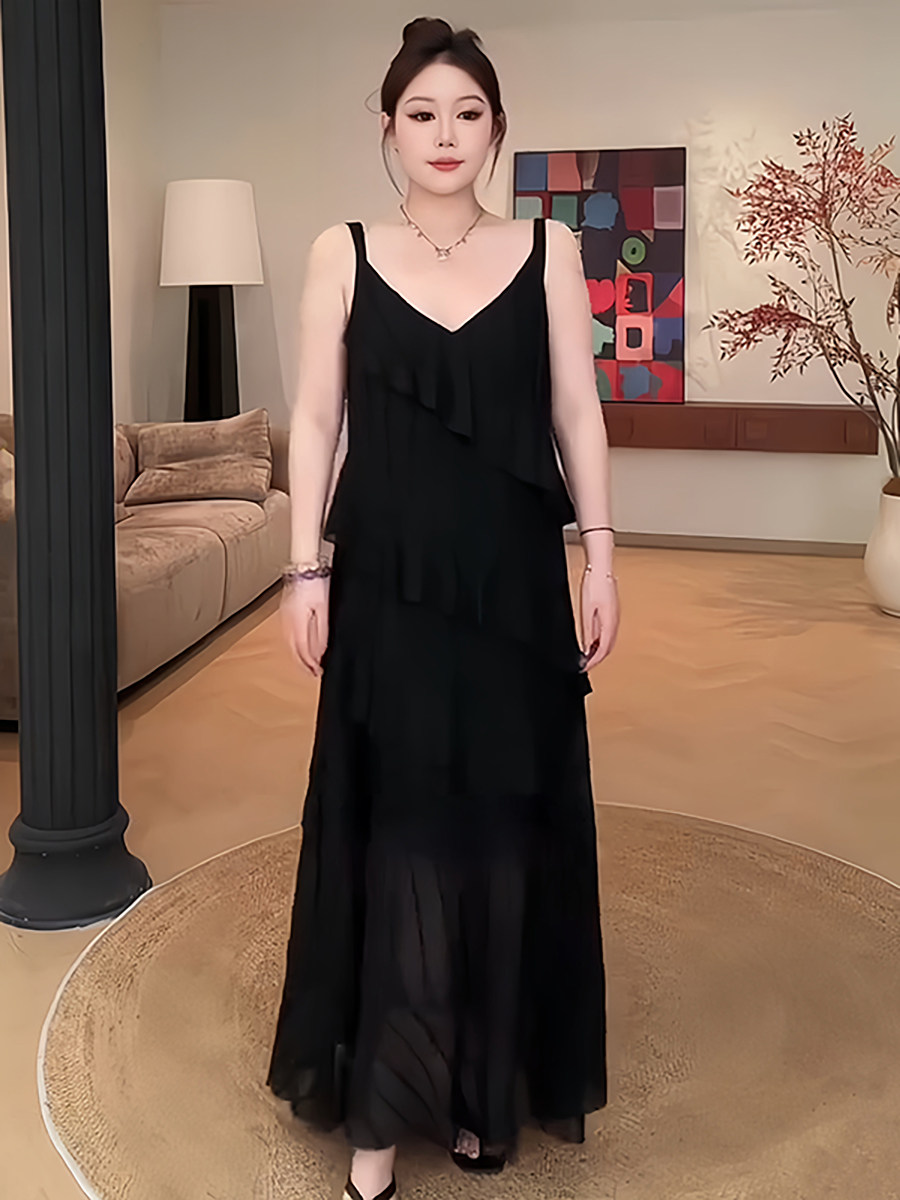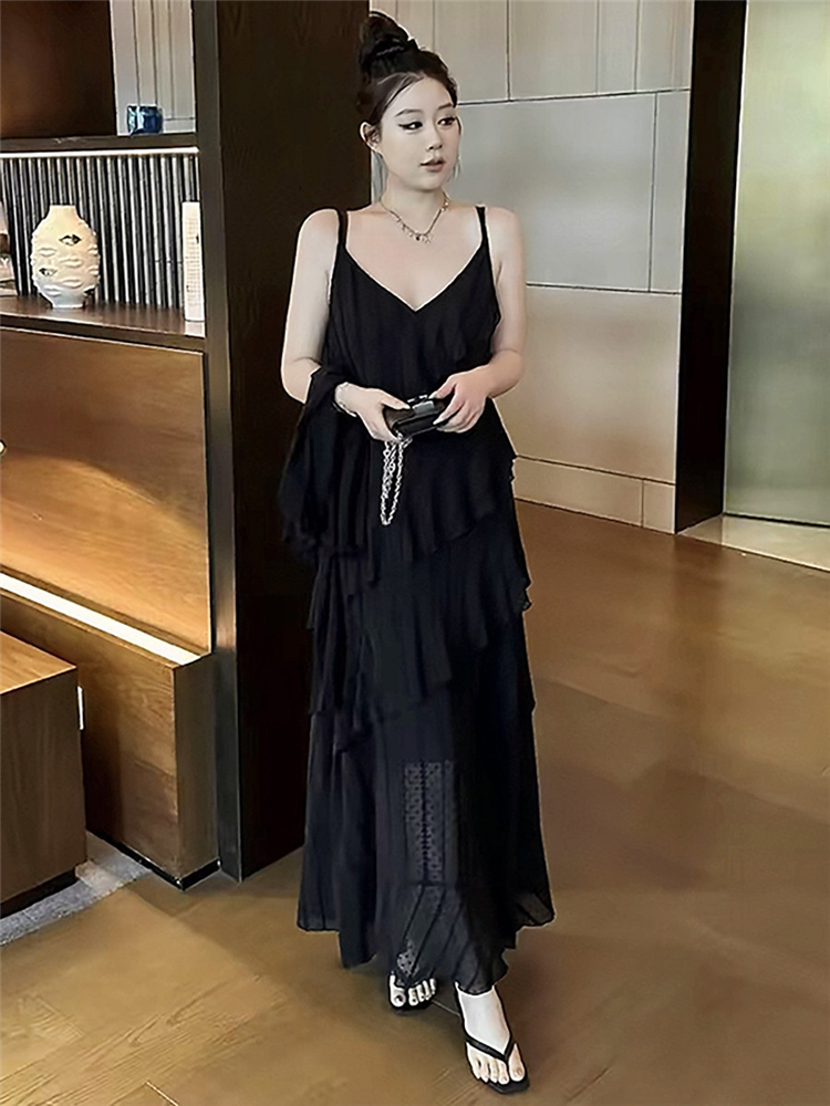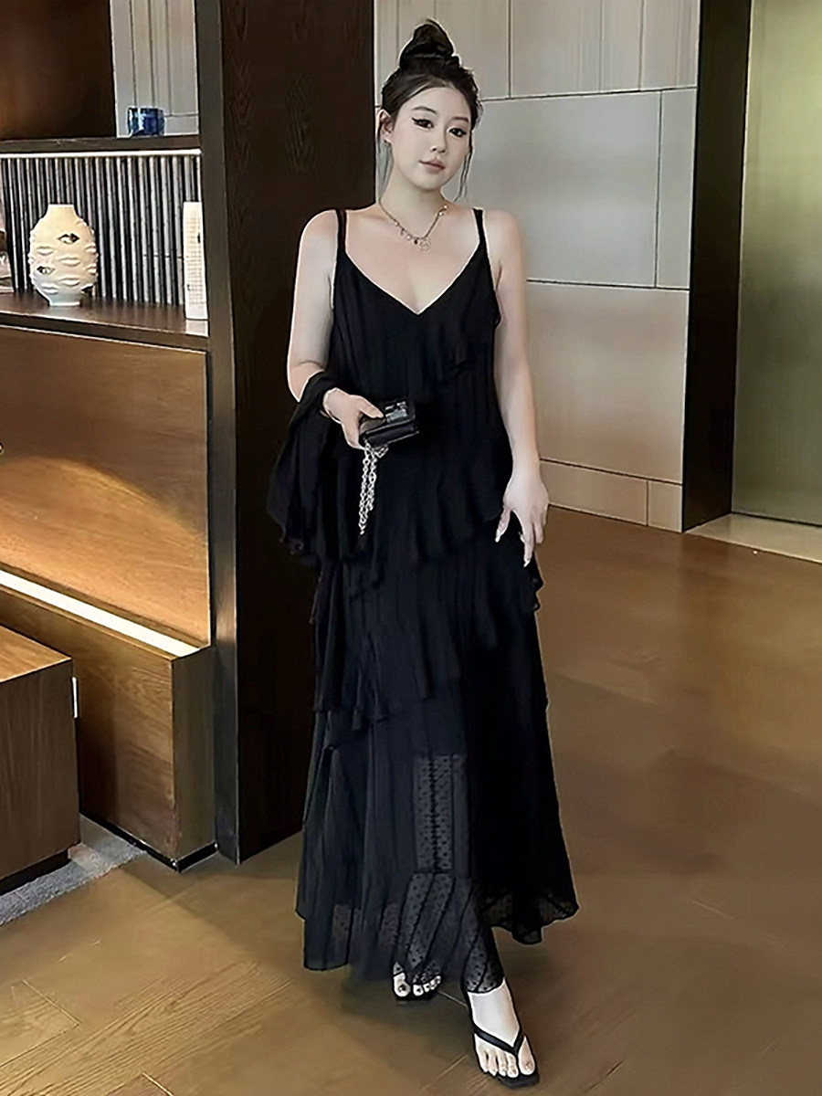 빅 사이즈 여성 의류 지방 mm 작은 대중 디자인 센스 레이스 질감 곡물 조끼 여성 드레스 여름 품격 슬림해 보이는 롱 스커트