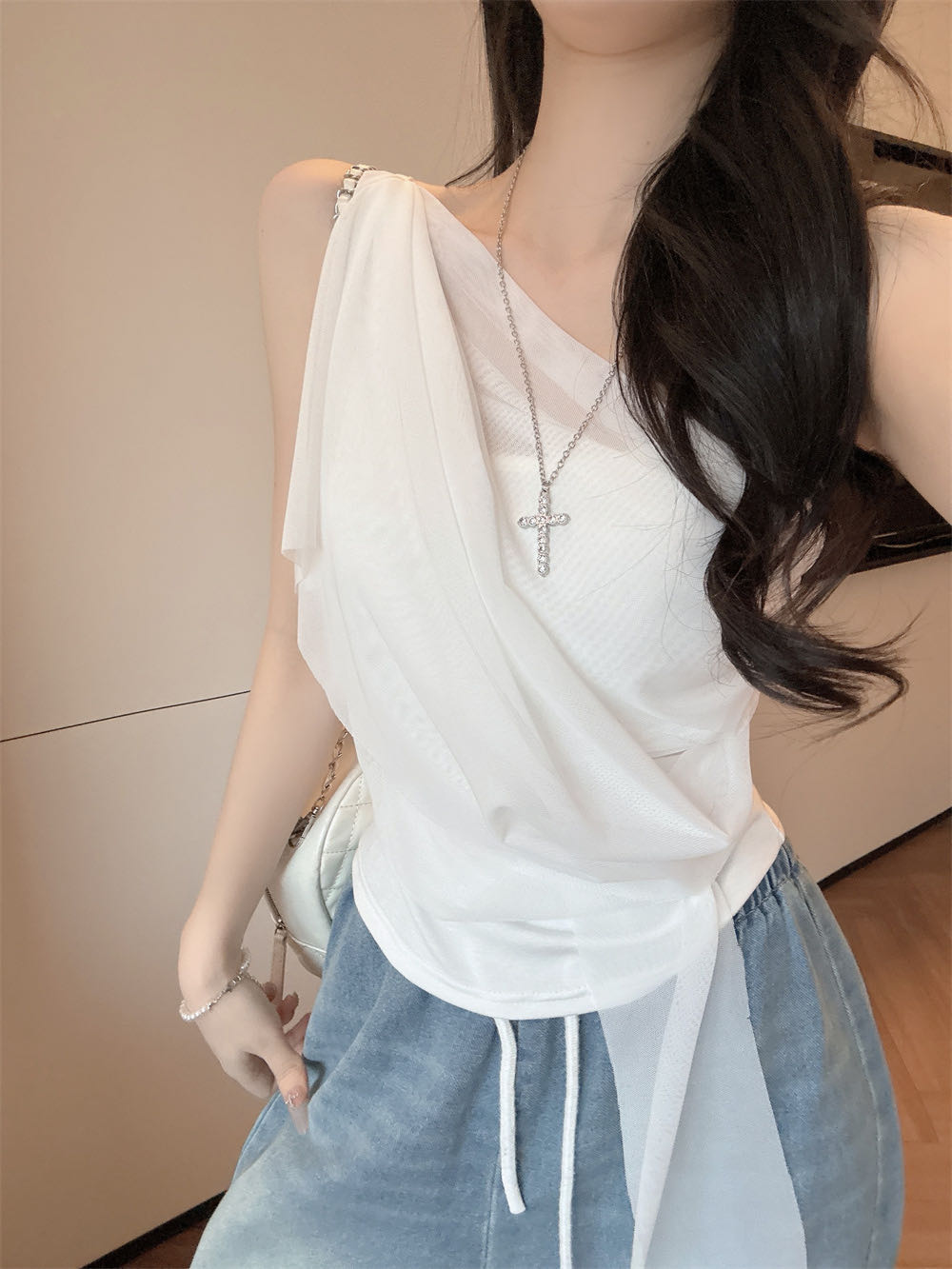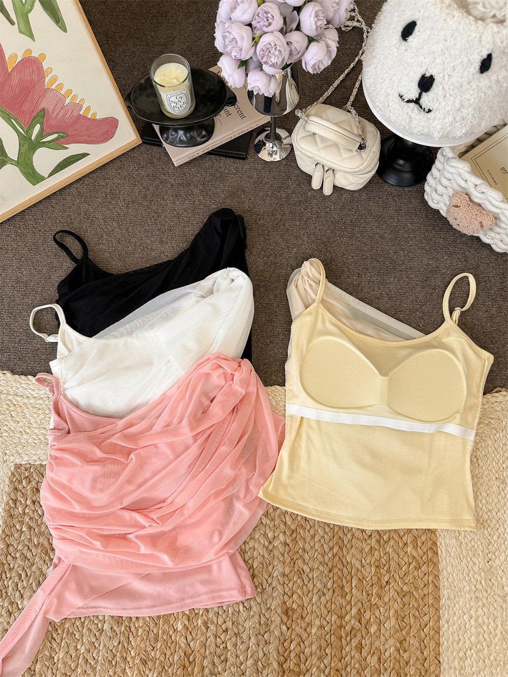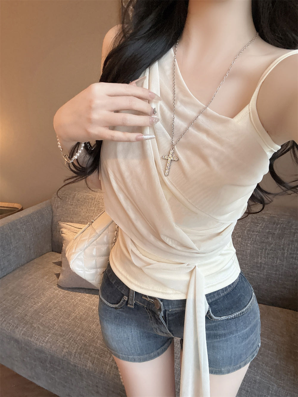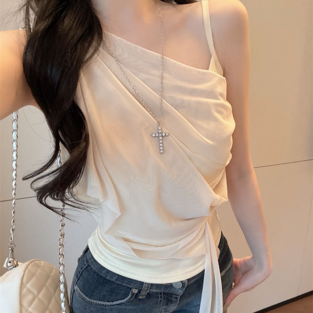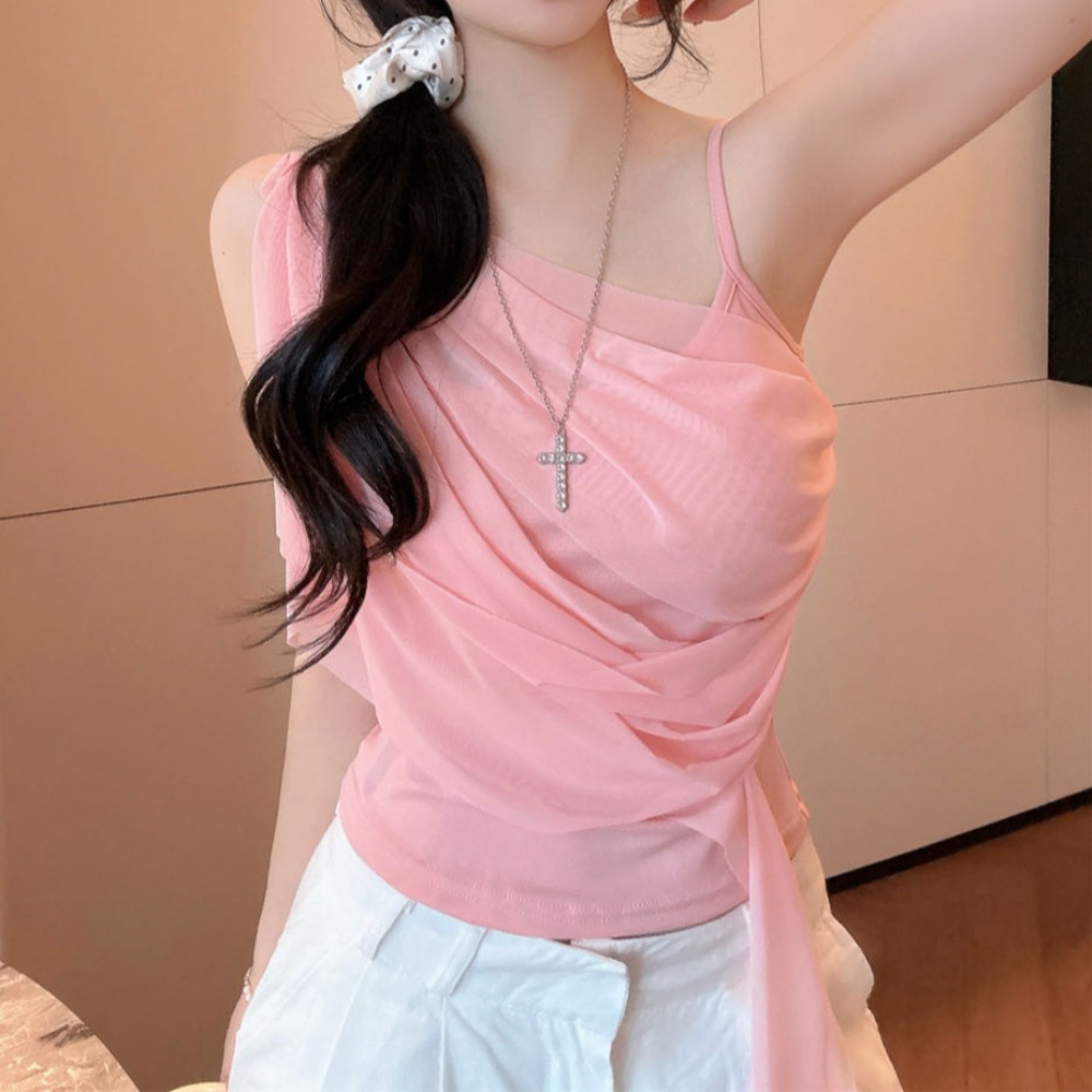 순수한 욕망 바람 디자인 센스 망사 불규칙 패치워크 조끼 슬립 여성 여름 새로운 핫걸 몸매 가꾸기 쇼트 스타일 맨위
