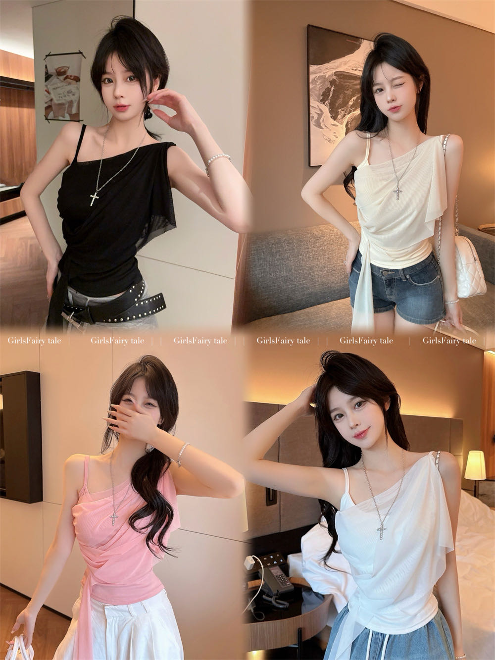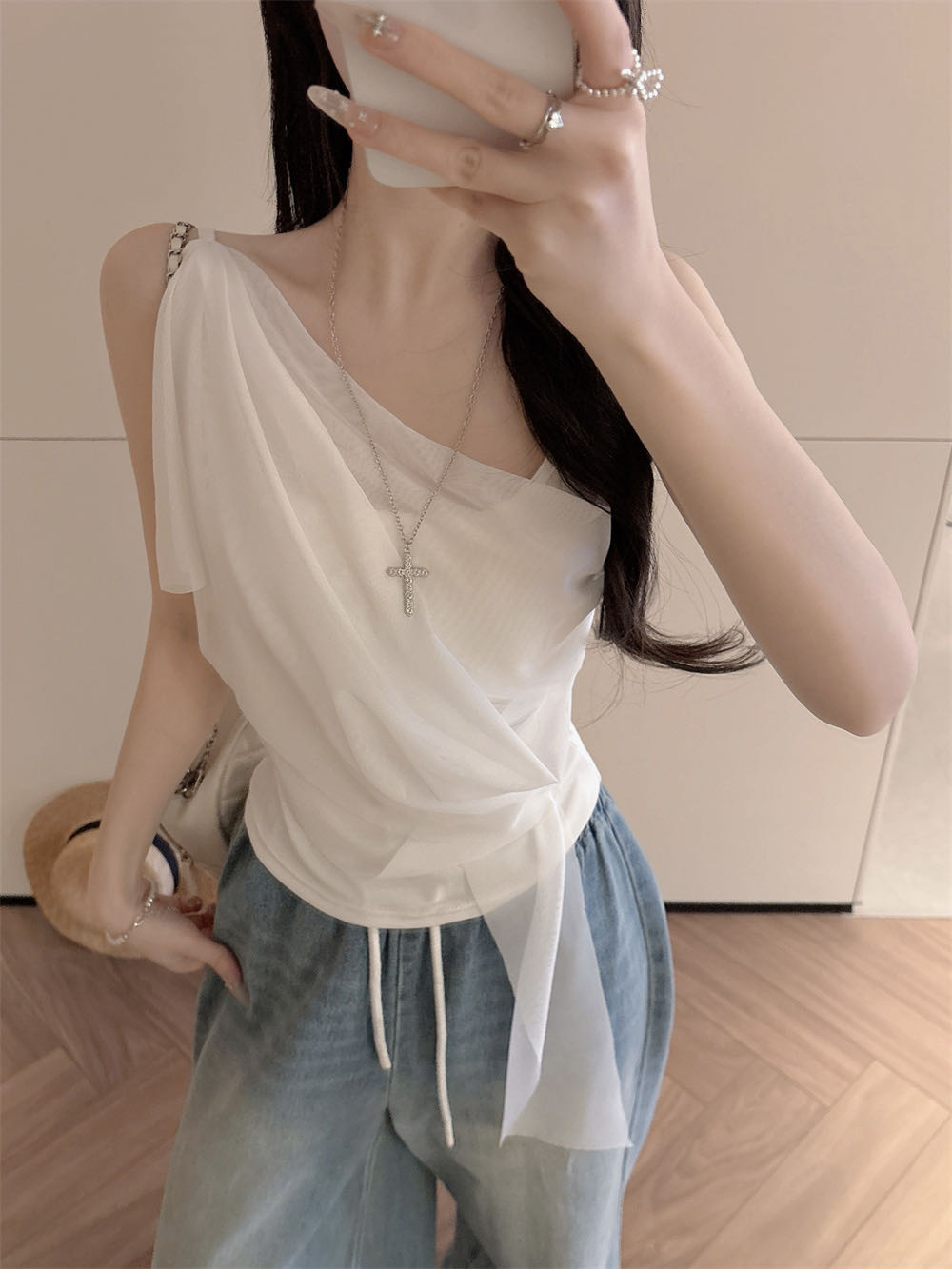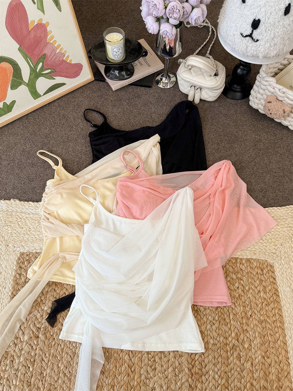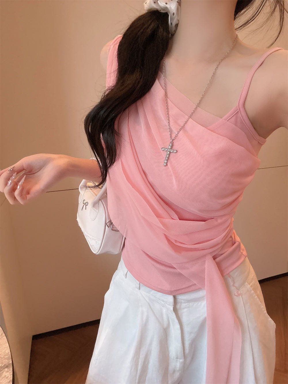 순수한 욕망 바람 디자인 센스 망사 불규칙 패치워크 조끼 슬립 여성 여름 새로운 핫걸 몸매 가꾸기 쇼트 스타일 맨위