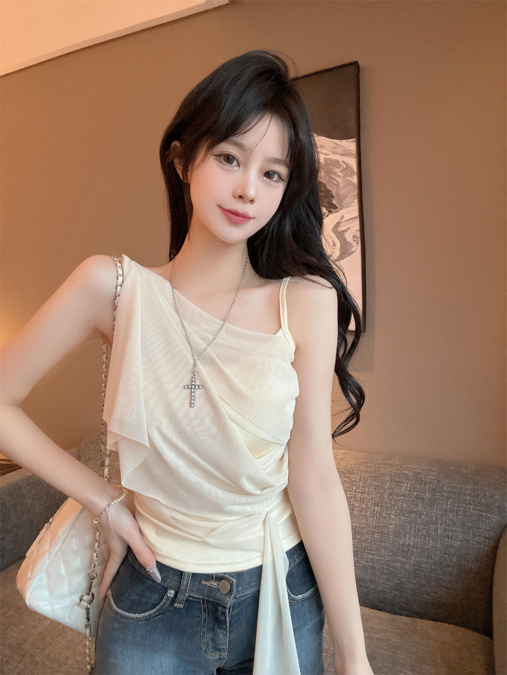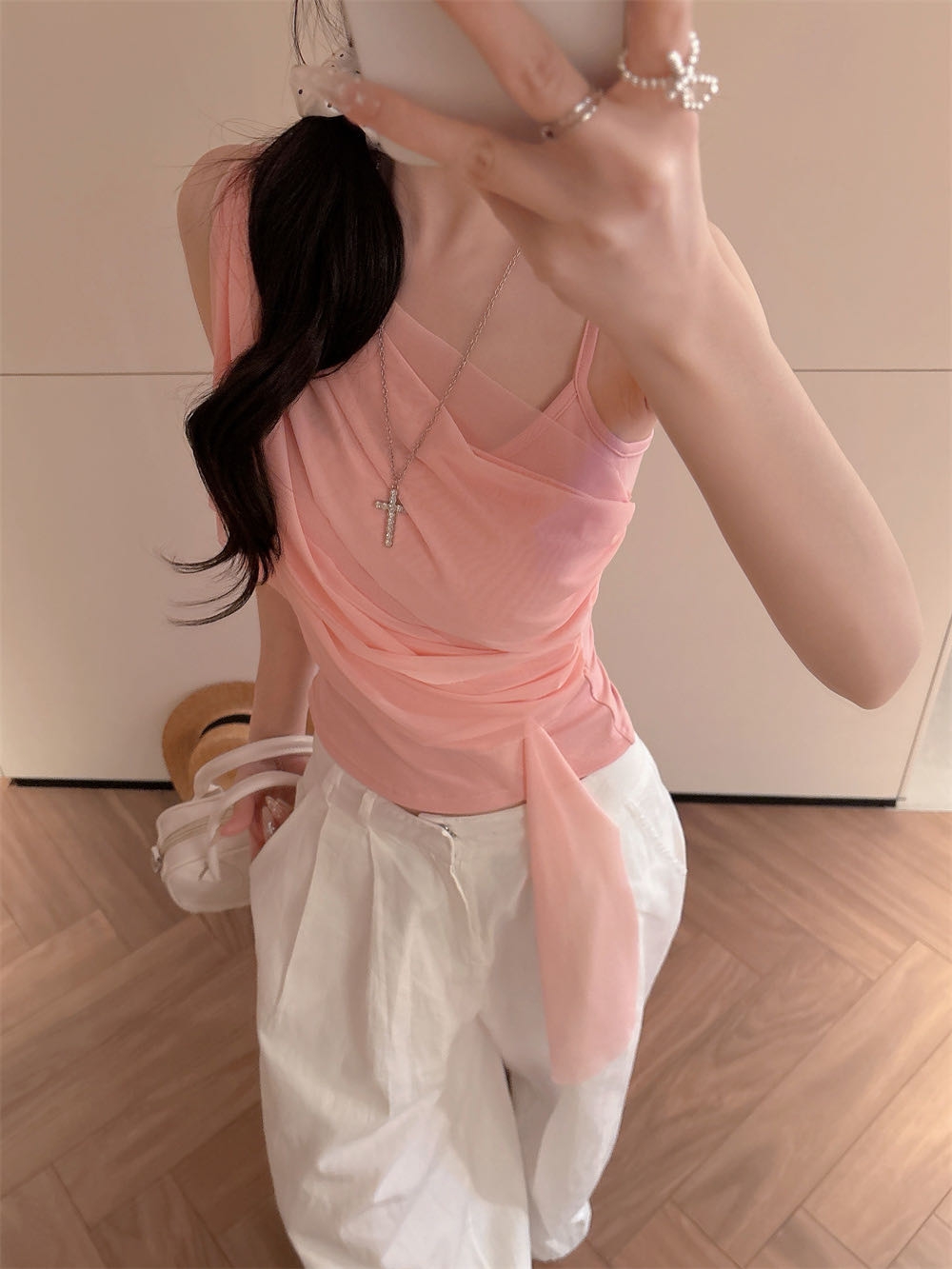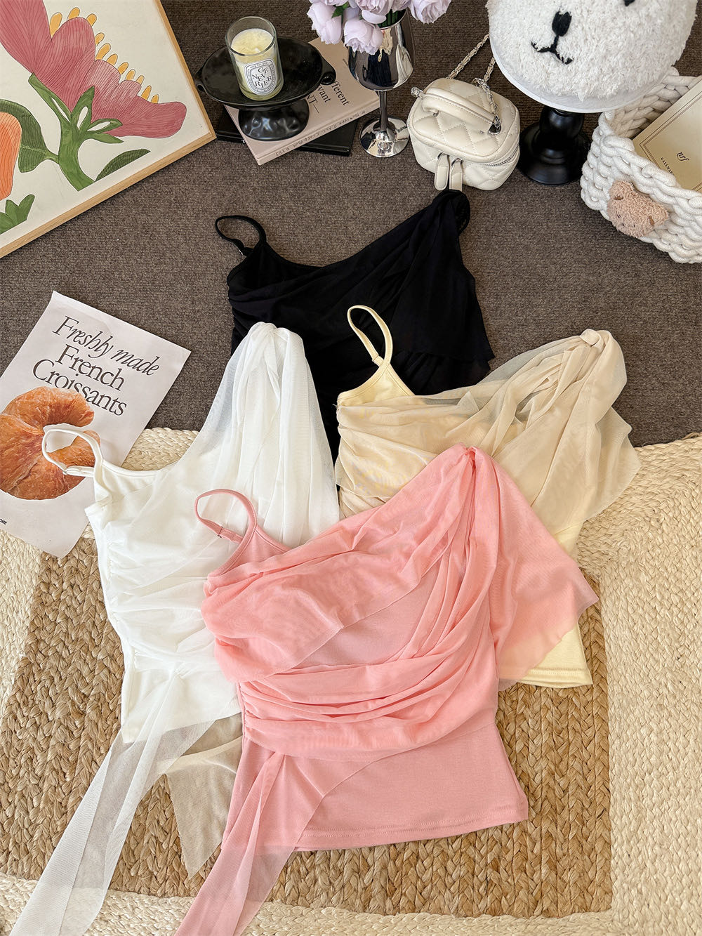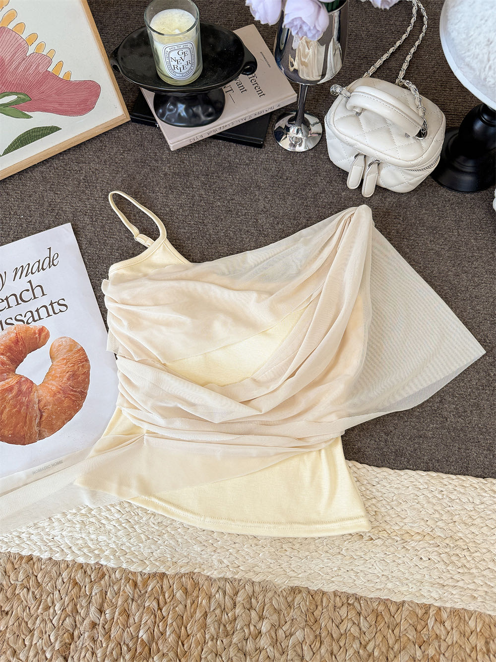 순수한 욕망 바람 디자인 센스 망사 불규칙 패치워크 조끼 슬립 여성 여름 새로운 핫걸 몸매 가꾸기 쇼트 스타일 맨위