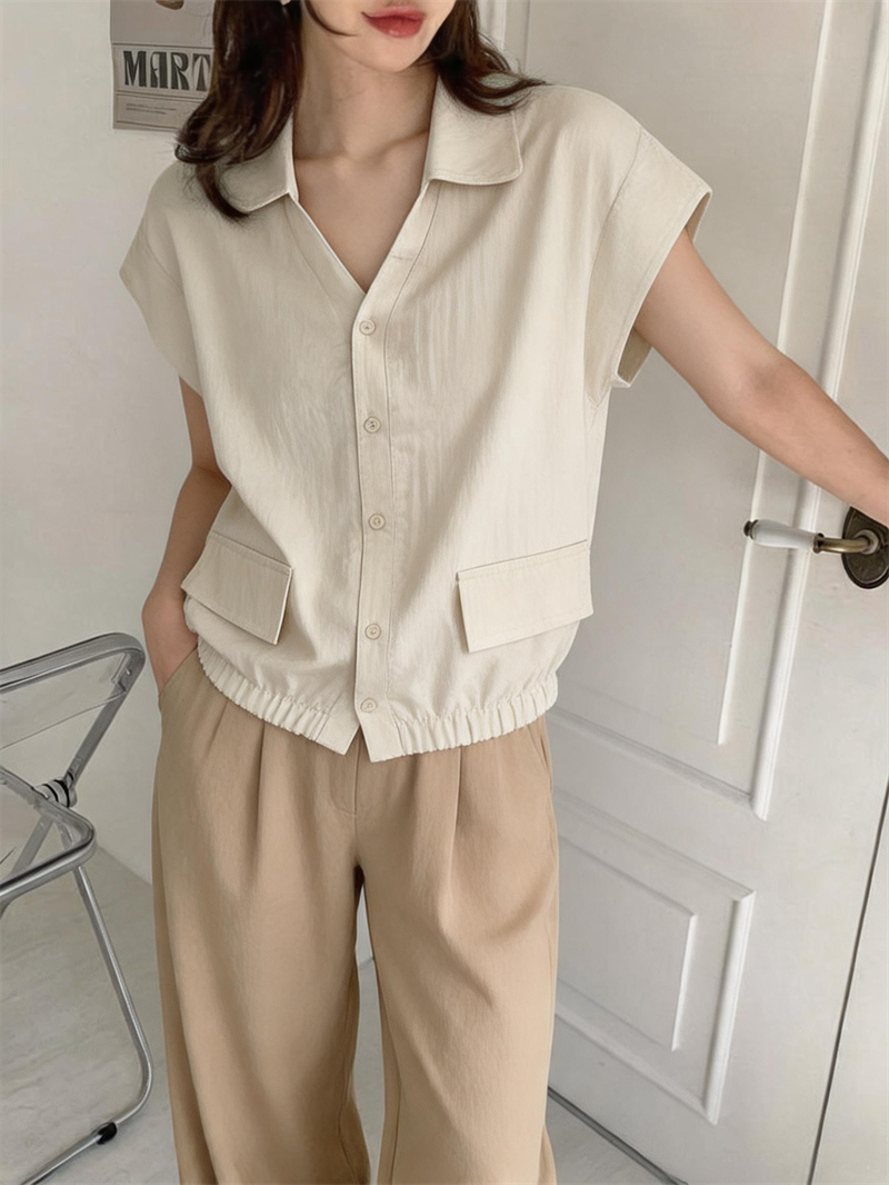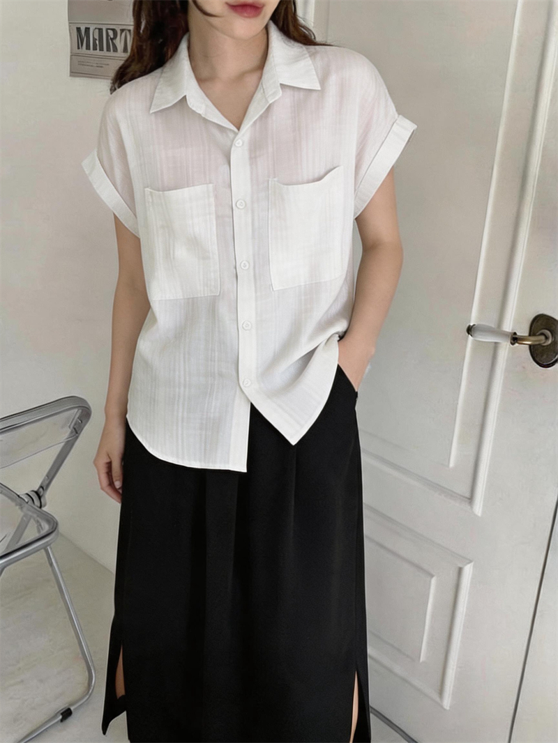 실사 단색 미니멀리즘 주름 캐주얼 출퇴근 반팔 여성 셔츠 새로운 작은 대중 표지 고기 슬림해 보이는 몸매 가꾸기 맨위