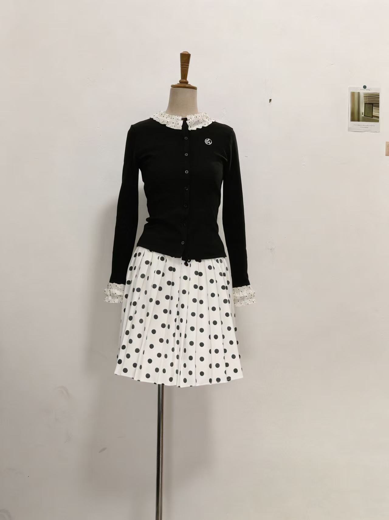 lennea 도트 무늬 레이스 소매 검정색 긴팔 니트 오픈 가디건 여성 다용도 몸매 가꾸기 기본 셔츠 이른 가을 맨위 봄