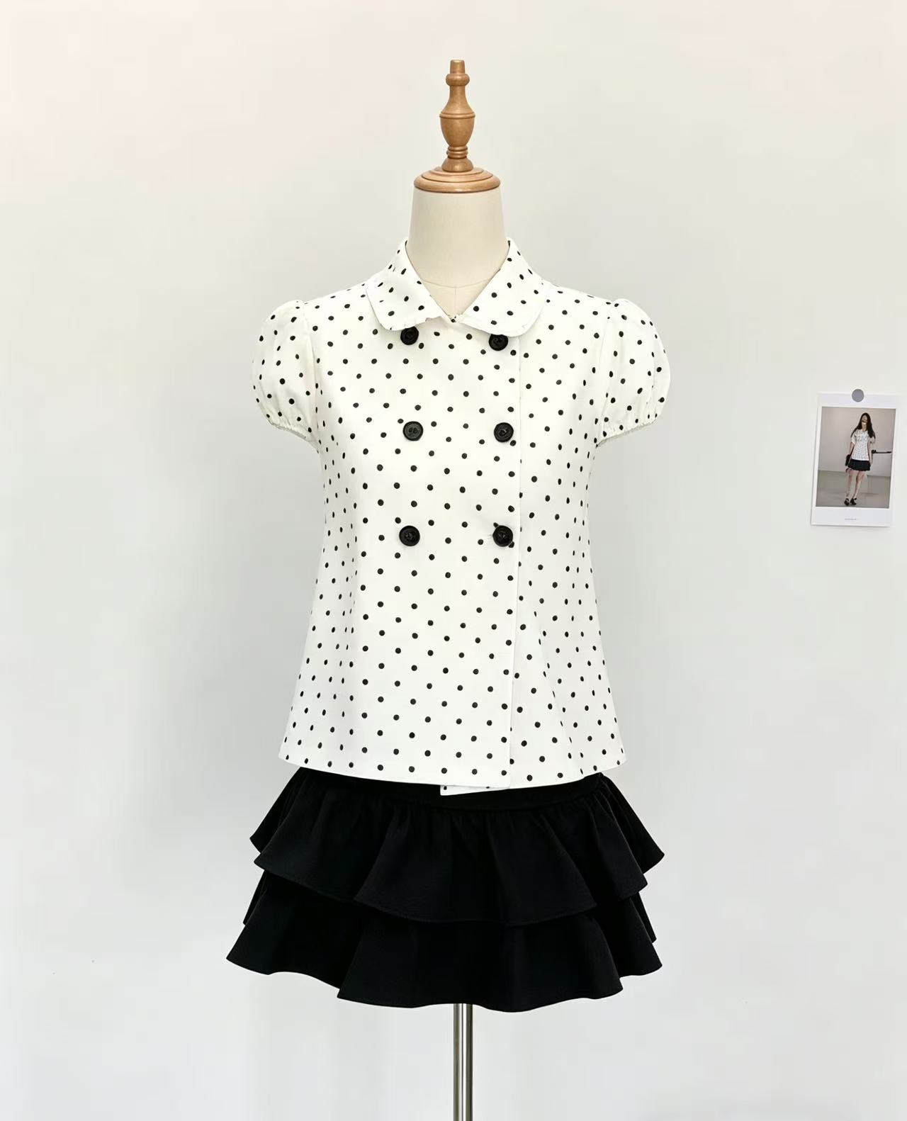작은 샤넬 스타일 도트 무늬 반팔 셔츠 여름 새로운 달콤함 베이비 칼라 이중 버튼 화이트 셔츠
