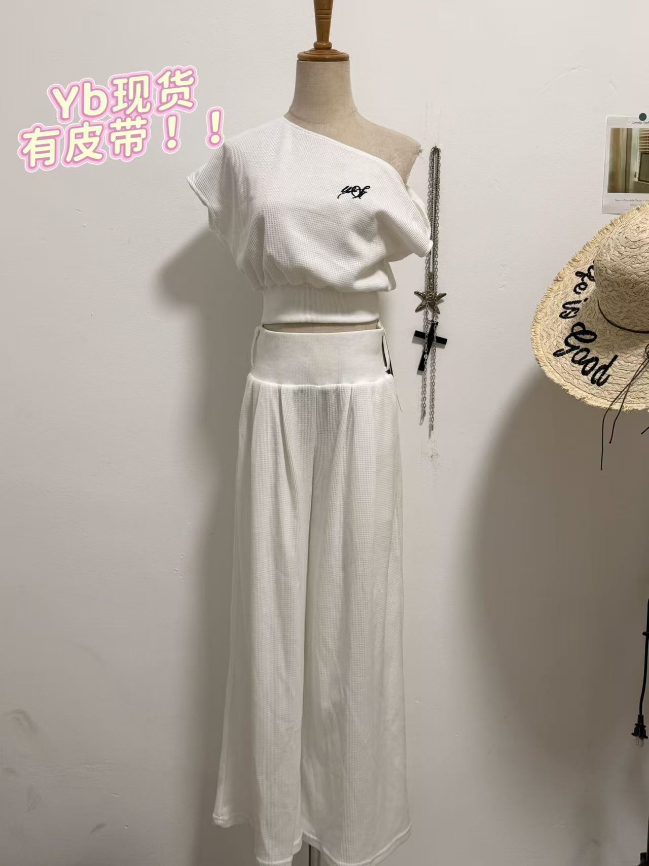 4.13 신제품 westayone 후아 남편 그리드 니트 비스듬한 어깨 반팔 티셔츠 여성 레저 세트 와이드 레그 팬츠