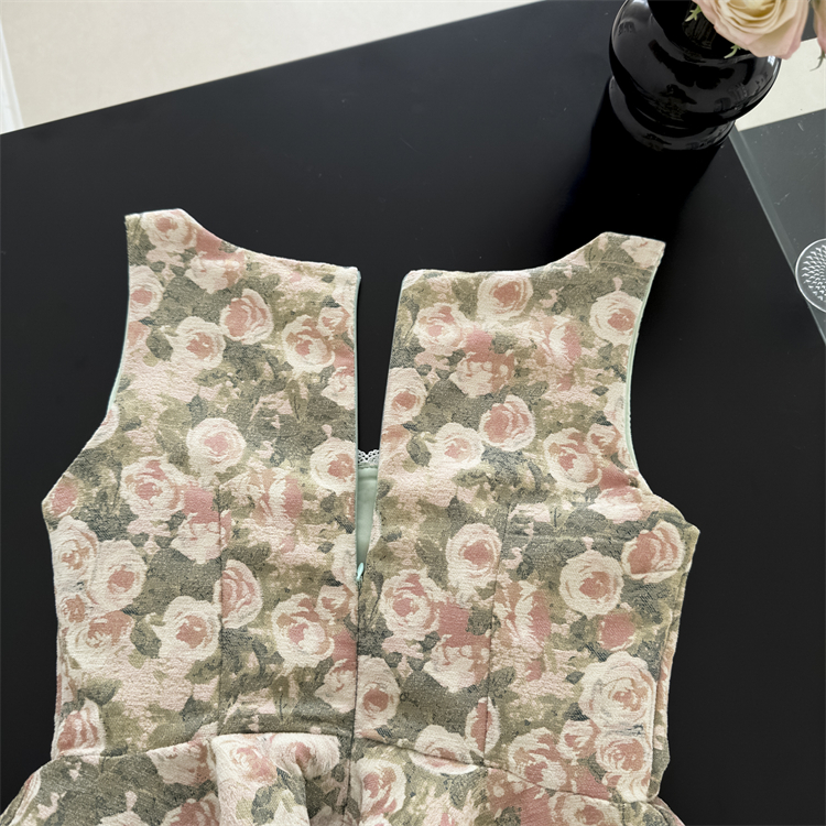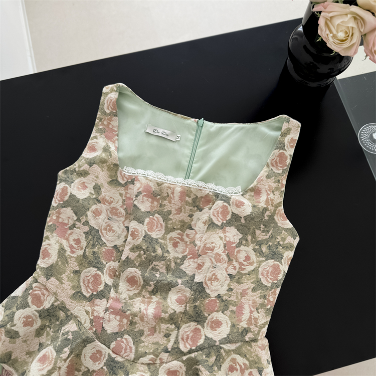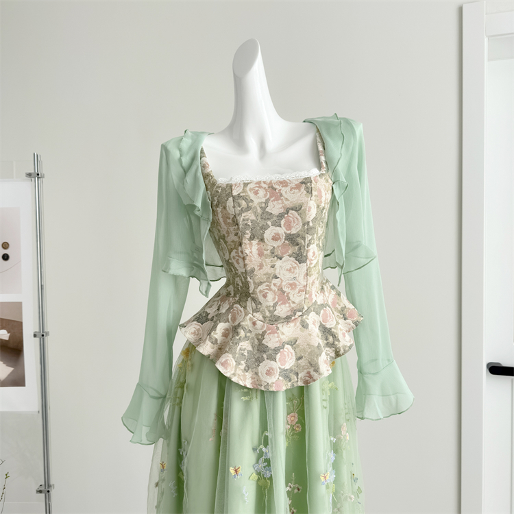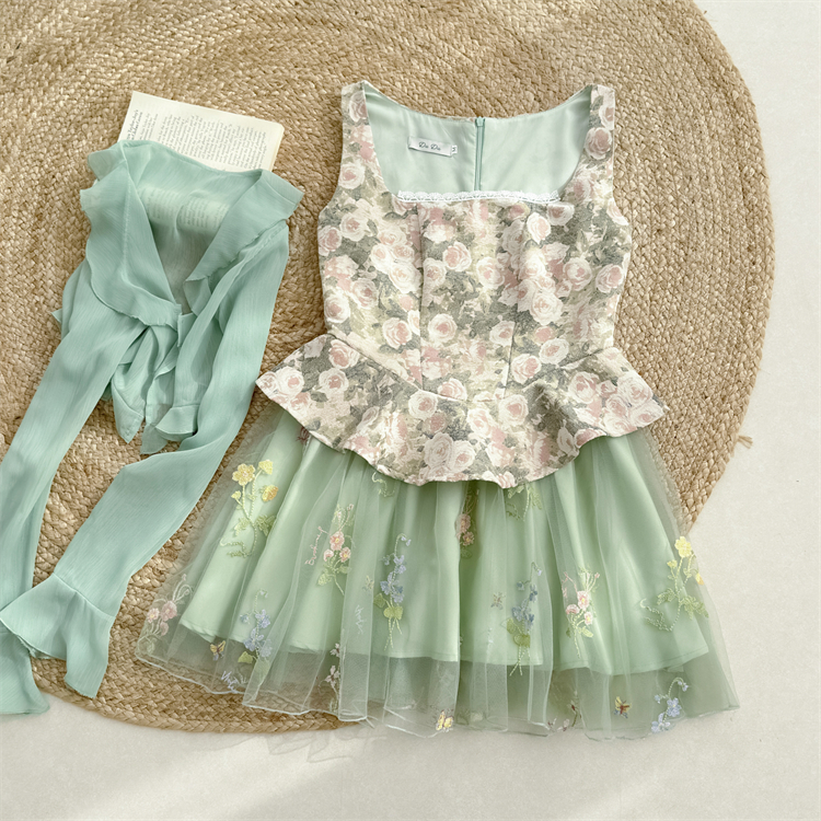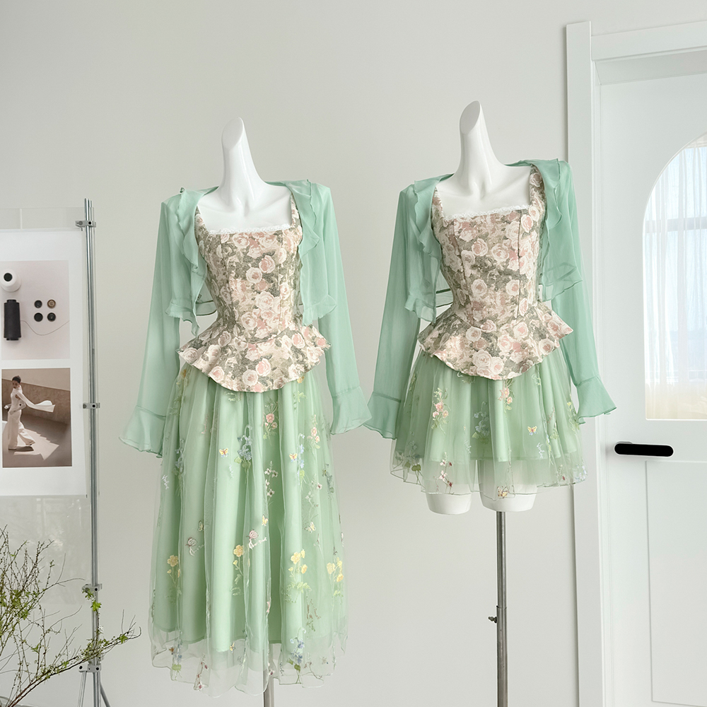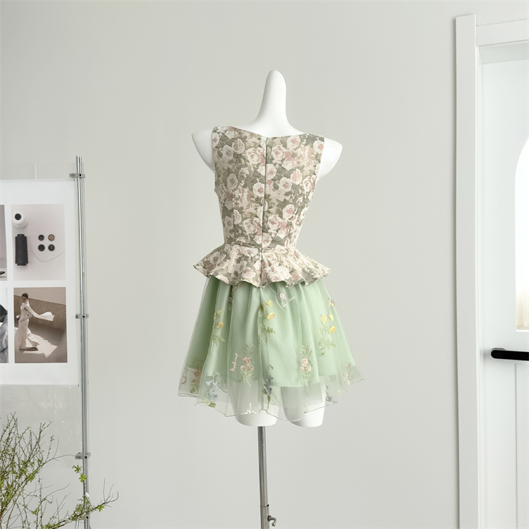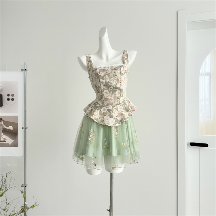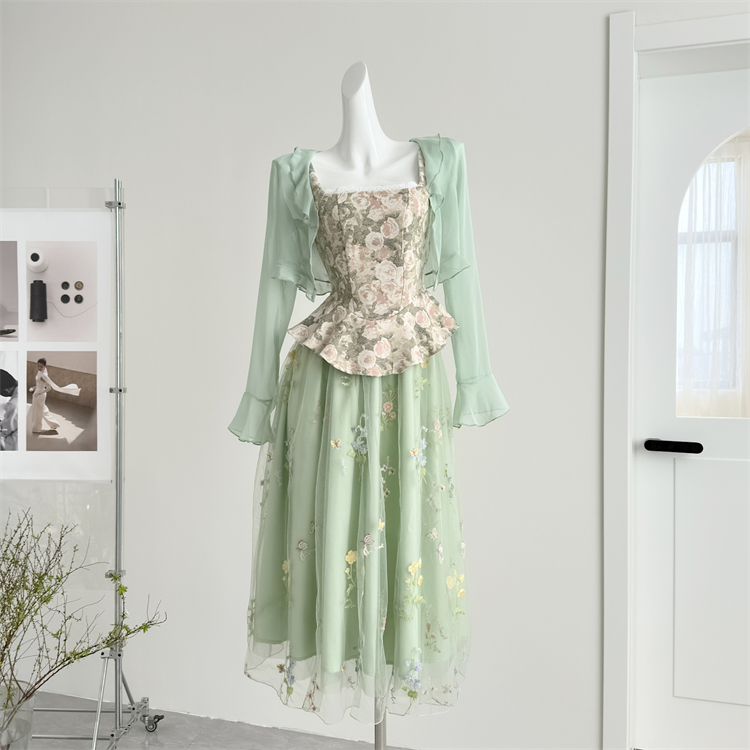 유화 부드러운 실 직물 돼지 오리지널 이른 봄 녹색 자수 페이크 레이어드 슬립 드레스 자카드 조끼 스커트
