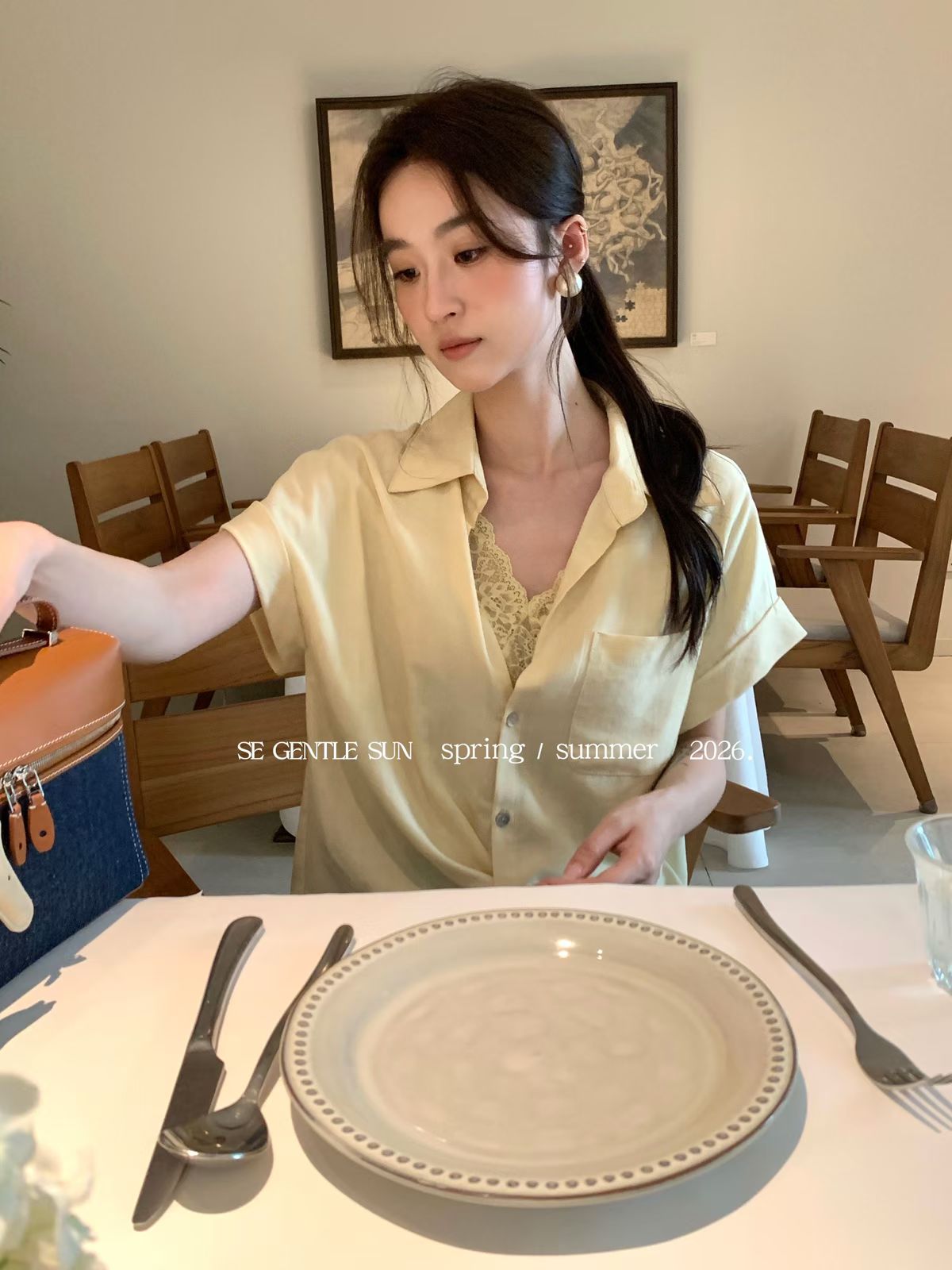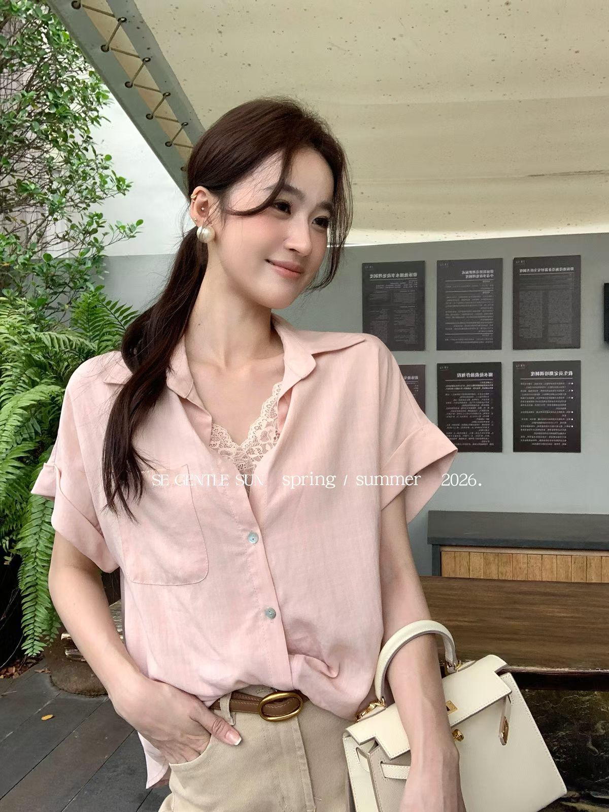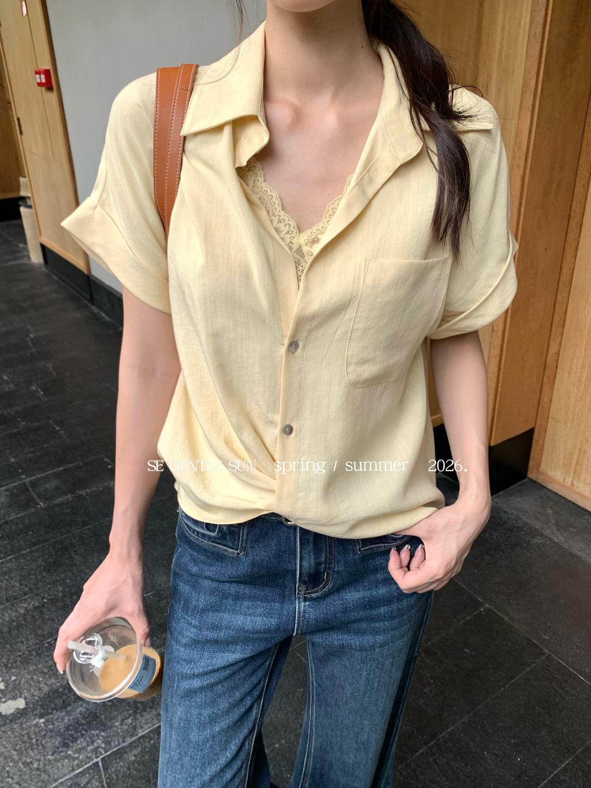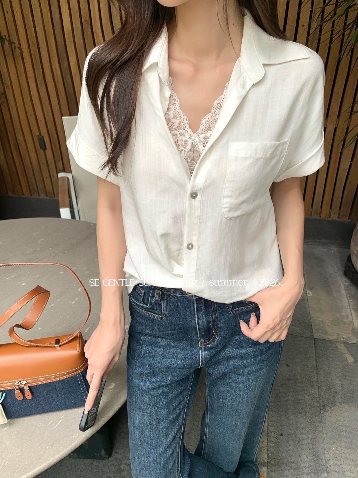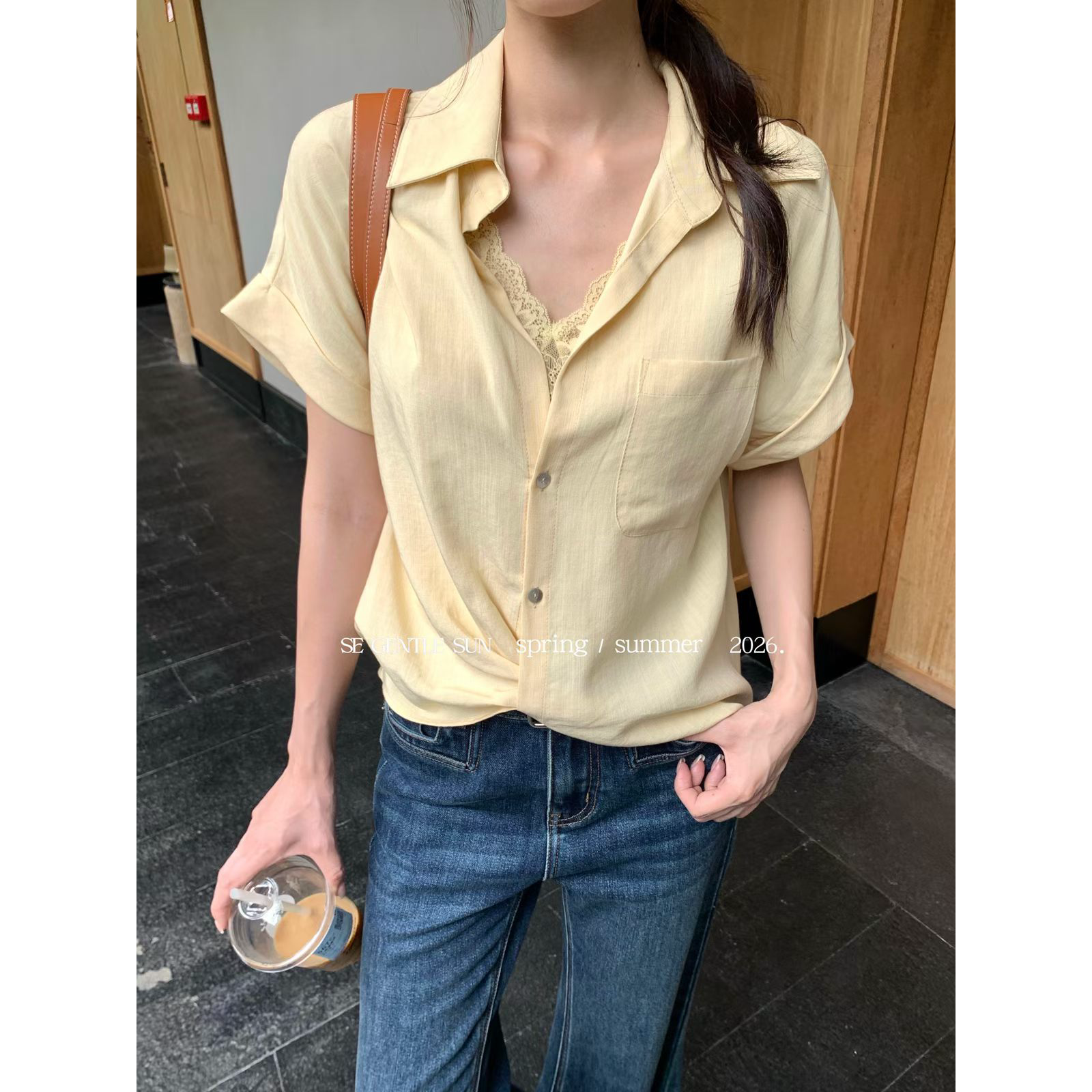 2026 여름 섹션 흔들다 칼라 페이크 레이어드 반팔 티셔츠 여성 순수한 욕망 레이스 조각 페이크 레이어드 작은 셔츠 맨위 여성