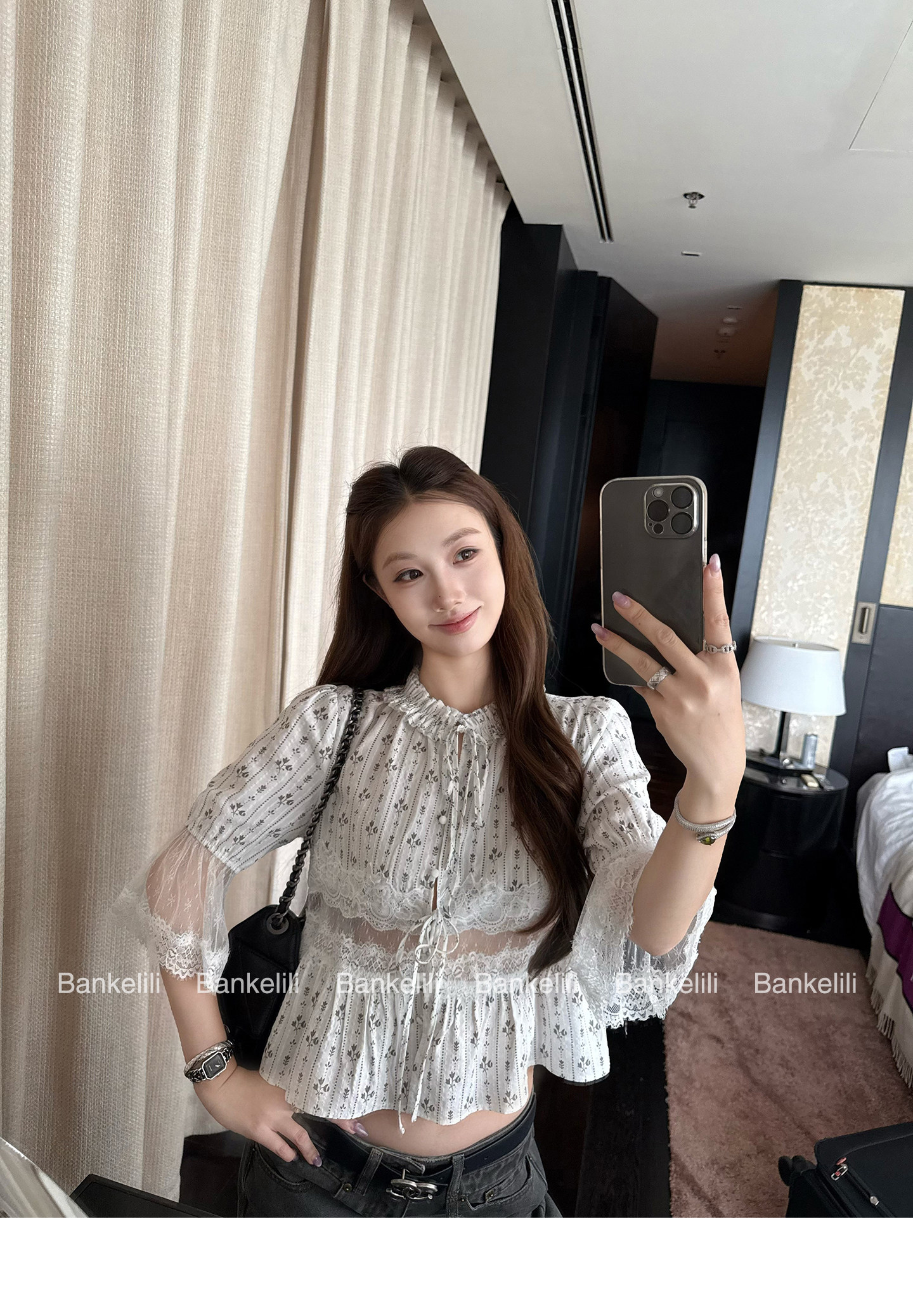 madofit Madou 로진 예 : 모 입소문 원사 실크 주간 실크 펄럭 이는 연꽃 잎 소매 레이스업 tee