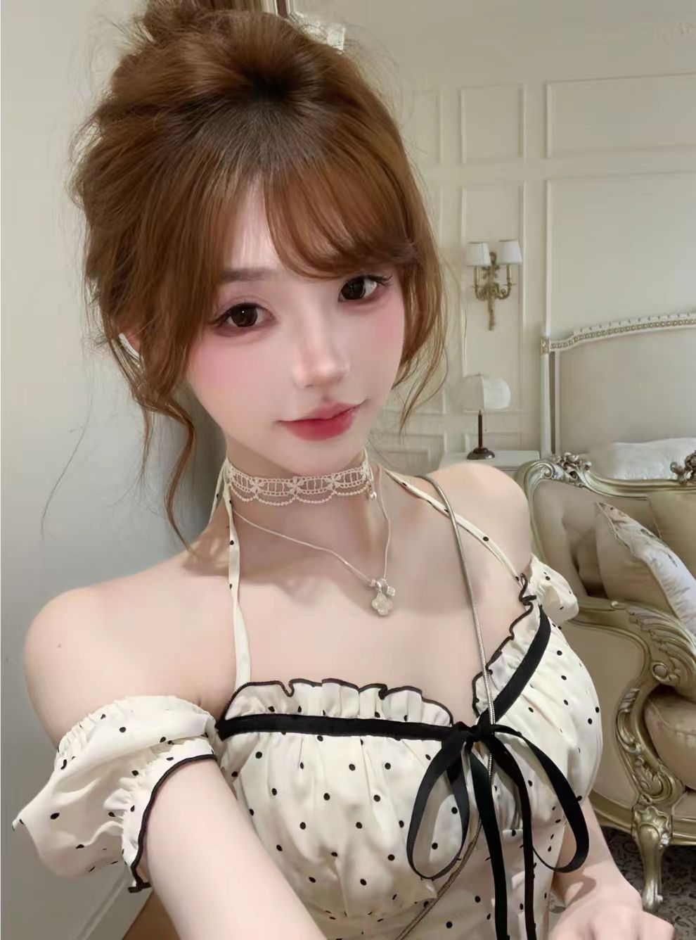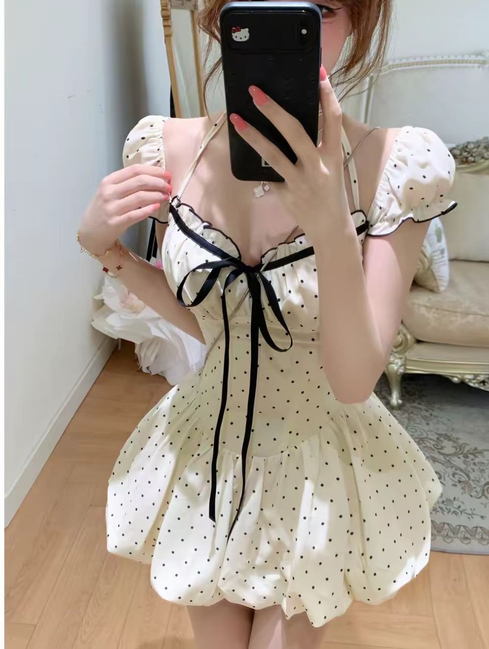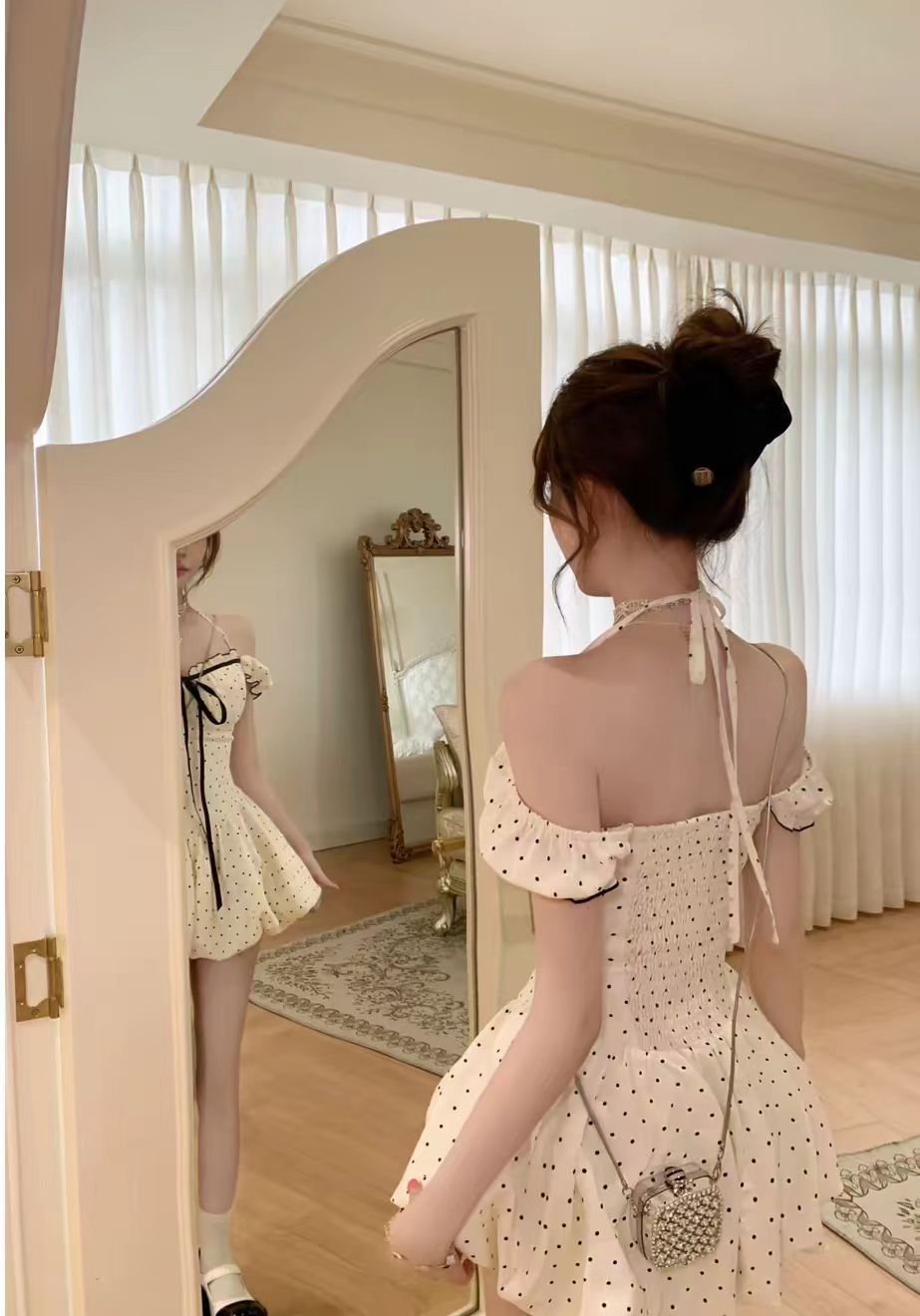 실사 디자인 센스 작은 키 화이트 도트 무늬 드레스 고급 센스 퍼프 미니 스커트 커플룩