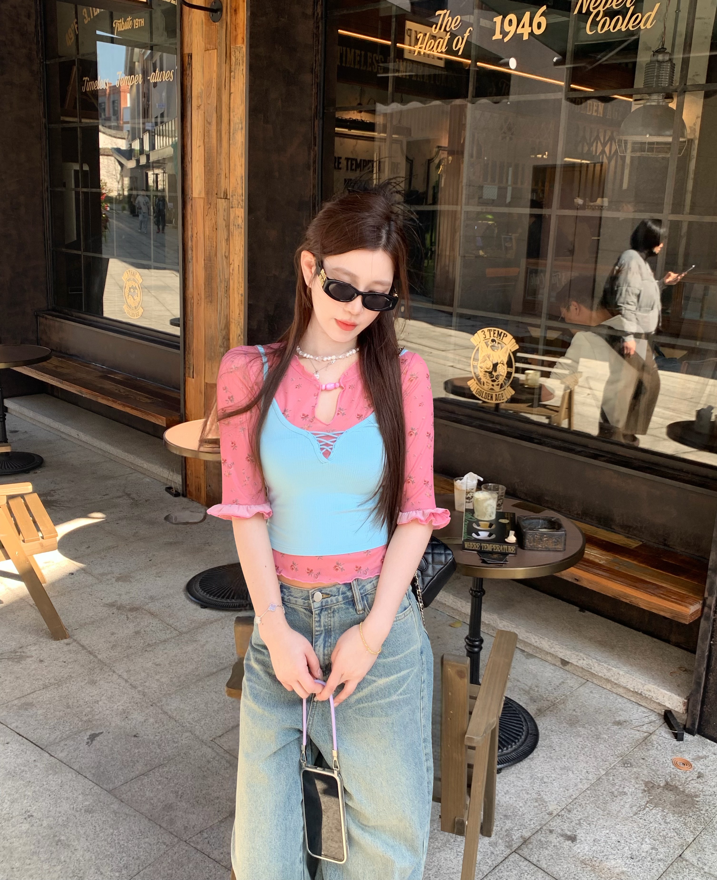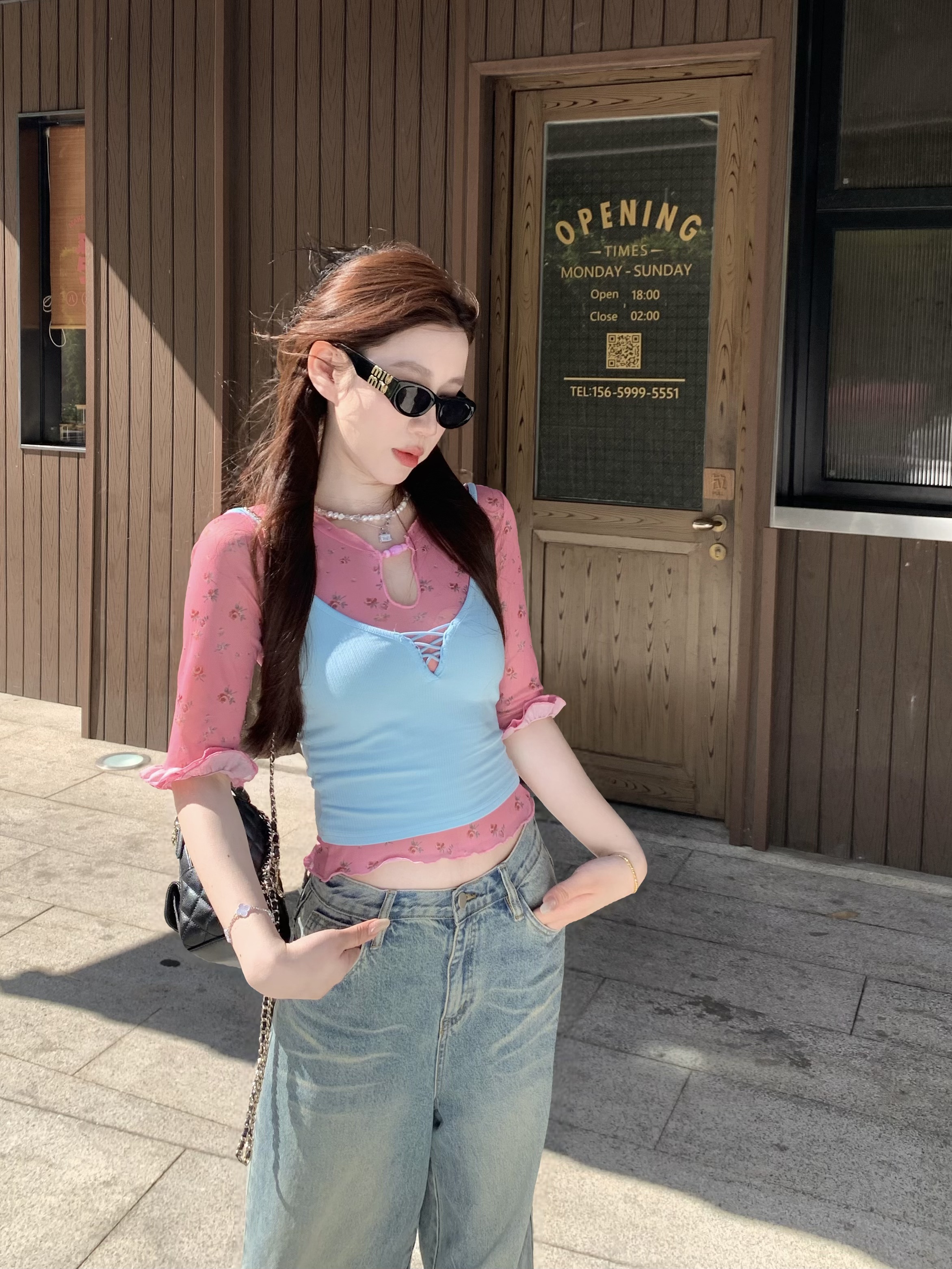 실사 정가 V넥 비틀림 민소매 맨위 여성 여름 외출용 자수 허리 수축 슬림해 보이는 행침 목 작은 셔츠 조끼 여성