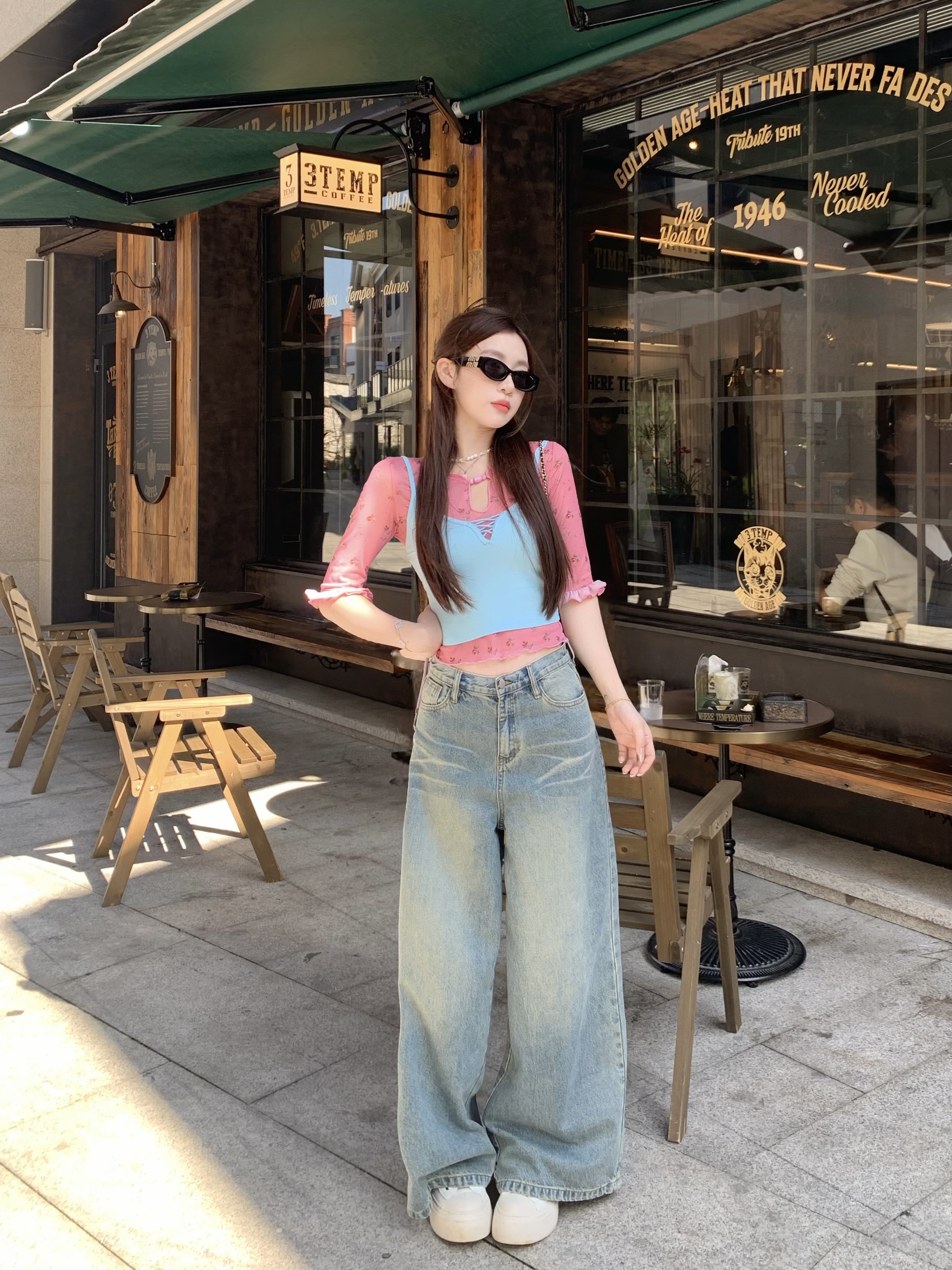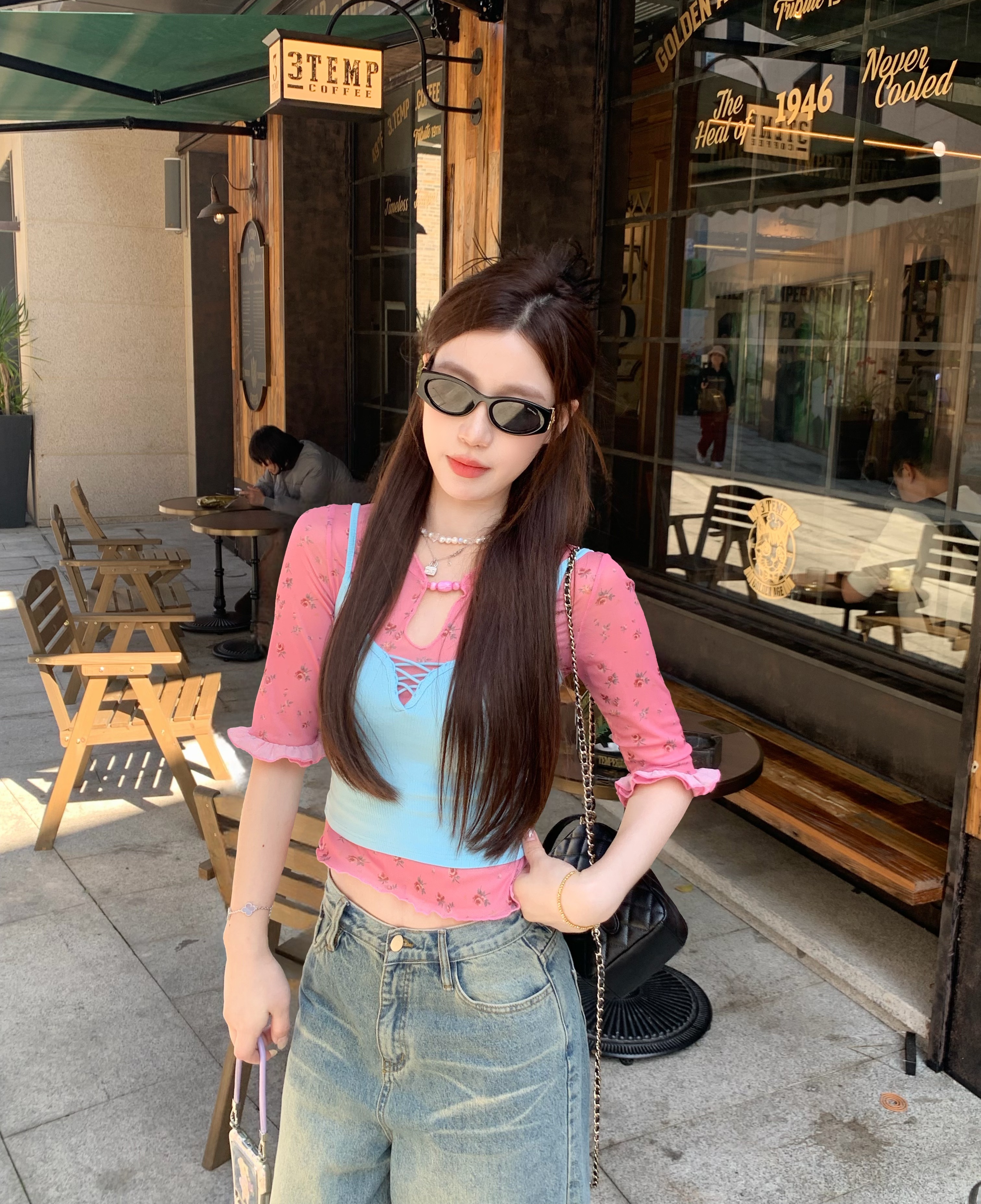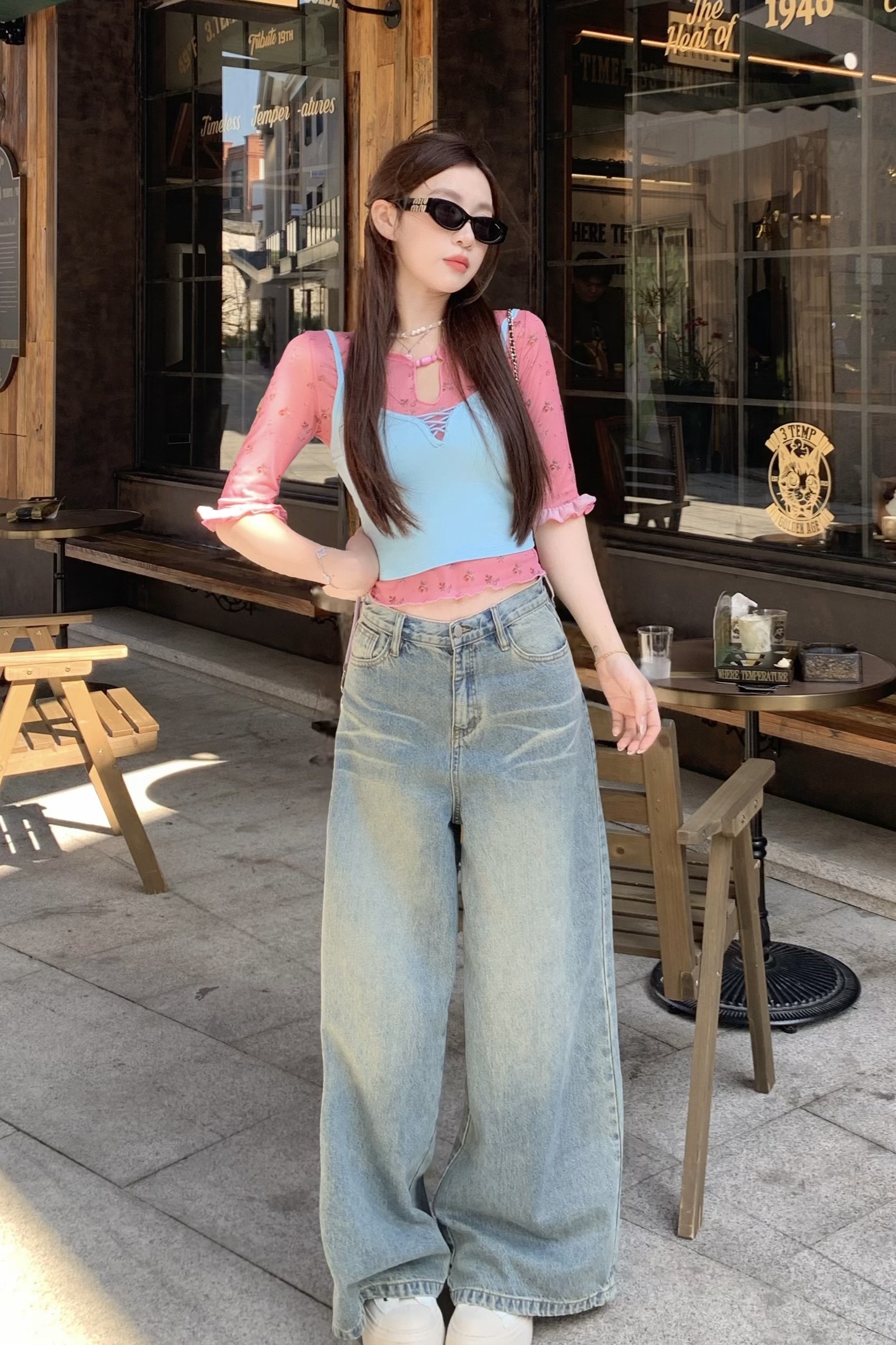 실사 정가 몸매 가꾸기 슬림해 보이는 긍정적 인 어깨 반팔 티셔츠 레트로 프린트 롱 스커트 레이스업 하이웨이스트 슬림해 보이는 반신 스커트