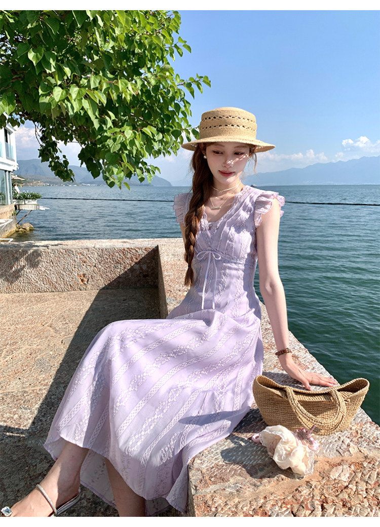 초기 꿈 pokemeng 정향 재스민 자카드 프랑스식 거품 소매 허리 수축 드레스 롱 스커트 A라인 스커트 여성 여름