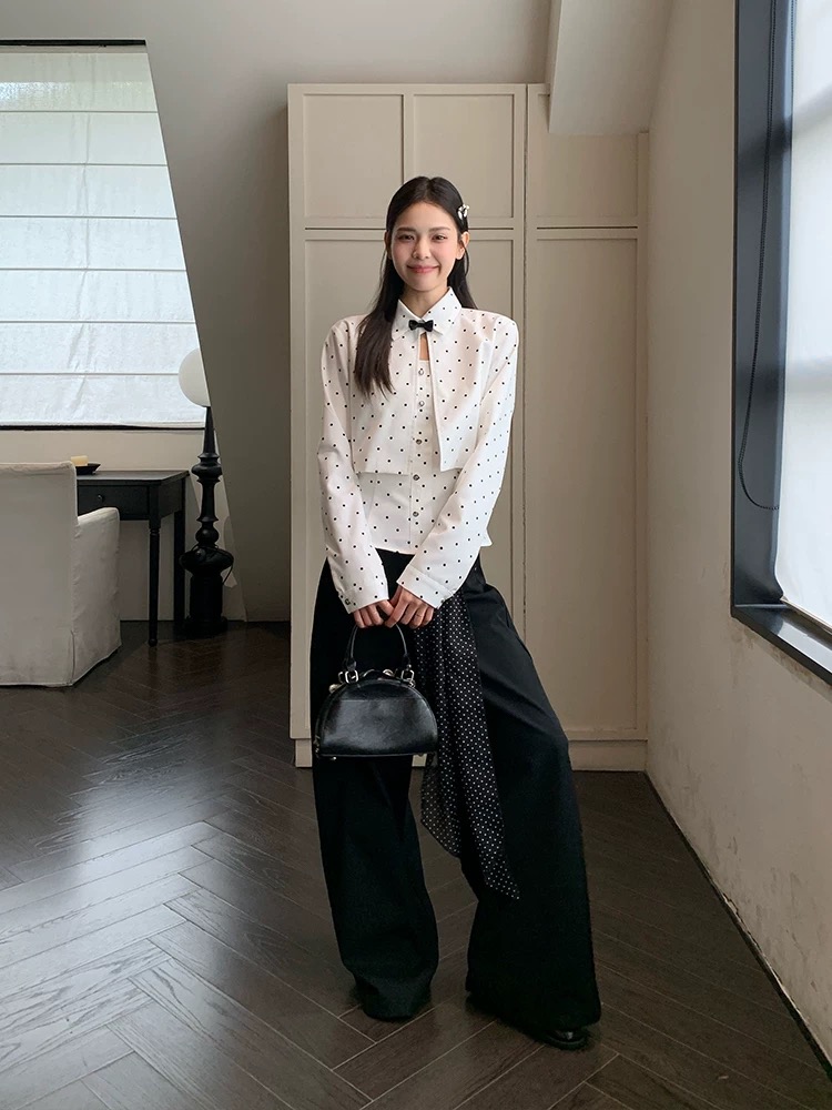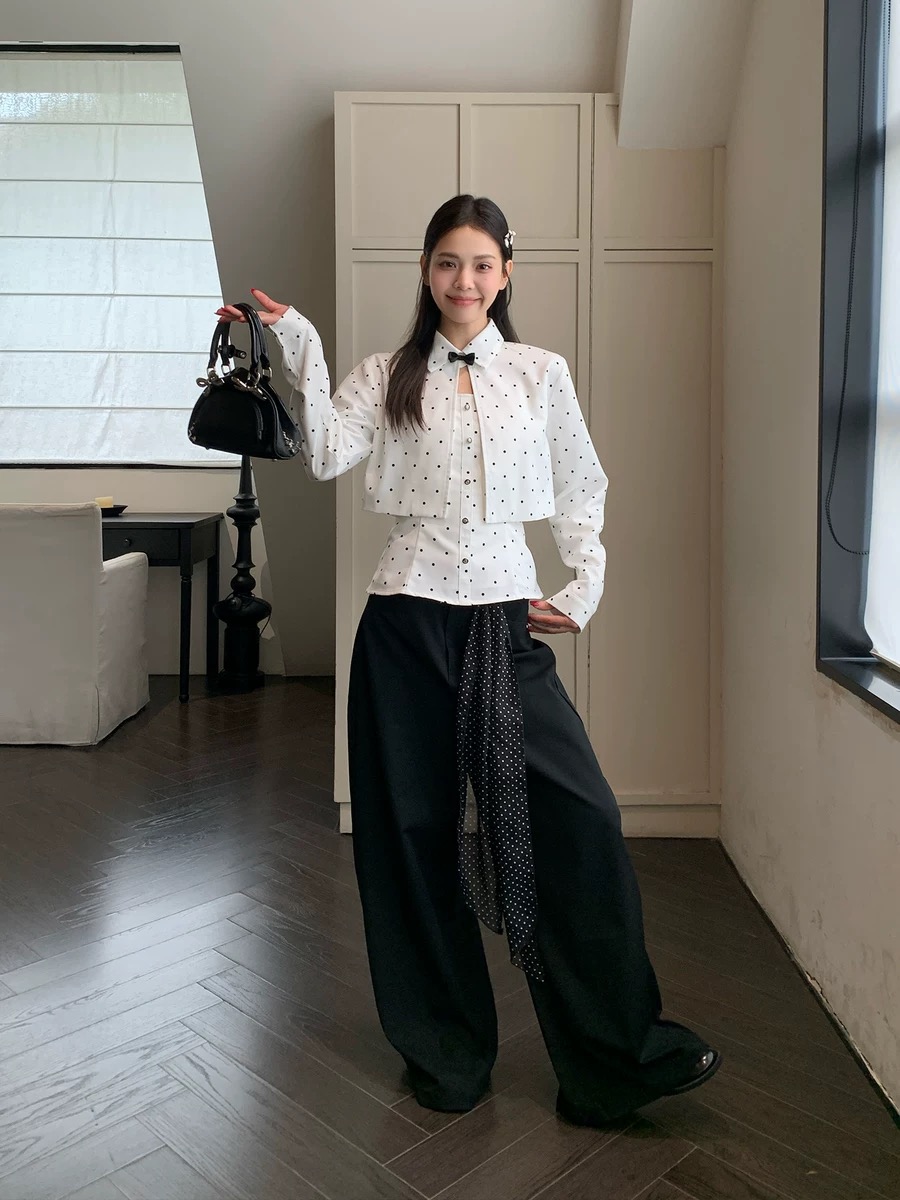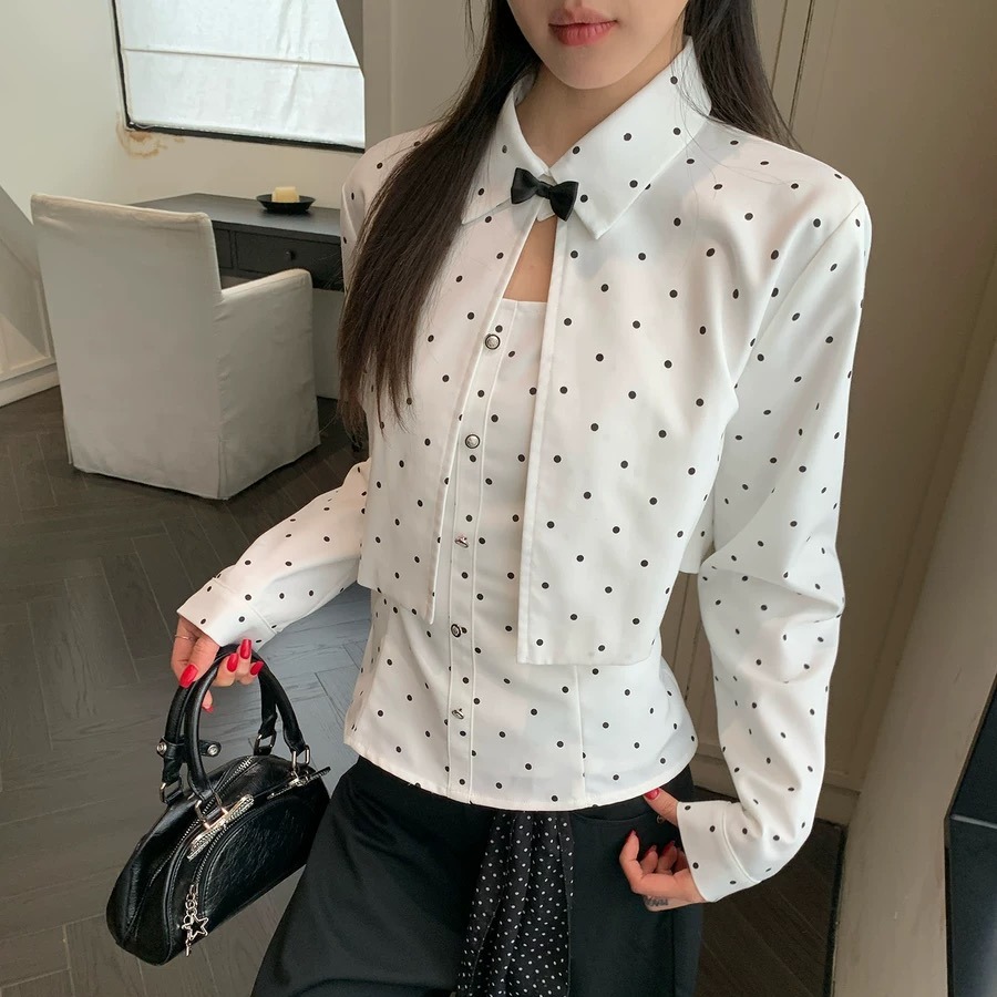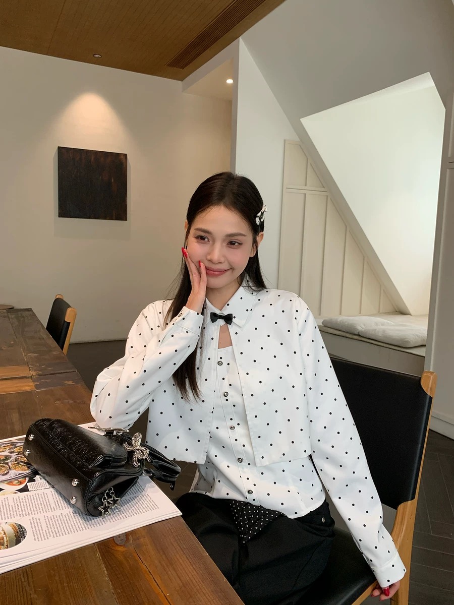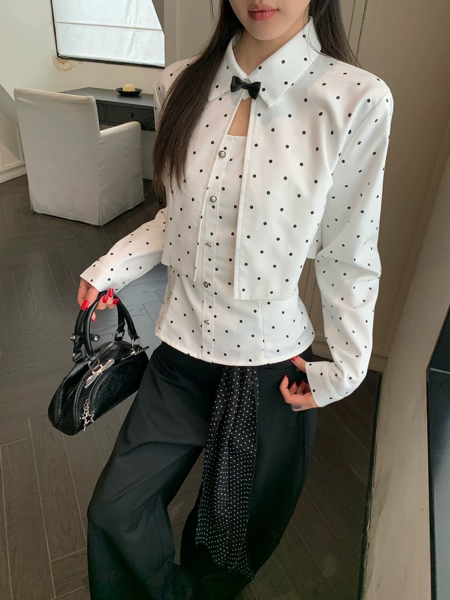 프랑스식 긴팔 여성 셔츠 2026 새로운 화이트 도트 무늬 리본 품격 맨위 이른 봄 분위기 센스 착용 가져 가라. 세트