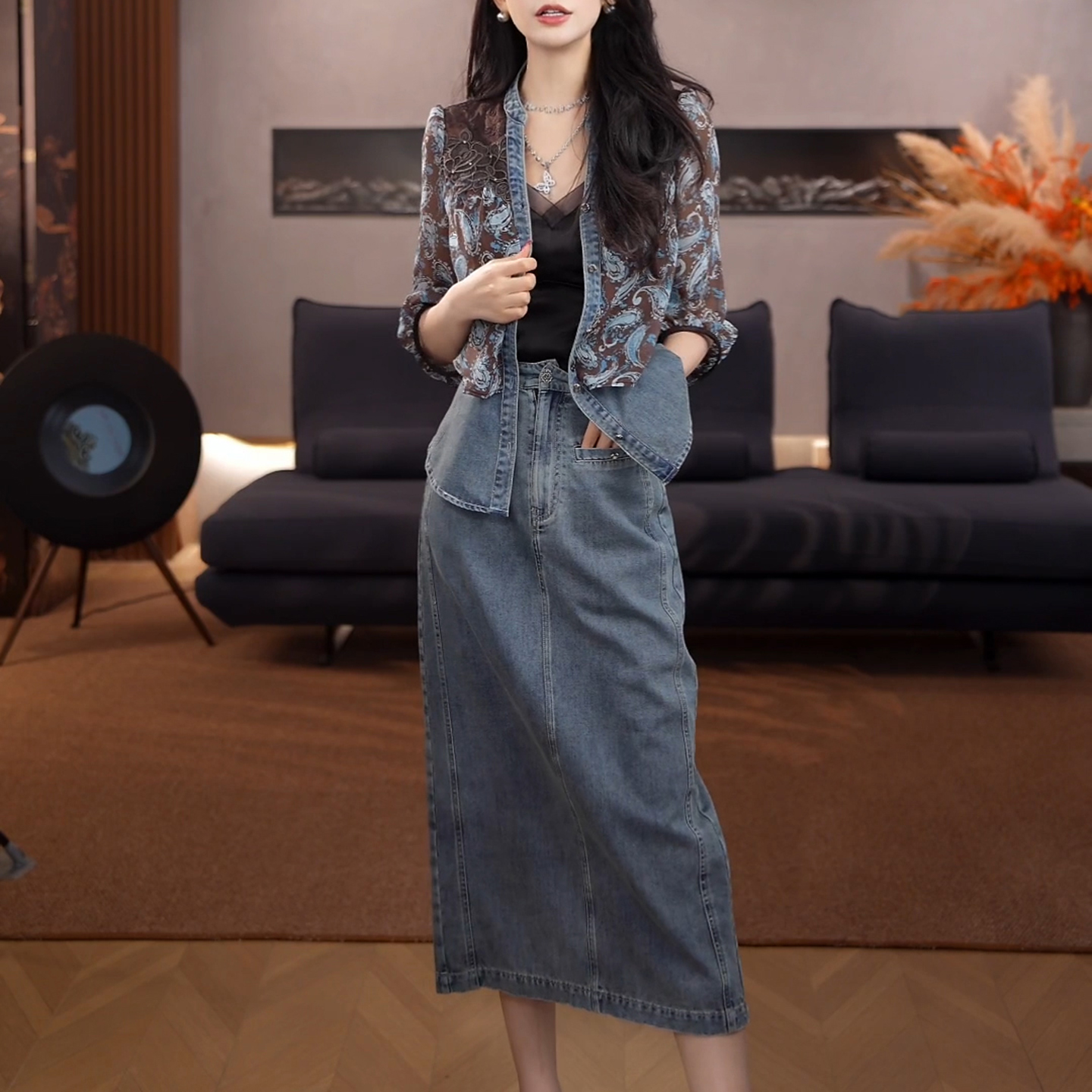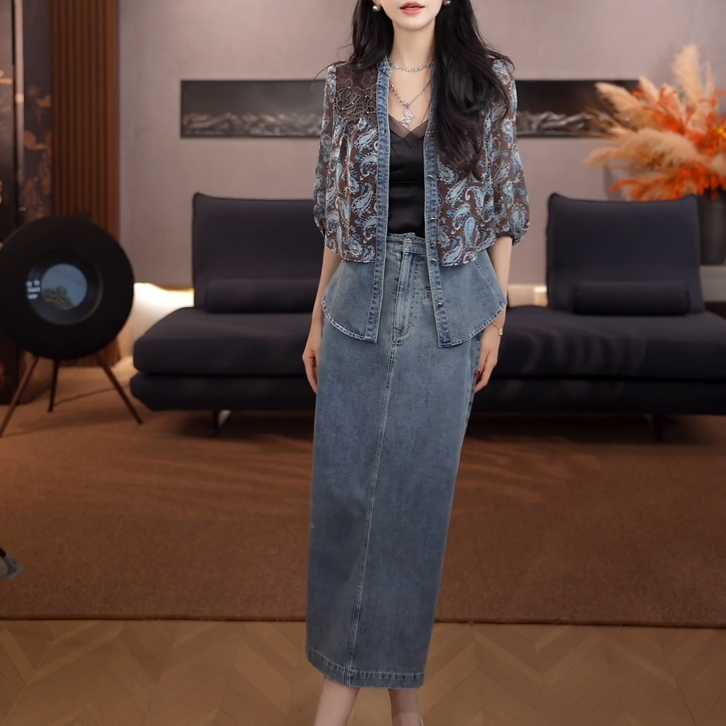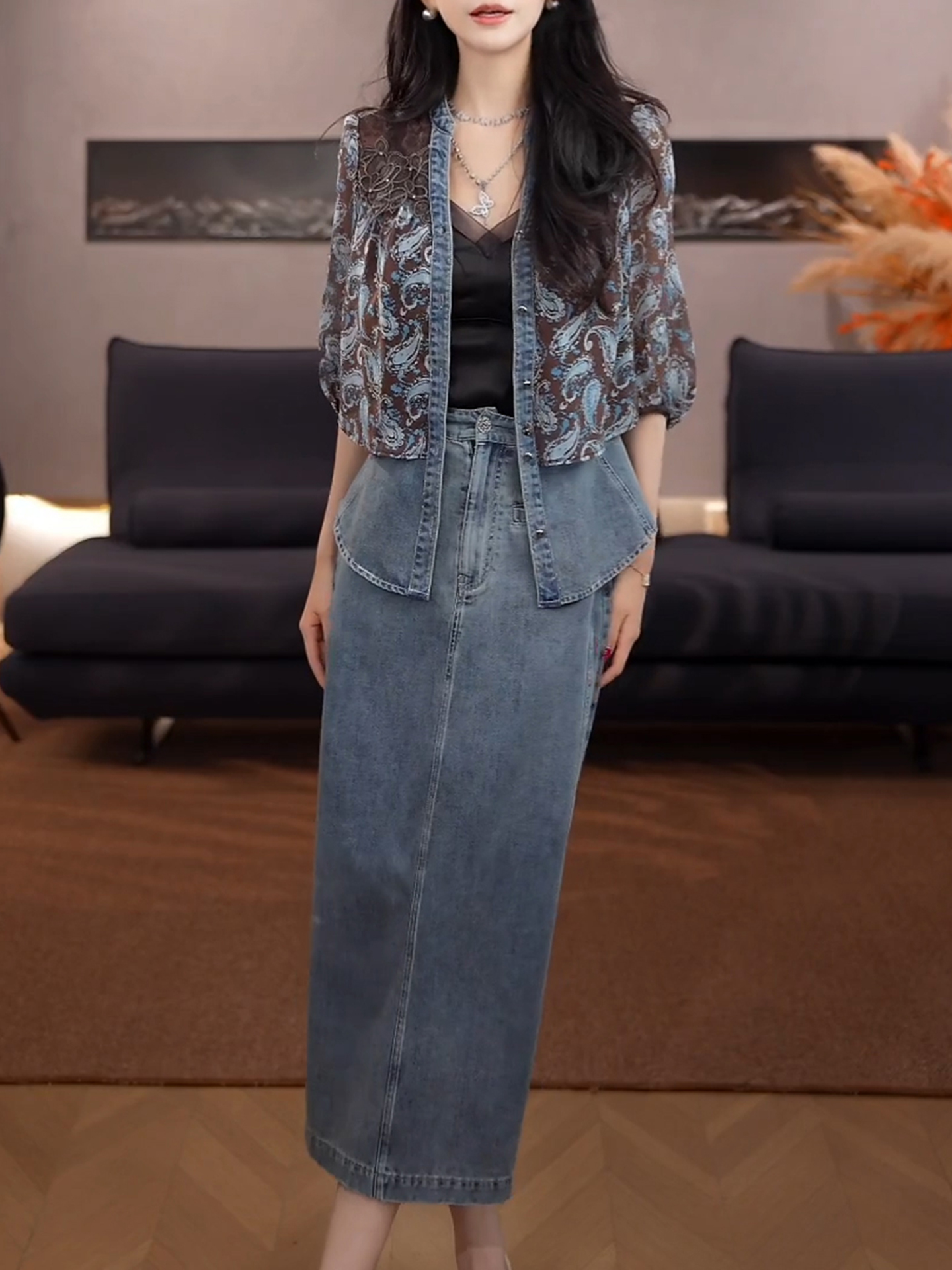 경관 그림 2026 여름 새로운 여성 의류 아름다운 패션 재킷 고급 센스 데님 반신 스커트 착용 가져 가라. 전체 집합