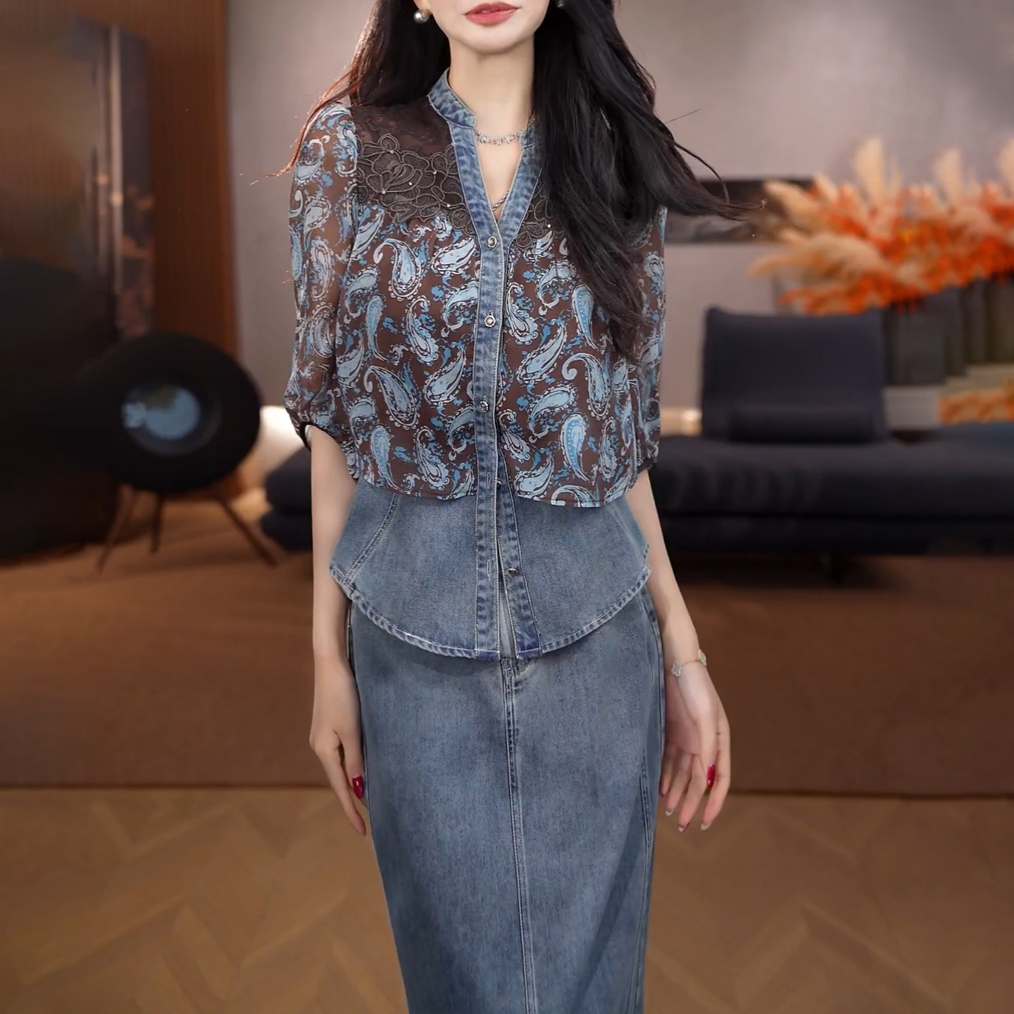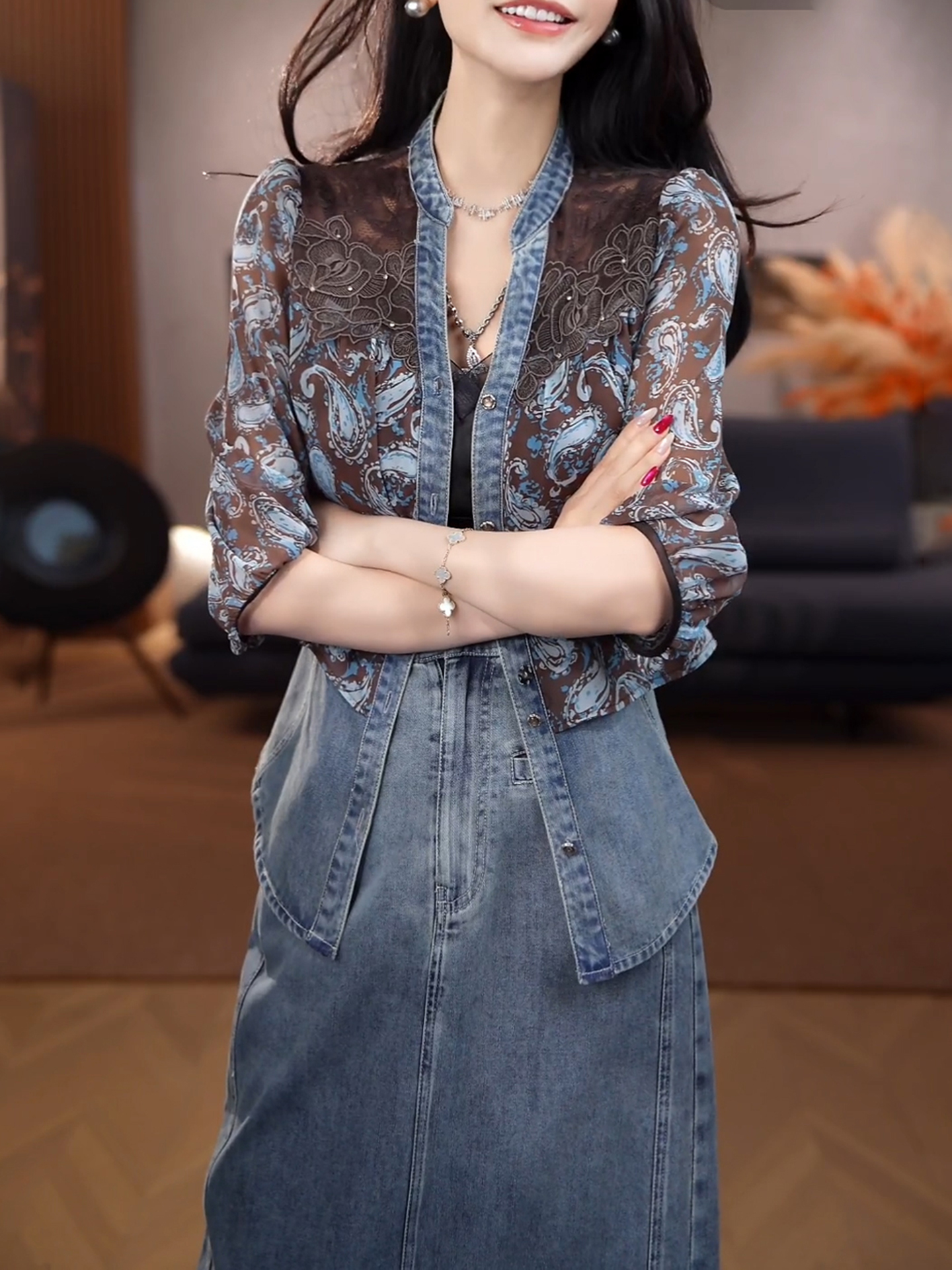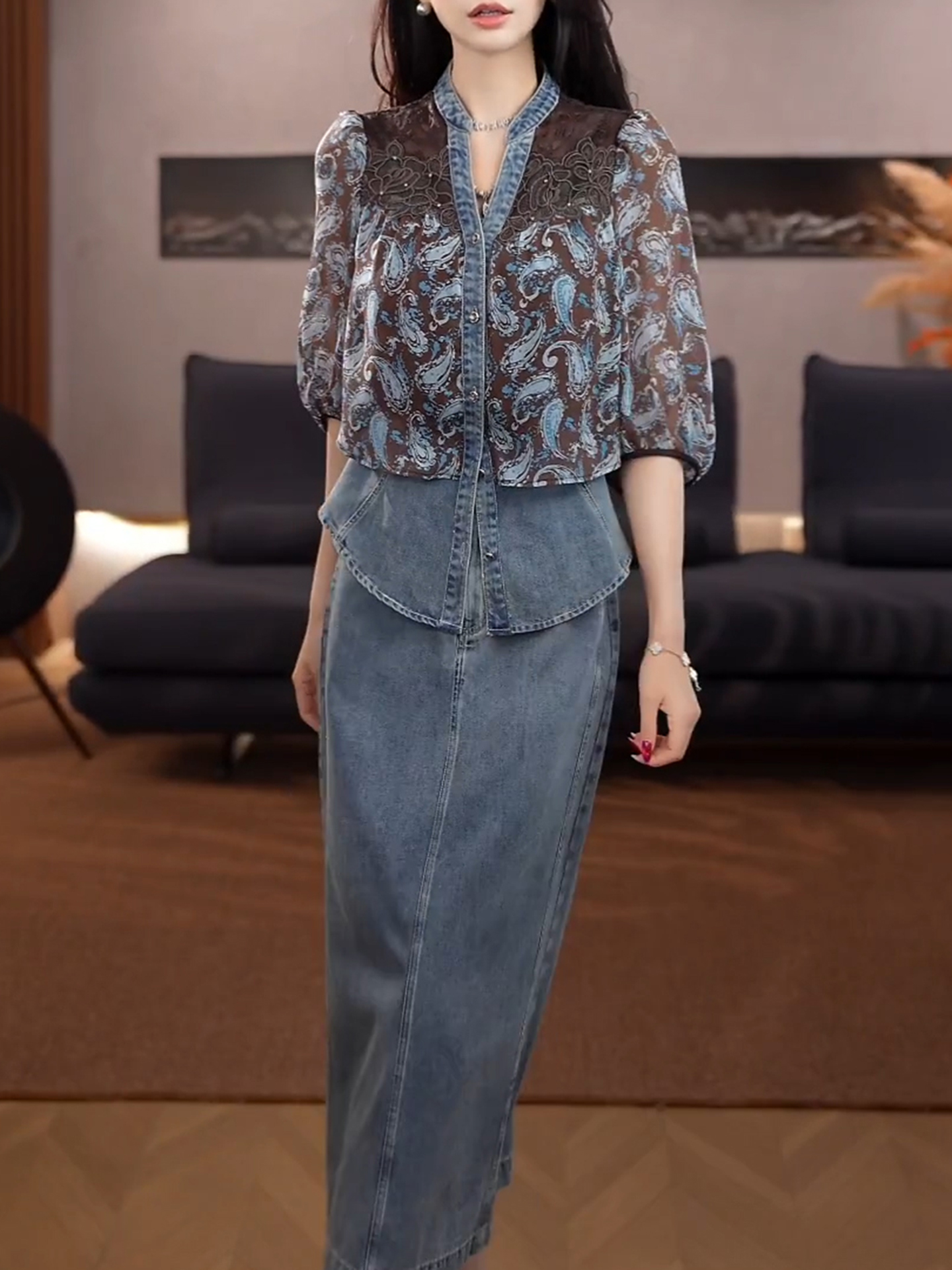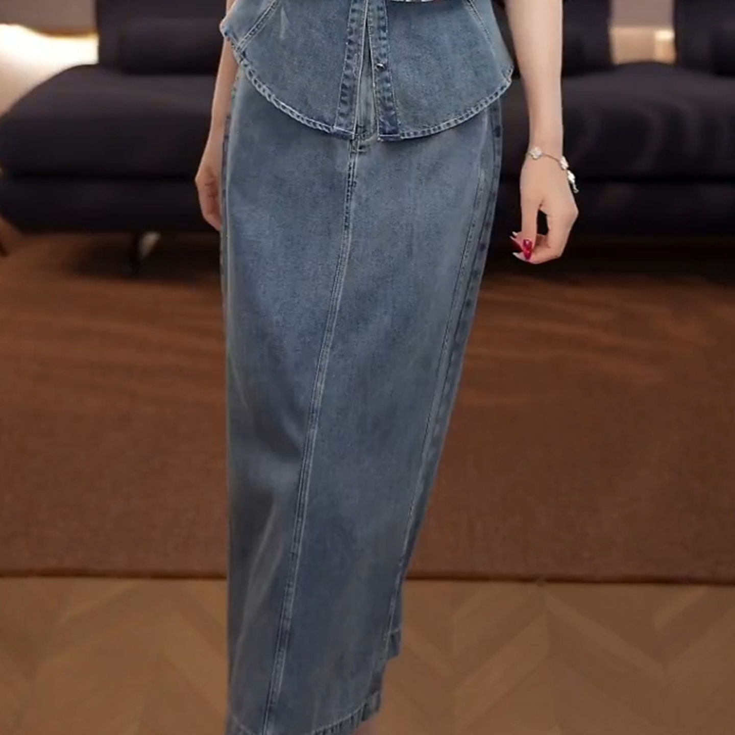 경관 그림 2026 여름 새로운 여성 의류 아름다운 패션 재킷 고급 센스 데님 반신 스커트 착용 가져 가라. 전체 집합