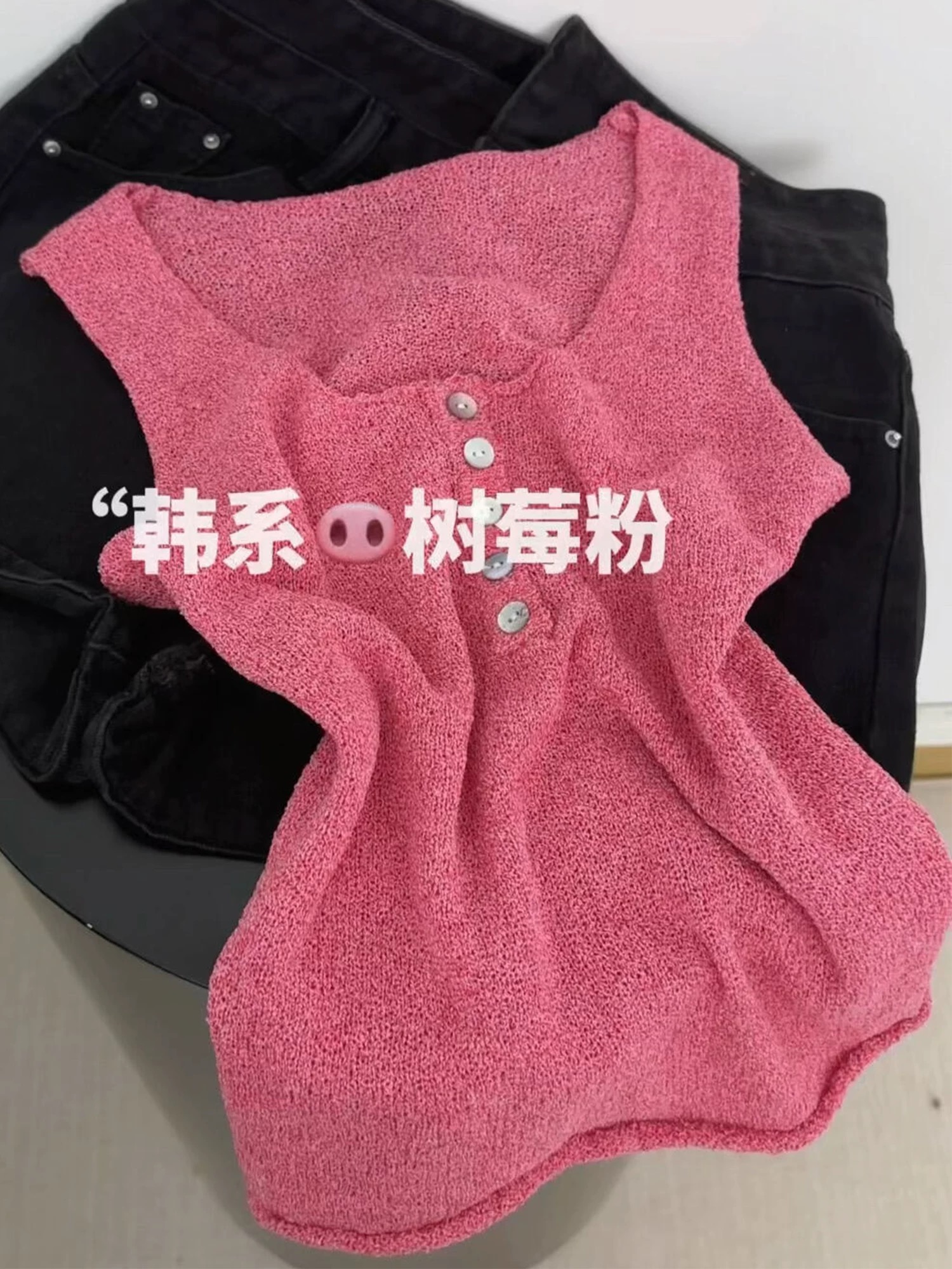 도파민 혼합 색상 실 조끼 여성 여름 새로운 외출용 몸매 가꾸기 하프 버클 헨리 칼라 민소매 니트 맨위