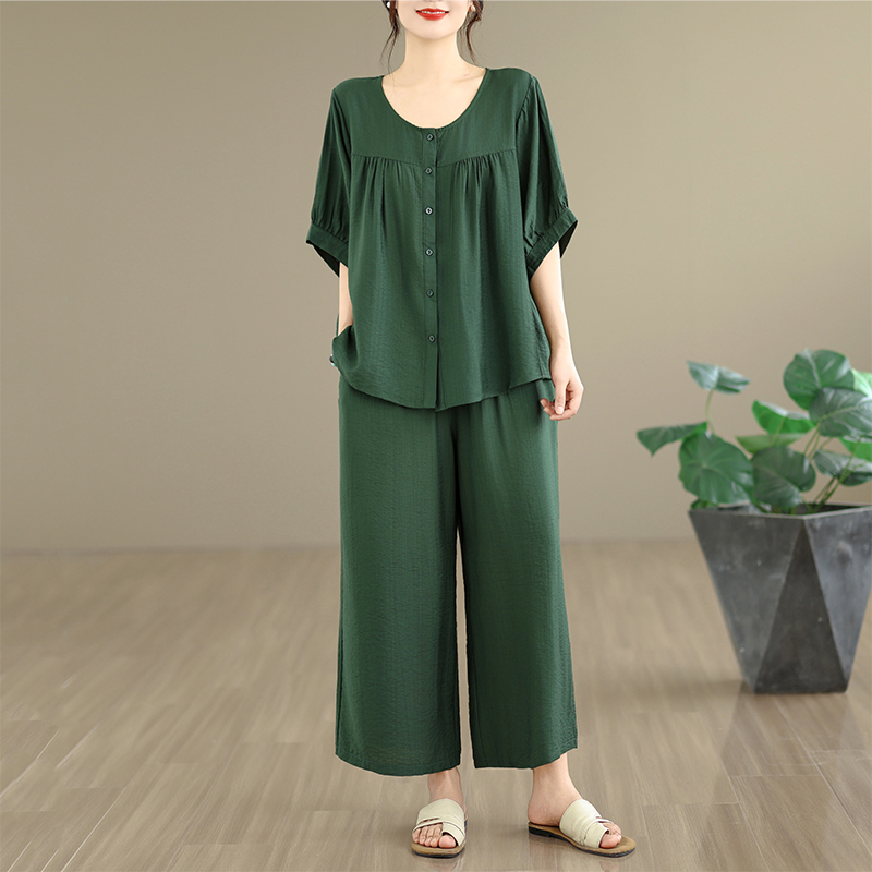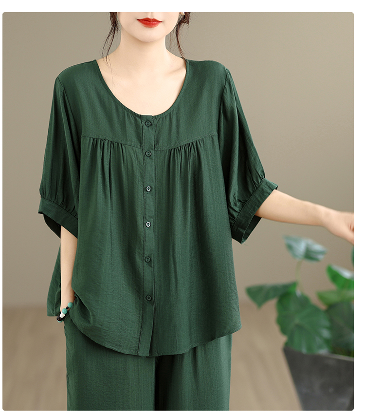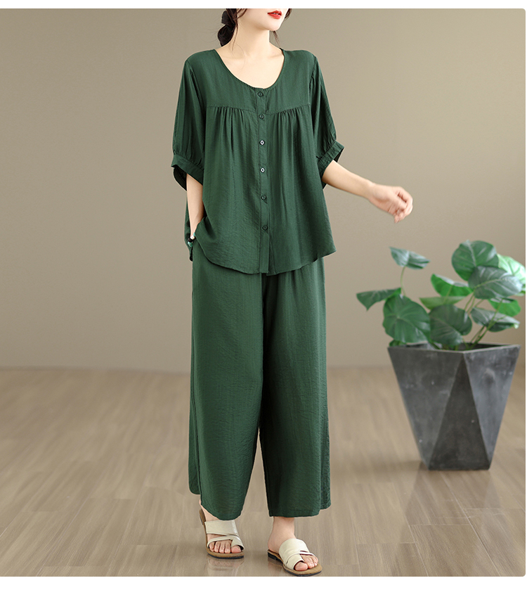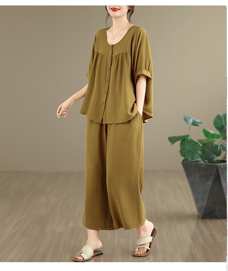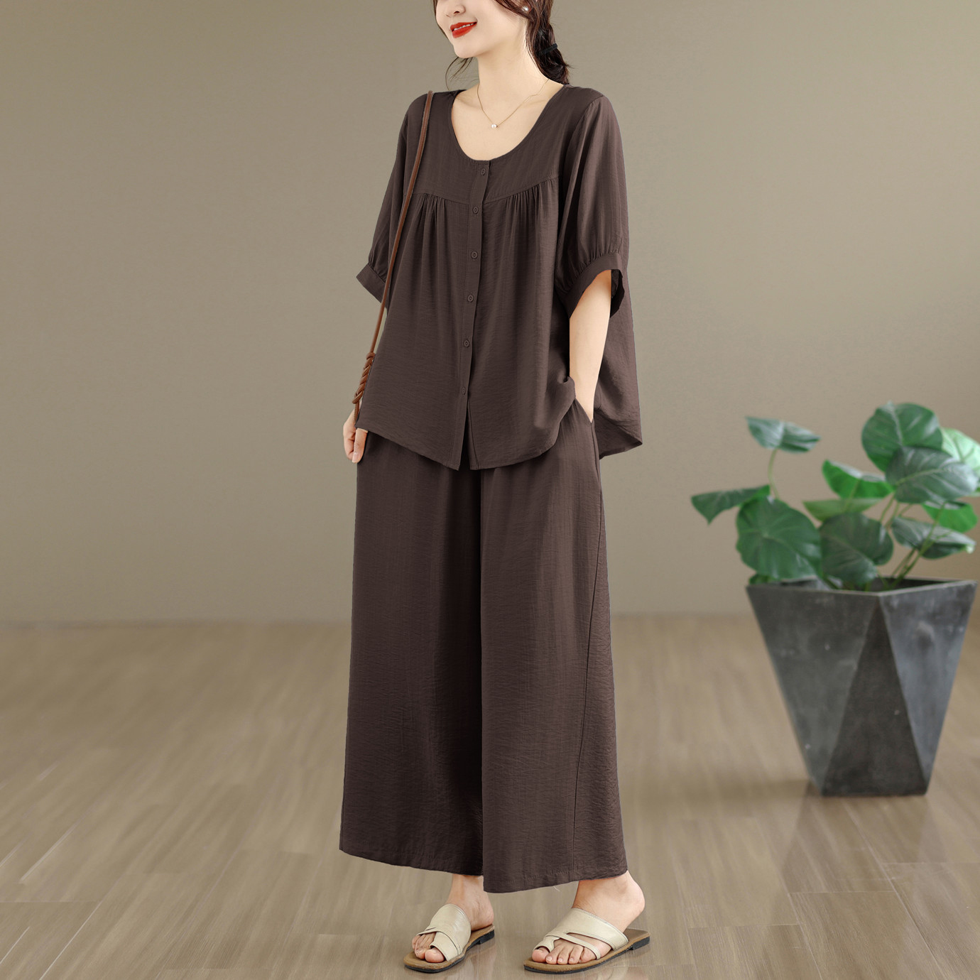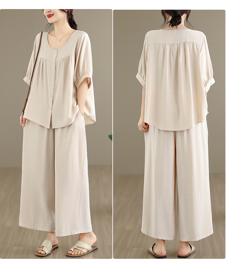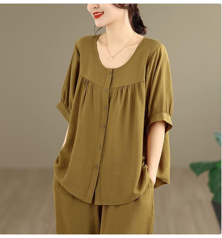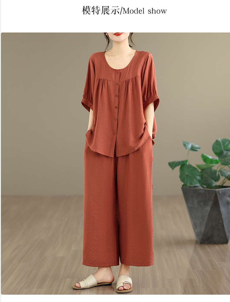 실사 2026 한국 스타일 빅 사이즈 슬림해 보이는 단색 문예 레트로 중간 소매 셔츠 루즈핏 하렘 바지 여름 세트 여성