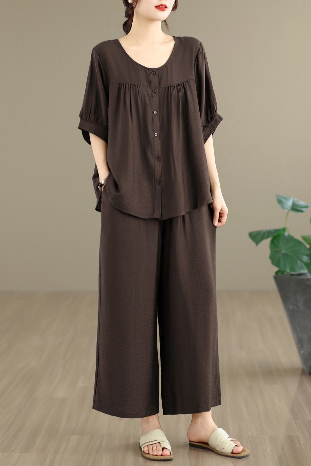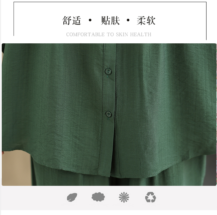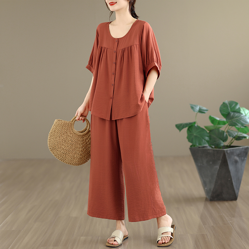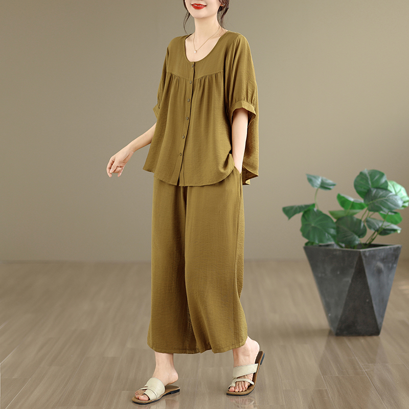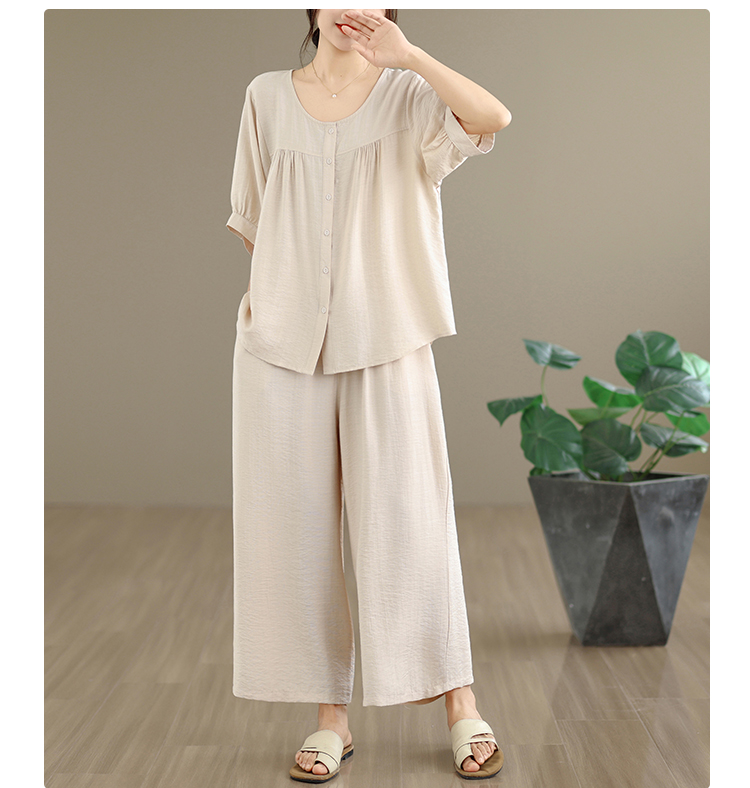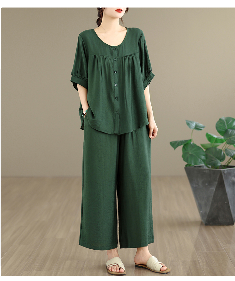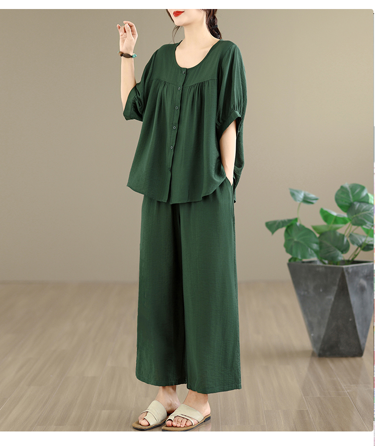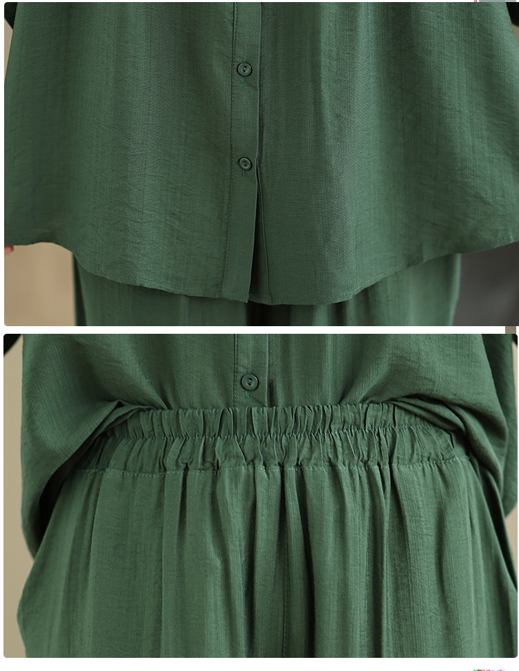 실사 2026 한국 스타일 빅 사이즈 슬림해 보이는 단색 문예 레트로 중간 소매 셔츠 루즈핏 하렘 바지 여름 세트 여성