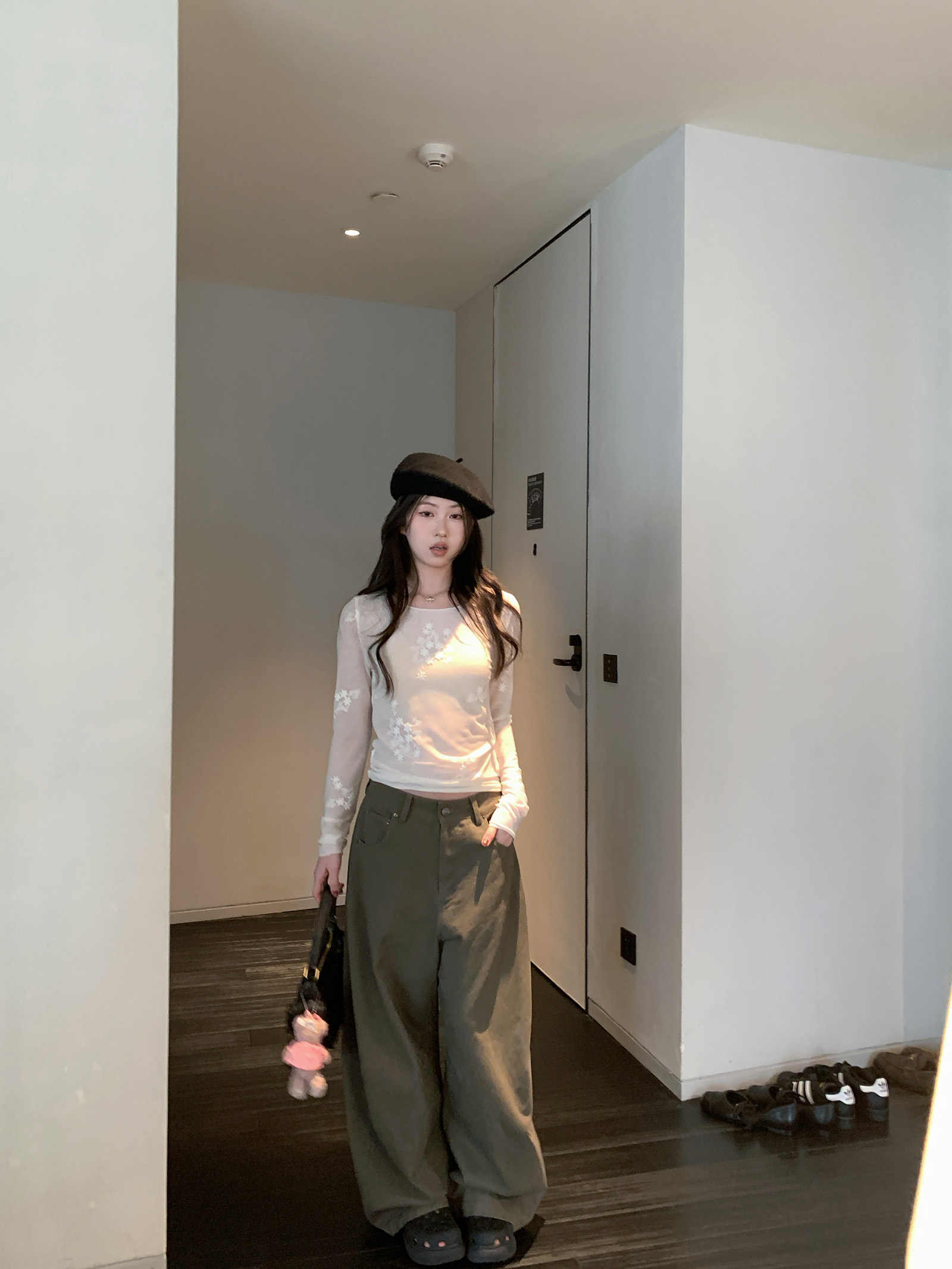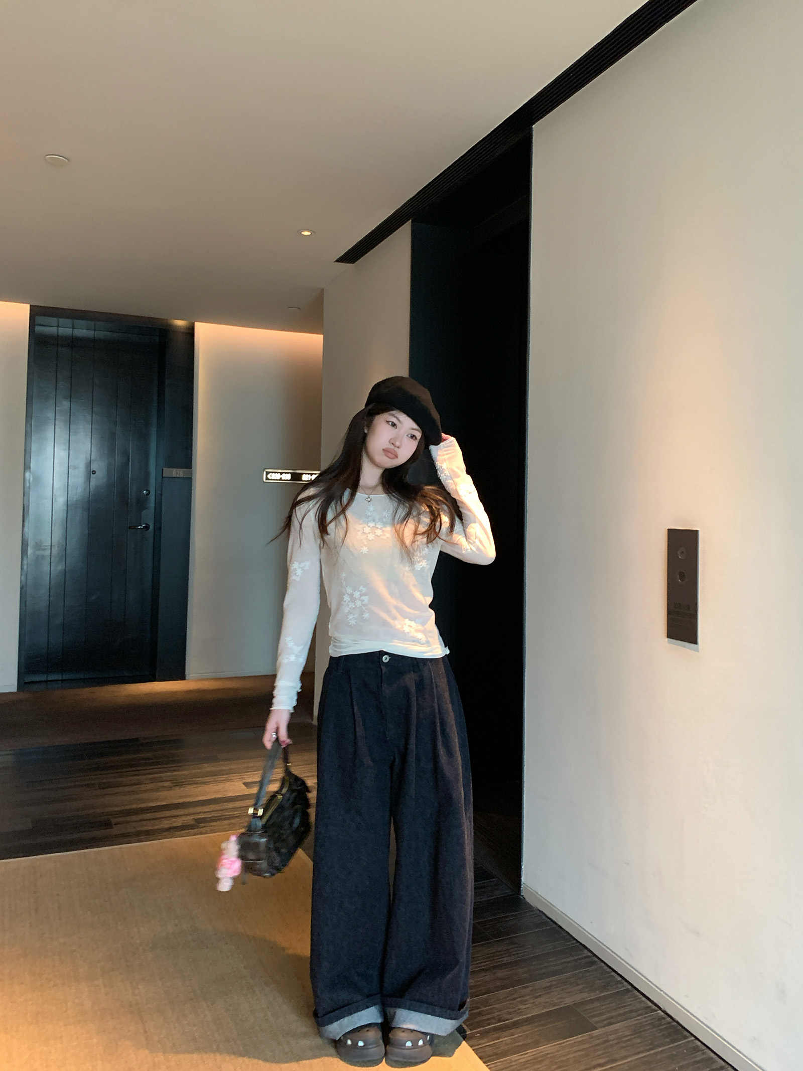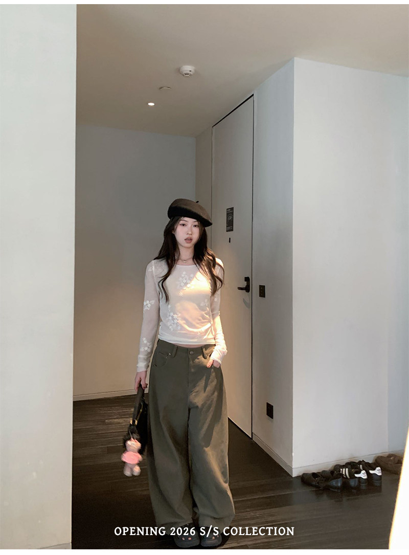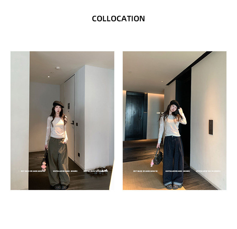 실사 2026 년 레트로 라미 작은 스탠드 칼라 자수 맨위 넓은 다리 길이 바지 투피스 세트
