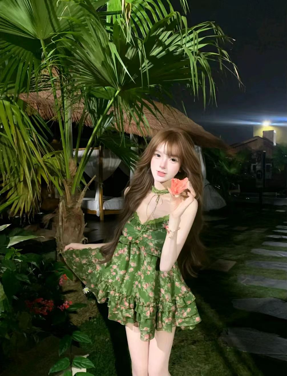무쯔리 목자이 맑은 주간 남자 와일드 휴가 느슨함 바람 프릴 슬립 드레스 허리 수축 자르기 분위기 센스 롱 스커트