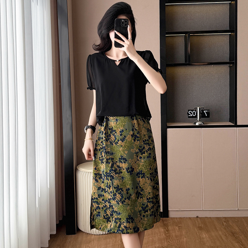 가짜 2 피스 슈트 슬림 피트 슬림 쉬폰 인쇄 짧은 소매 드레스 여름 새로운 큰 사이즈 여성 의류 지방 mm 중간 및 긴 섹션
