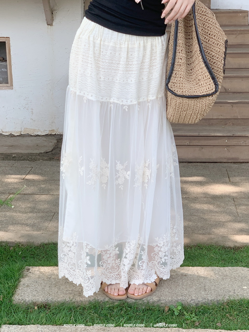 실사 녹색 니트 라운드 넥 루즈핏 맨위 루즈핏 레이스 미니멀리즘 느긋한 반신 스커트 롱 스커트