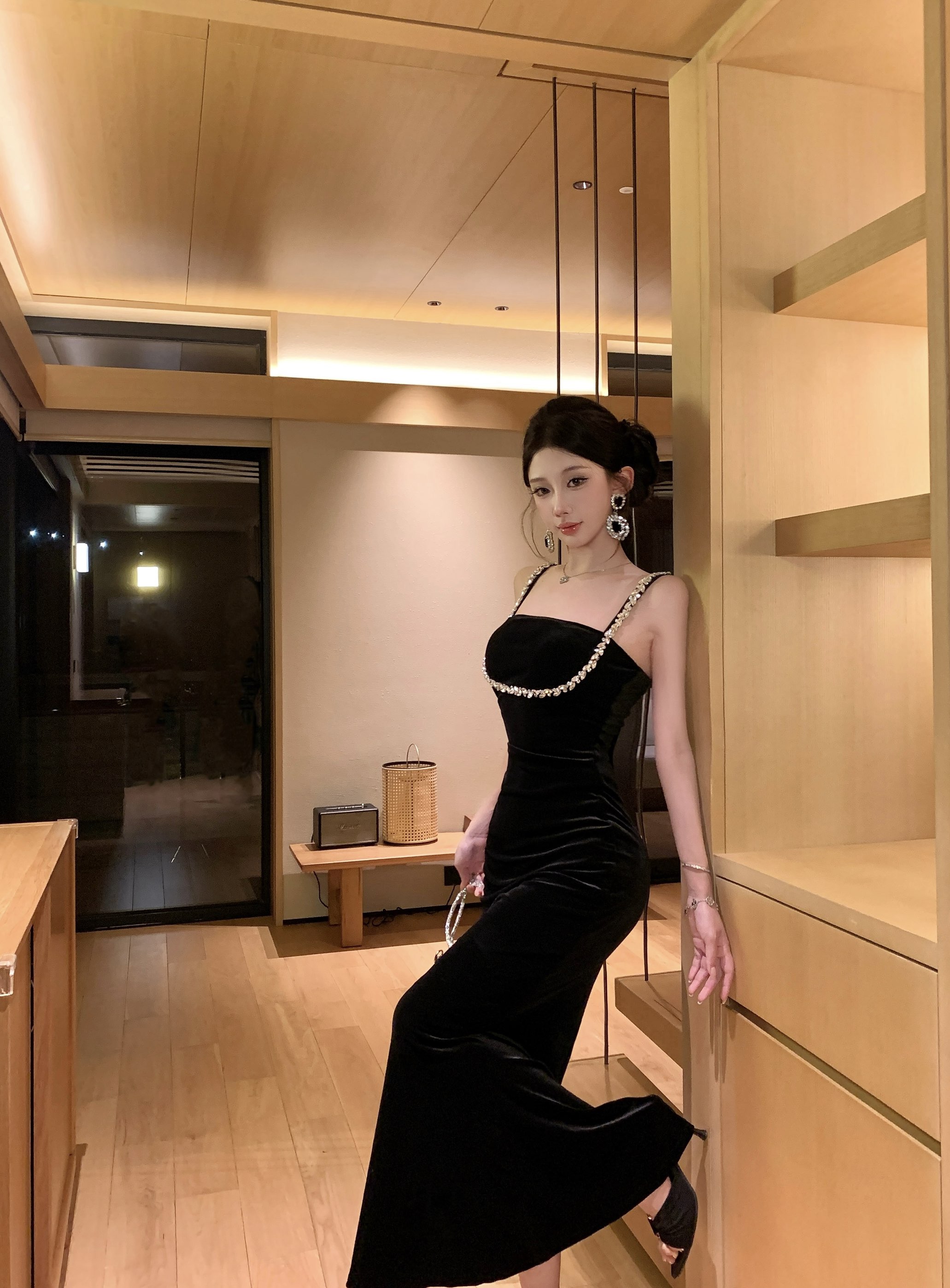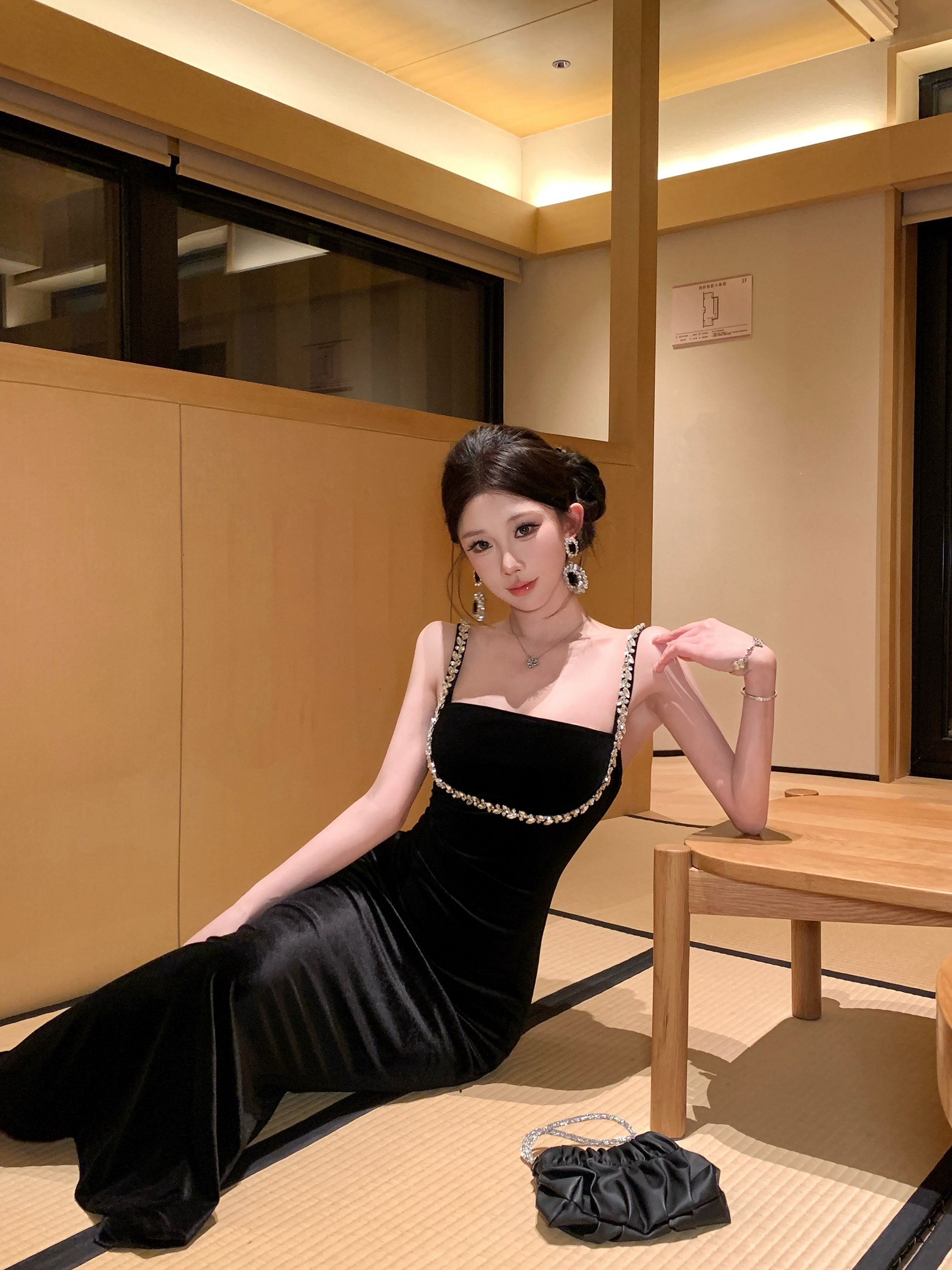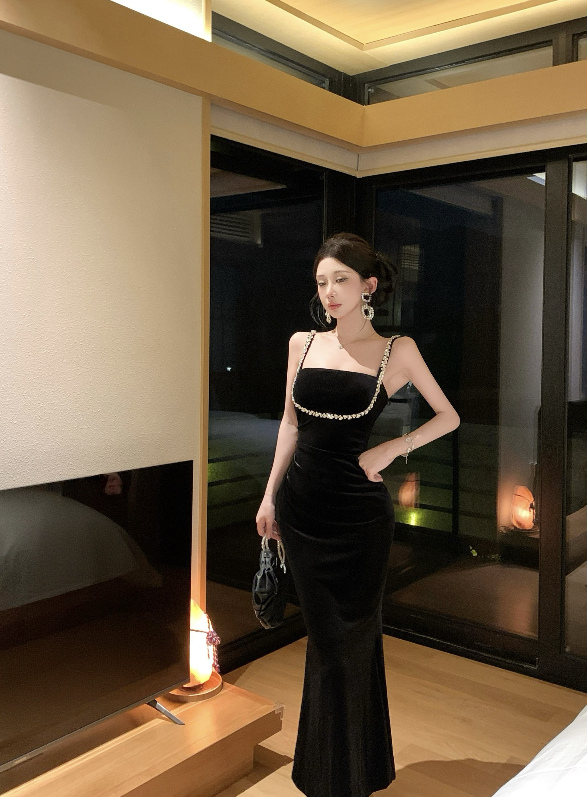 실사 정가 고급 센스 슬립 스팽글 패치워크 이브닝 드레스