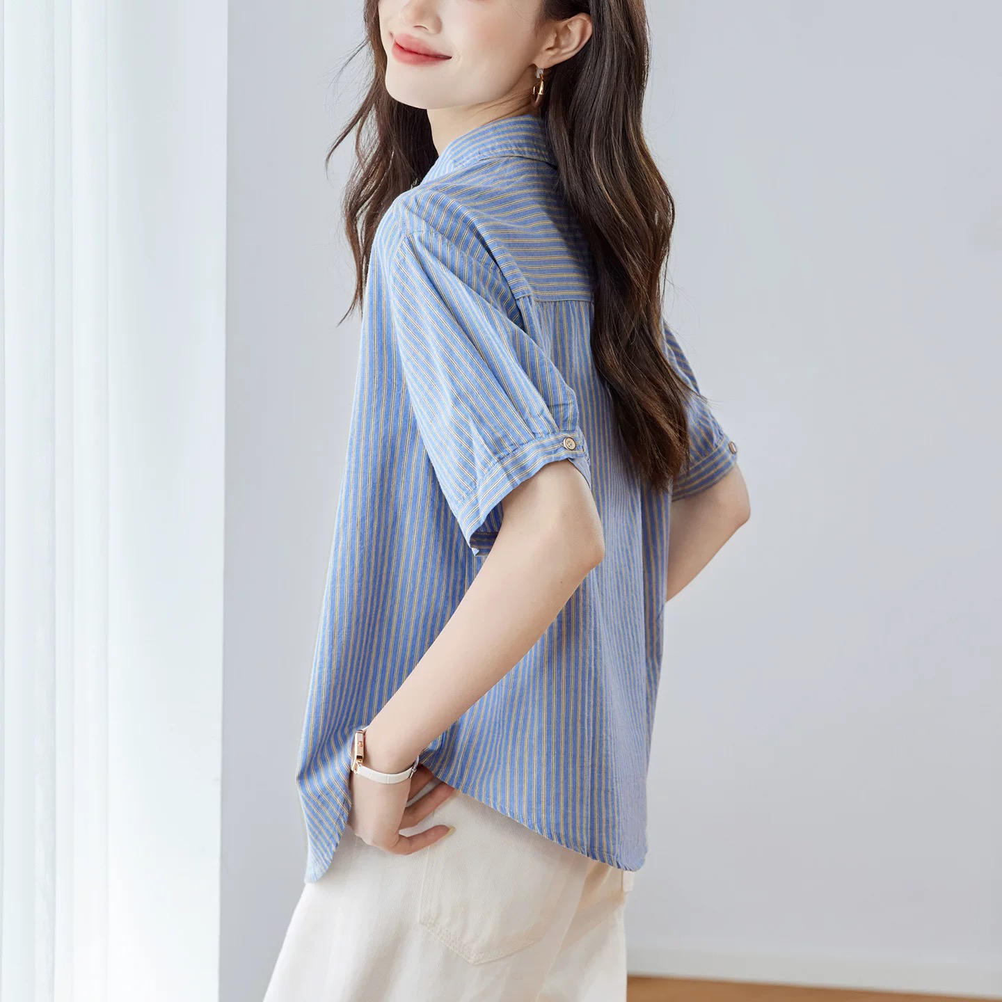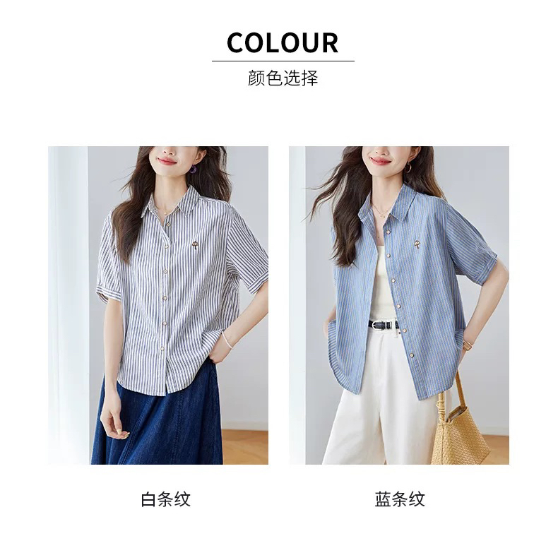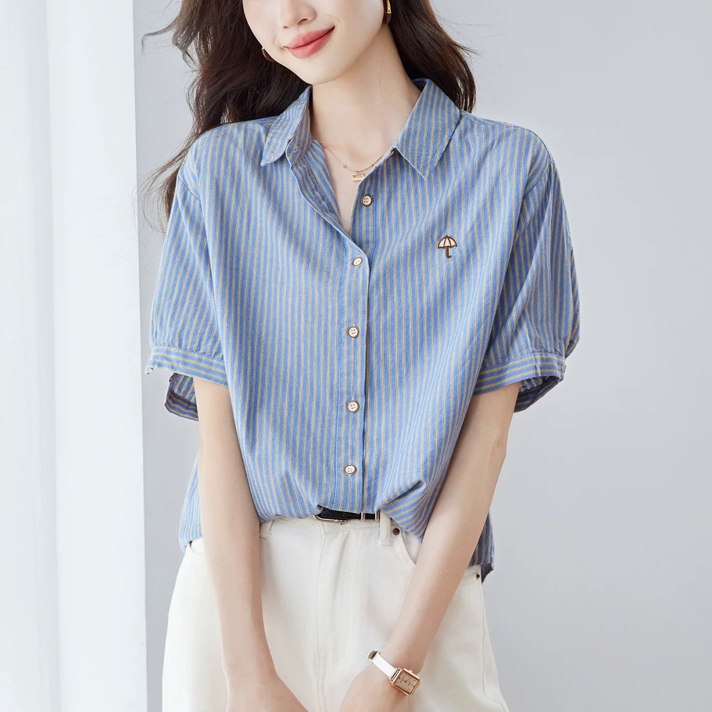 순면 스트라이프 반팔 셔츠 여성 2026 새로운 여름 루즈핏 표지 고기 셔츠 중간 소매 맨위 작은 셔츠